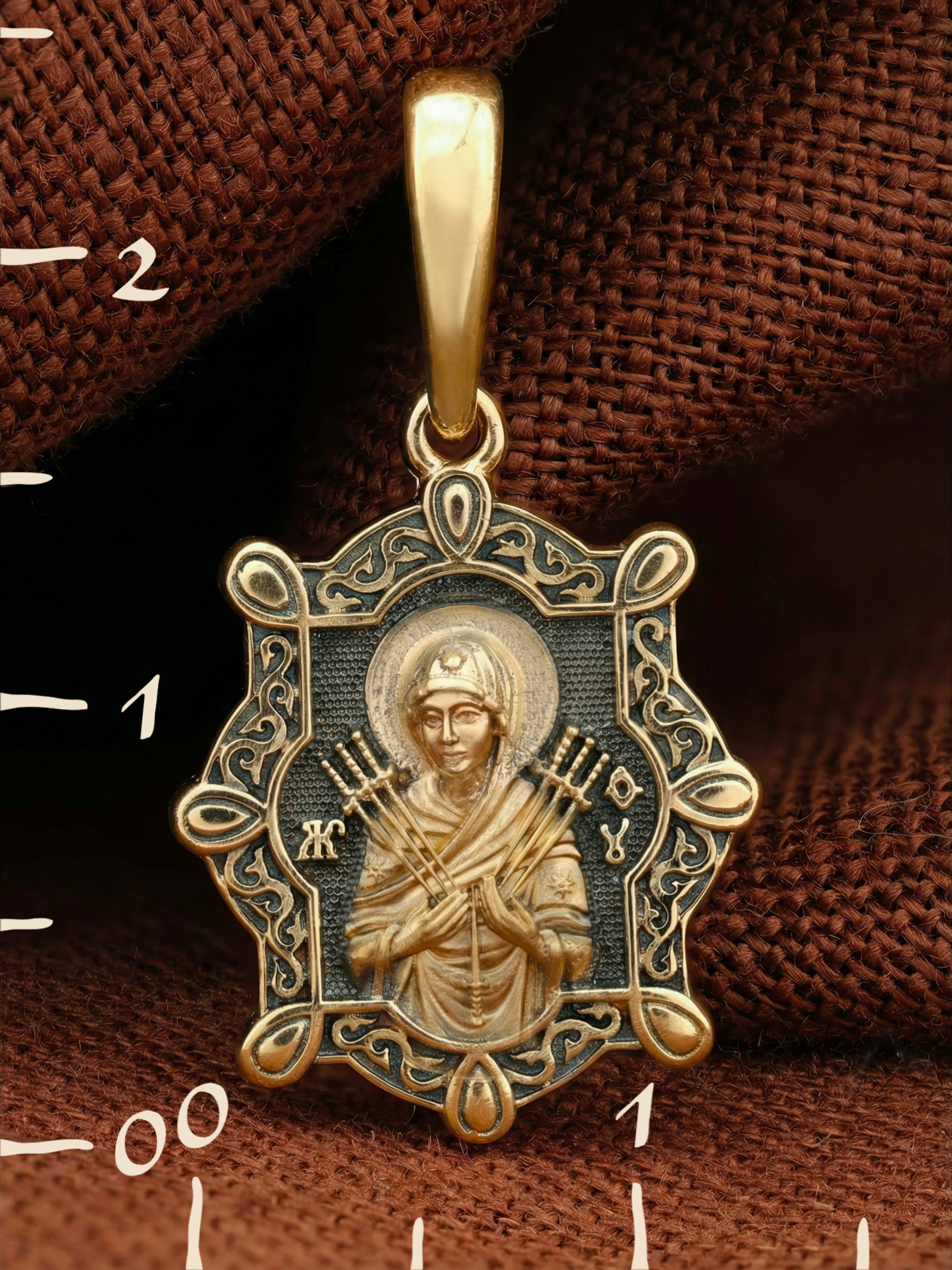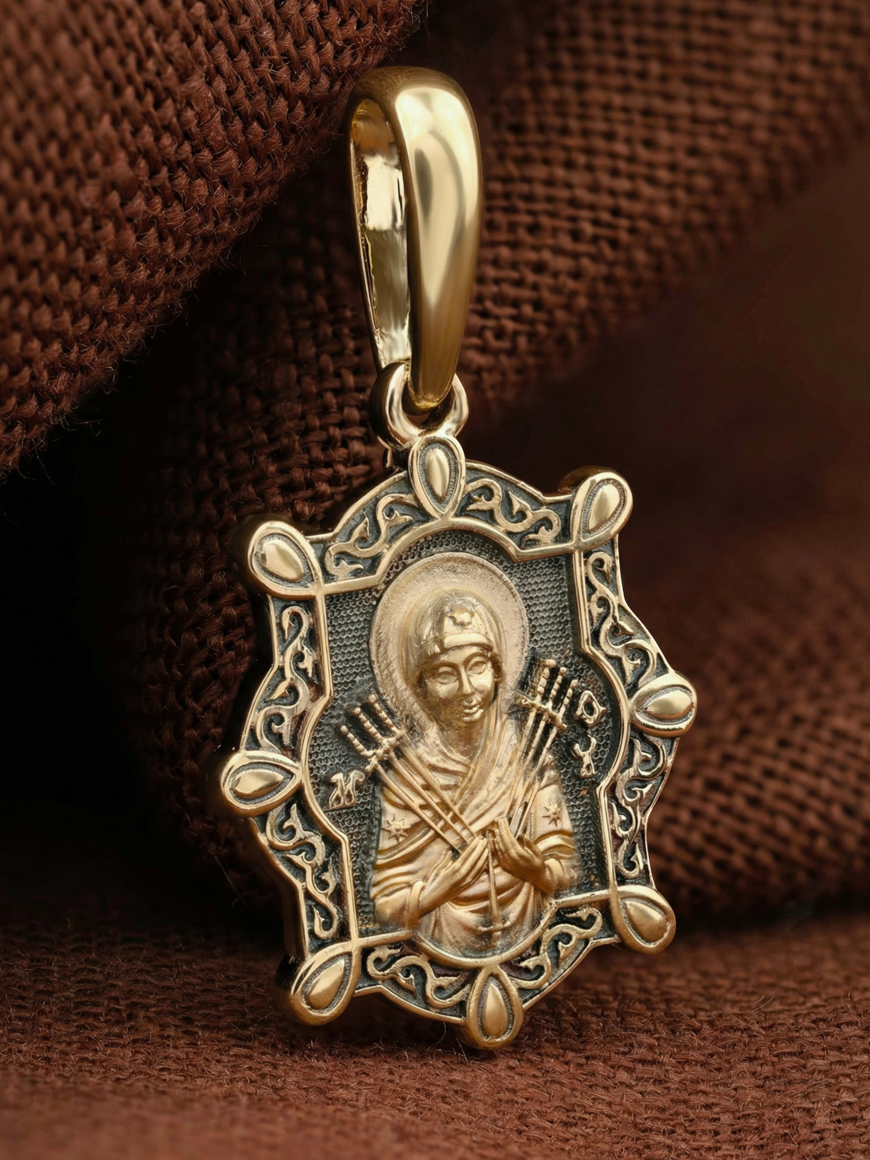 На лицевой стороне образка изображена икона Пресвятой Богородицы «Семистрельная» — одна из самых чудотворных икон на Руси. На протяжении многих веков христиане взывали к Царице Небесной через эту икону, если в стране начинались войны или мятежи.