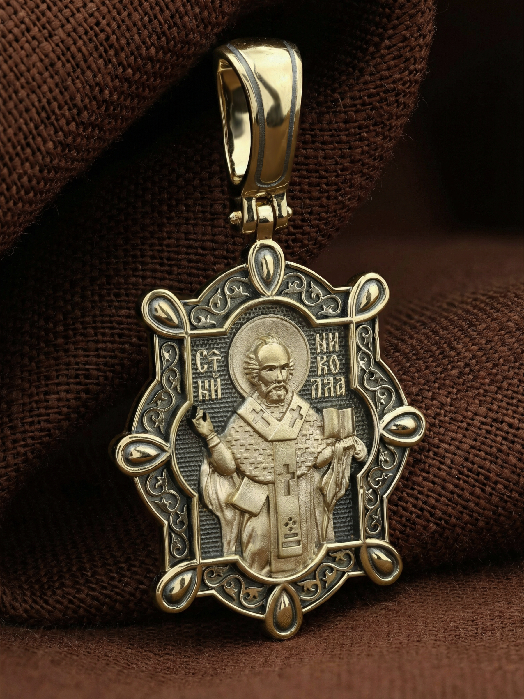 На лицевой стороне образка изображен Святитель Николай архиепископ Мир Ликийских, Чудотворец. Он является одним из самых почитаемых святых в православном мире. Святитель Николай родился во второй половине III века в Малой Азии в Ликийском городе Патары. Сохранилось Предание, что во время крещения он простоял в купели три часа. С детства Святитель избегал развлечений, любил молитву, прекрасно учился и проводил свободное время за чтением Священного писания. Приняв сан священника, святитель Николай стал проводить еще более строгую подвижническую жизнь. Вся жизнь святого Николая — это служение Богу. Он помогал сущим в бедах, укрощал штормы, спасал от потопления и выносил на сушу из глубины морской, освобождал из плена и приносил освобожденных домой, избавлял от темницы, освобождал от смерти, подавал различные исцеления: слепым — прозрение, глухим — слух, немым — дар слова.