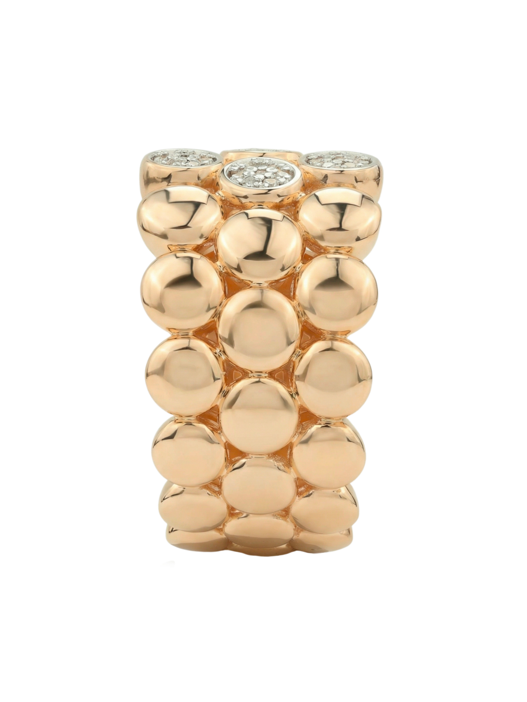 В центре композиции гармонично расположились 50 вставок, среди которых сияющие бриллианты и насыщенный рубин. Круглая форма вставок придает изделию классическую элегантность, а контраст белого цвета бриллиантов и глубокого красного цвета рубина создает неповторимую игру света на поверхности красного золота. Такое сочетание материалов выглядит роскошно и благородно, привлекая восхищенные взгляды.
