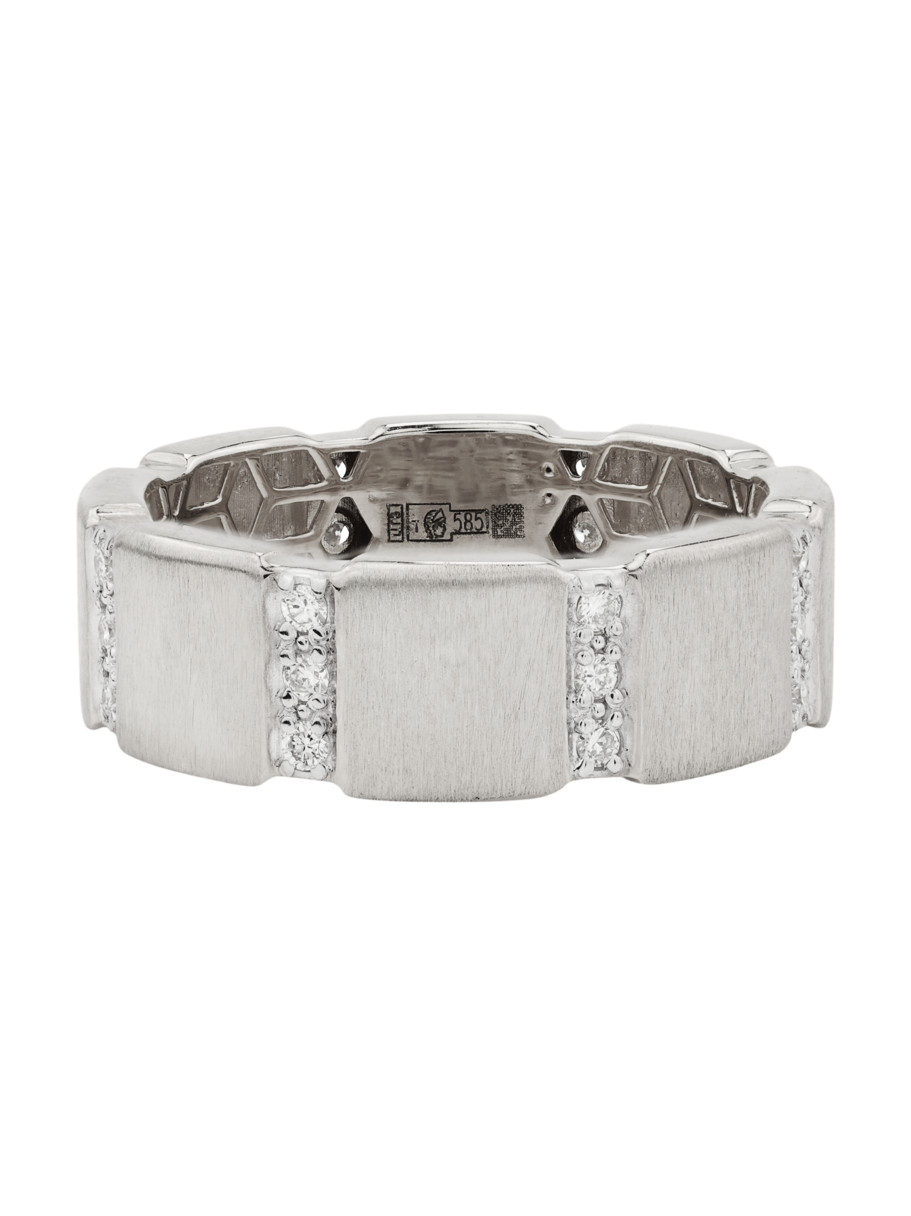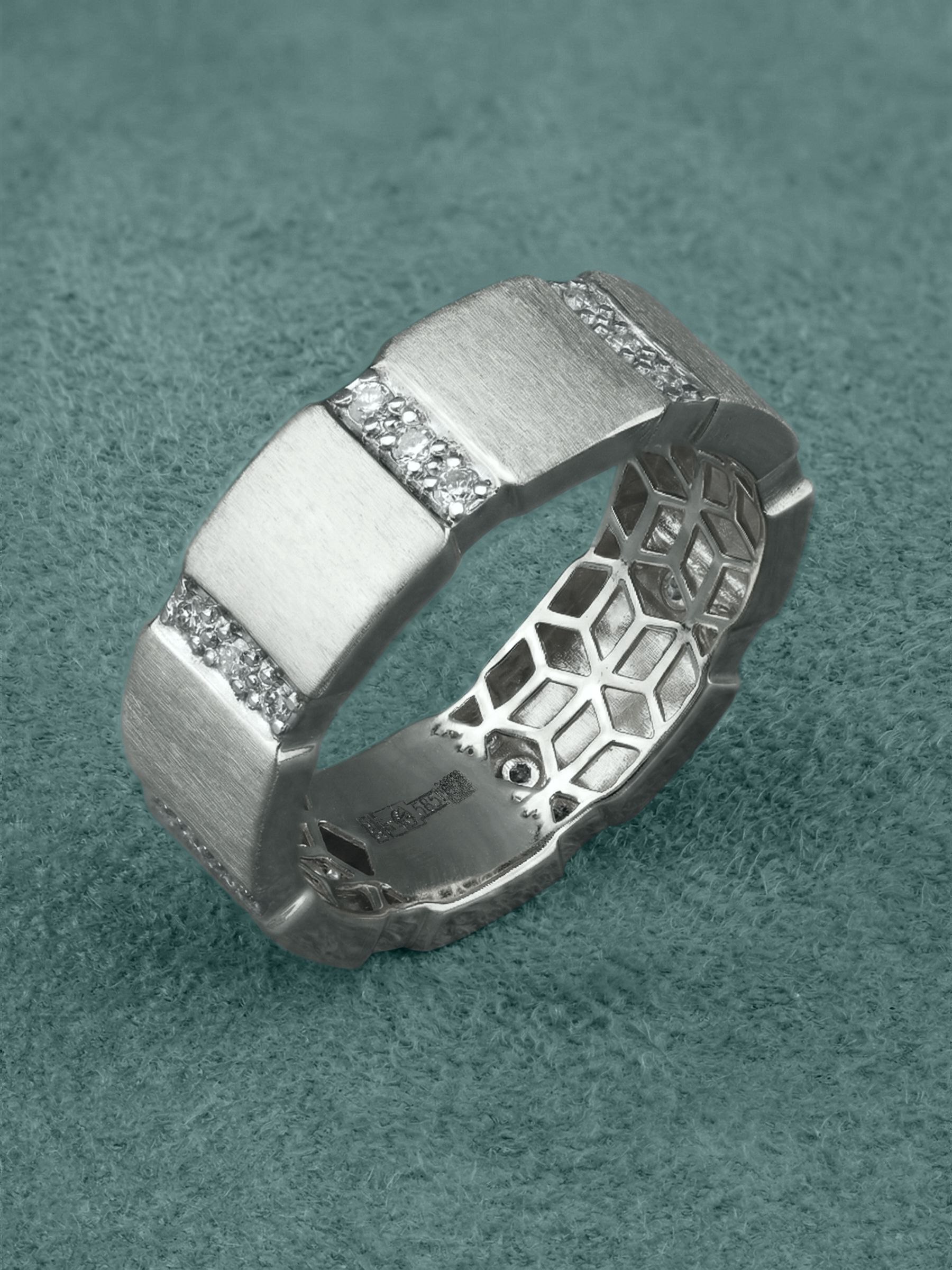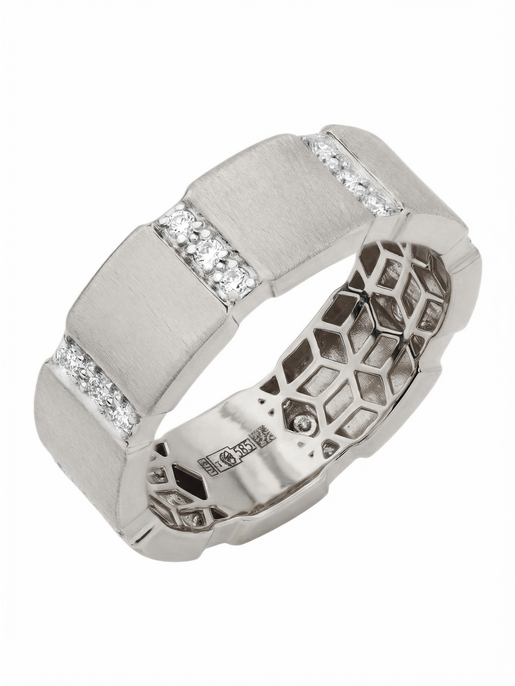 Центральным элементом композиции выступает инкрустация: 24 бриллианта круглой формы с безупречным белым цветом вставок расположены таким образом, чтобы подчеркнуть геометрию изделия. Игра света на гранях камней эффектно контрастирует со строгими линиями основы, придавая украшению динамику и особое очарование. Благодаря продуманной эргономике кольцо удобно носить каждый день.