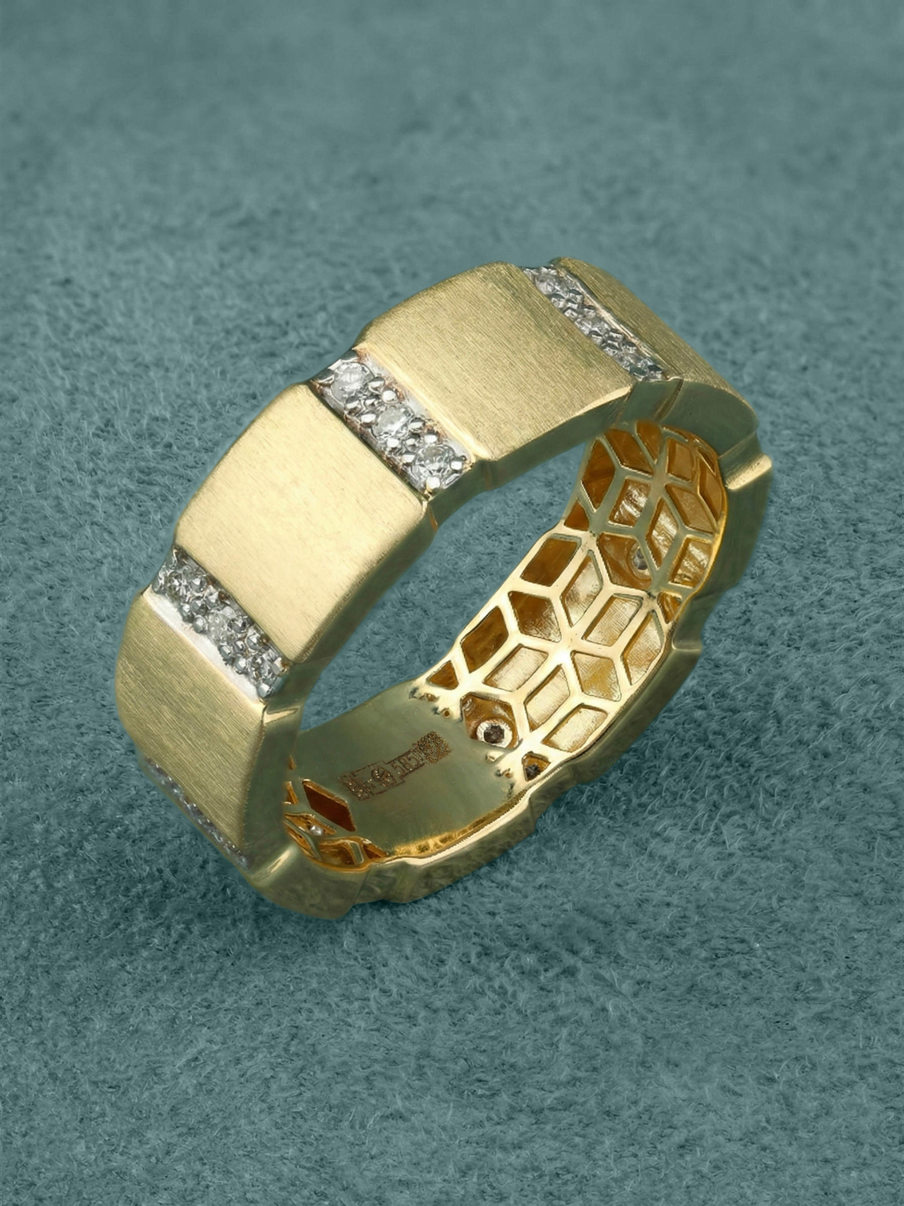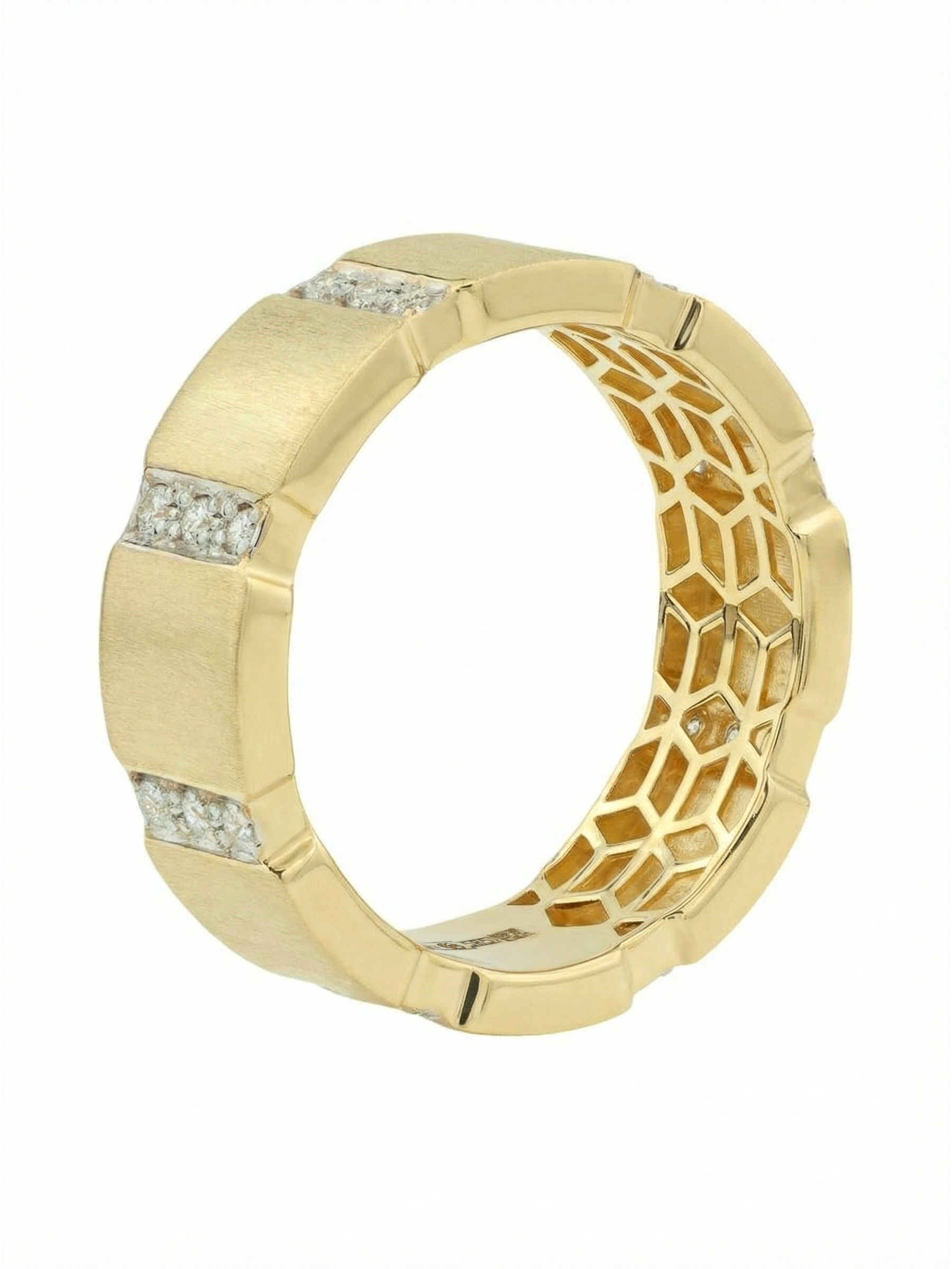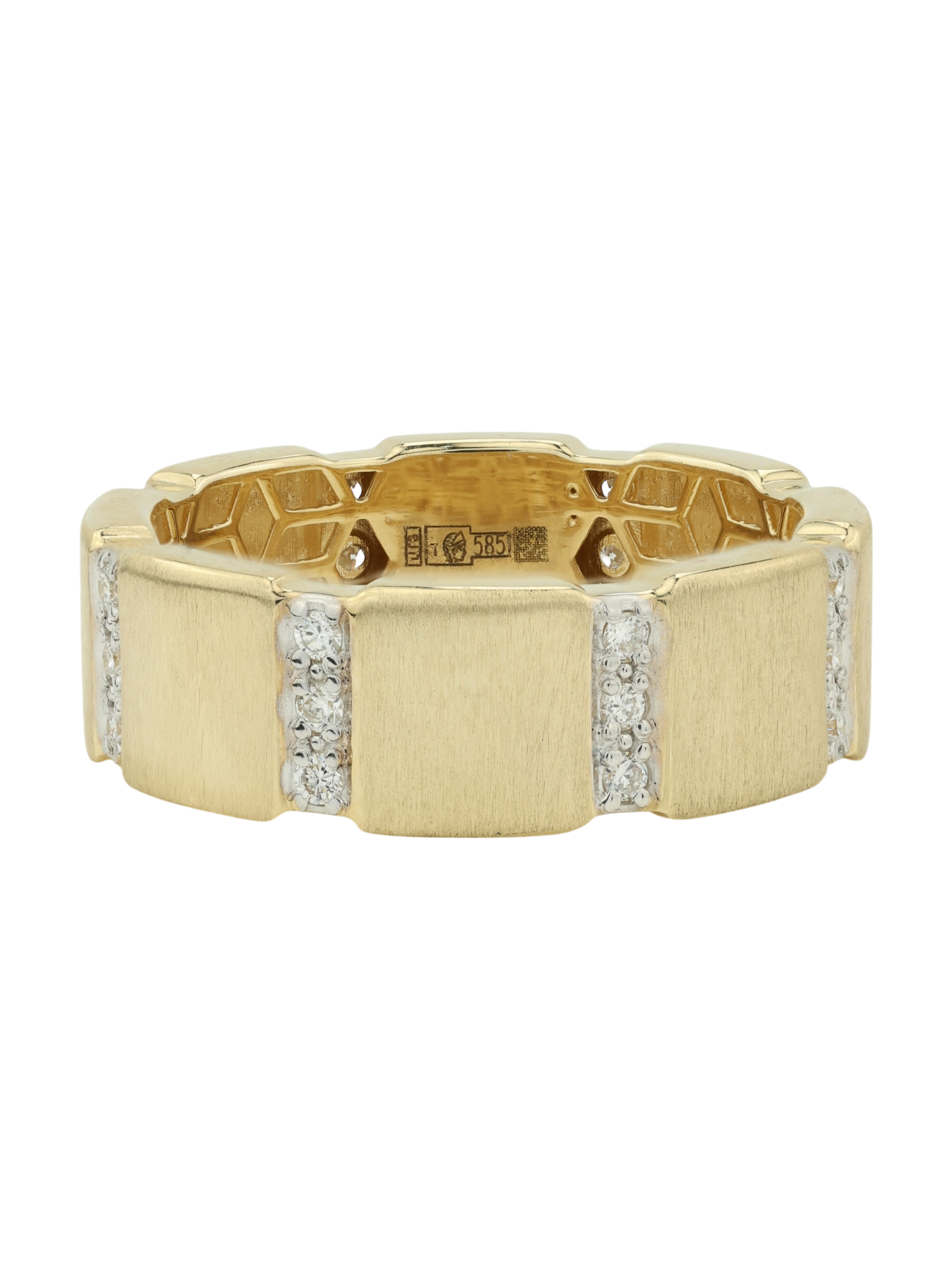 Декоративный акцент модели — 24 бриллианта круглой огранки с сияющим белым цветом вставок. Драгоценные камни деликатно вписаны в структуру изделия, добавляя сдержанный блеск и подчеркивая глубину оттенка лимонного золота. Конструкция кольца продумана до мелочей, обеспечивая комфортную посадку на пальце.