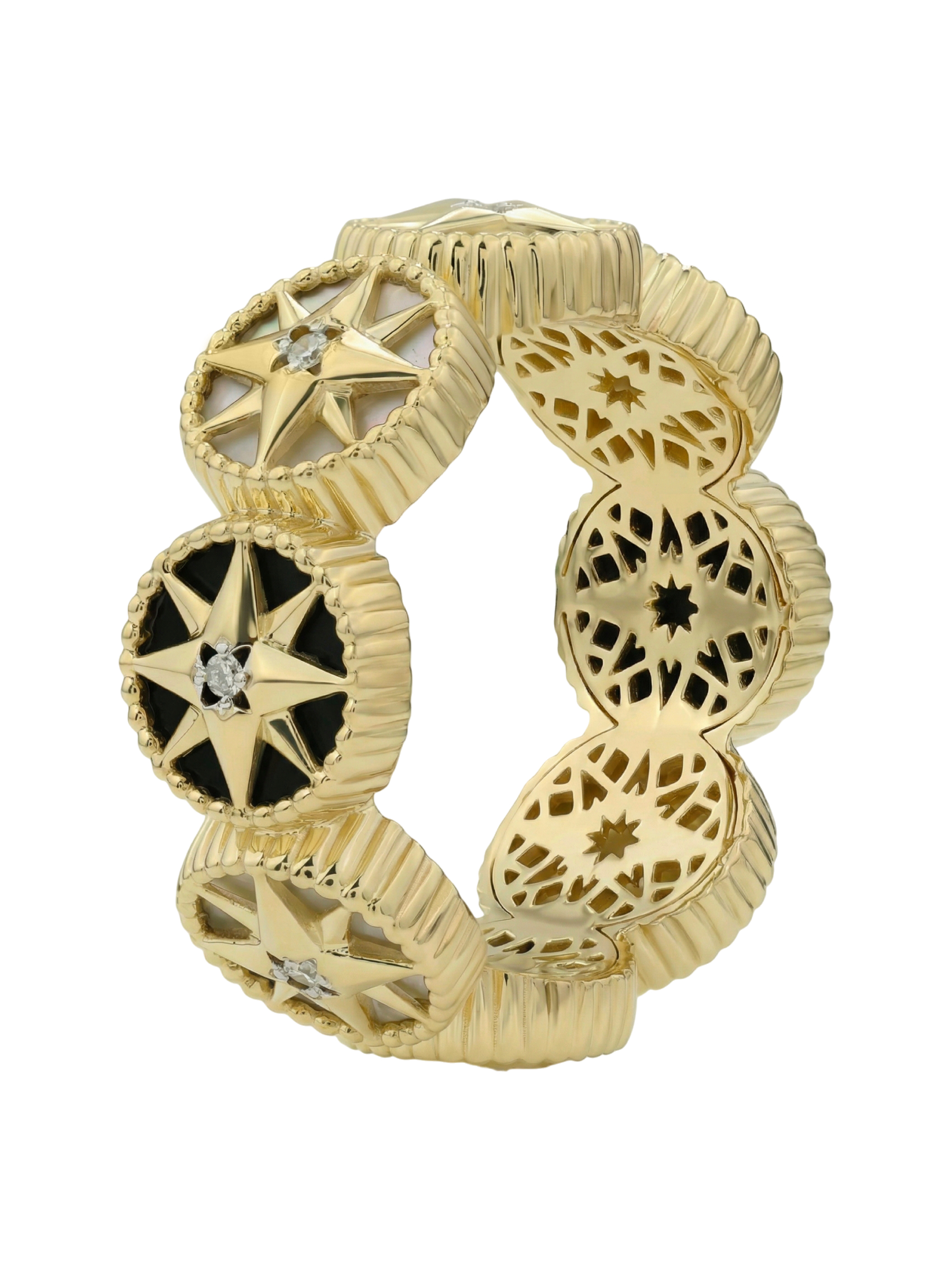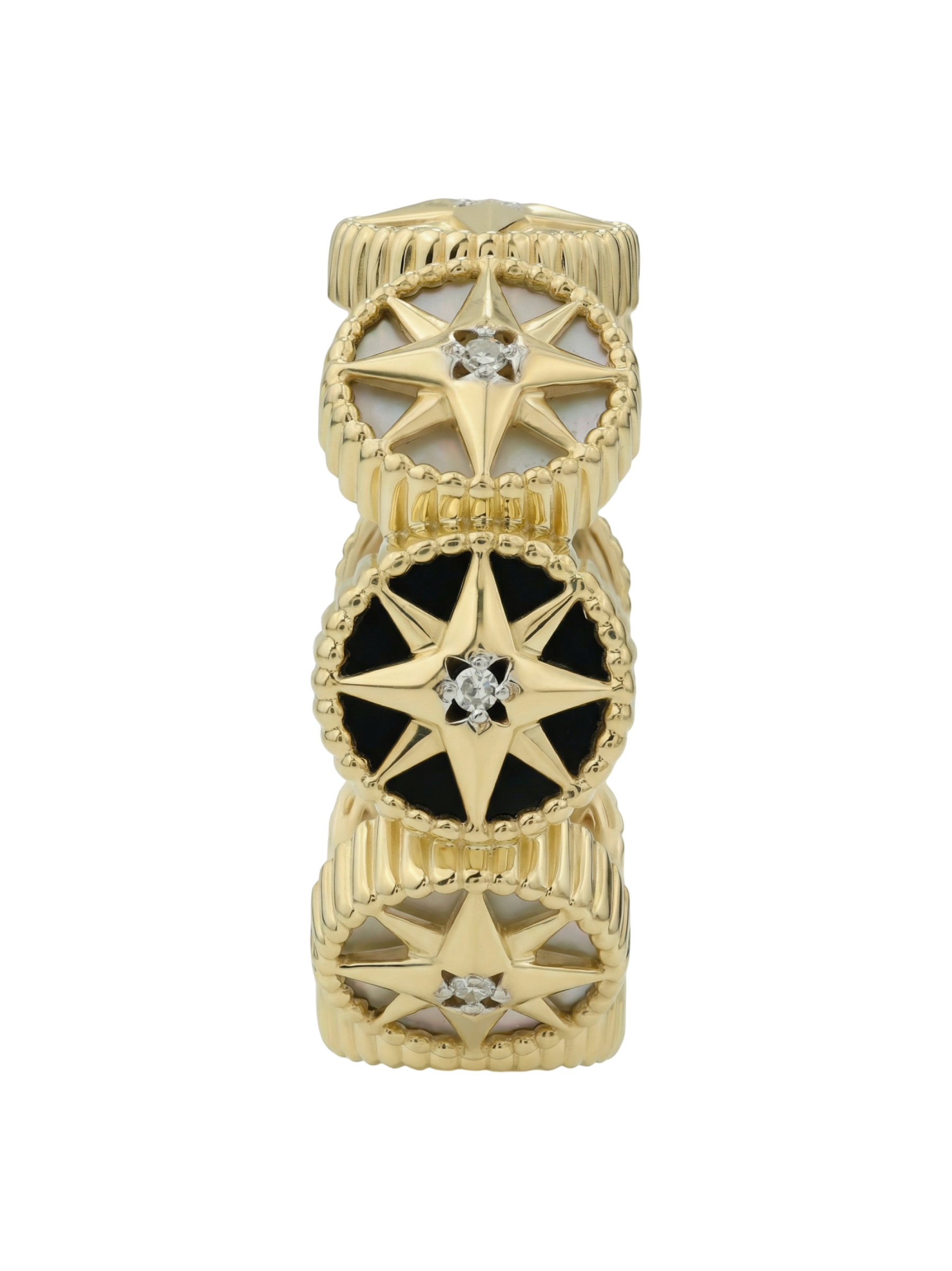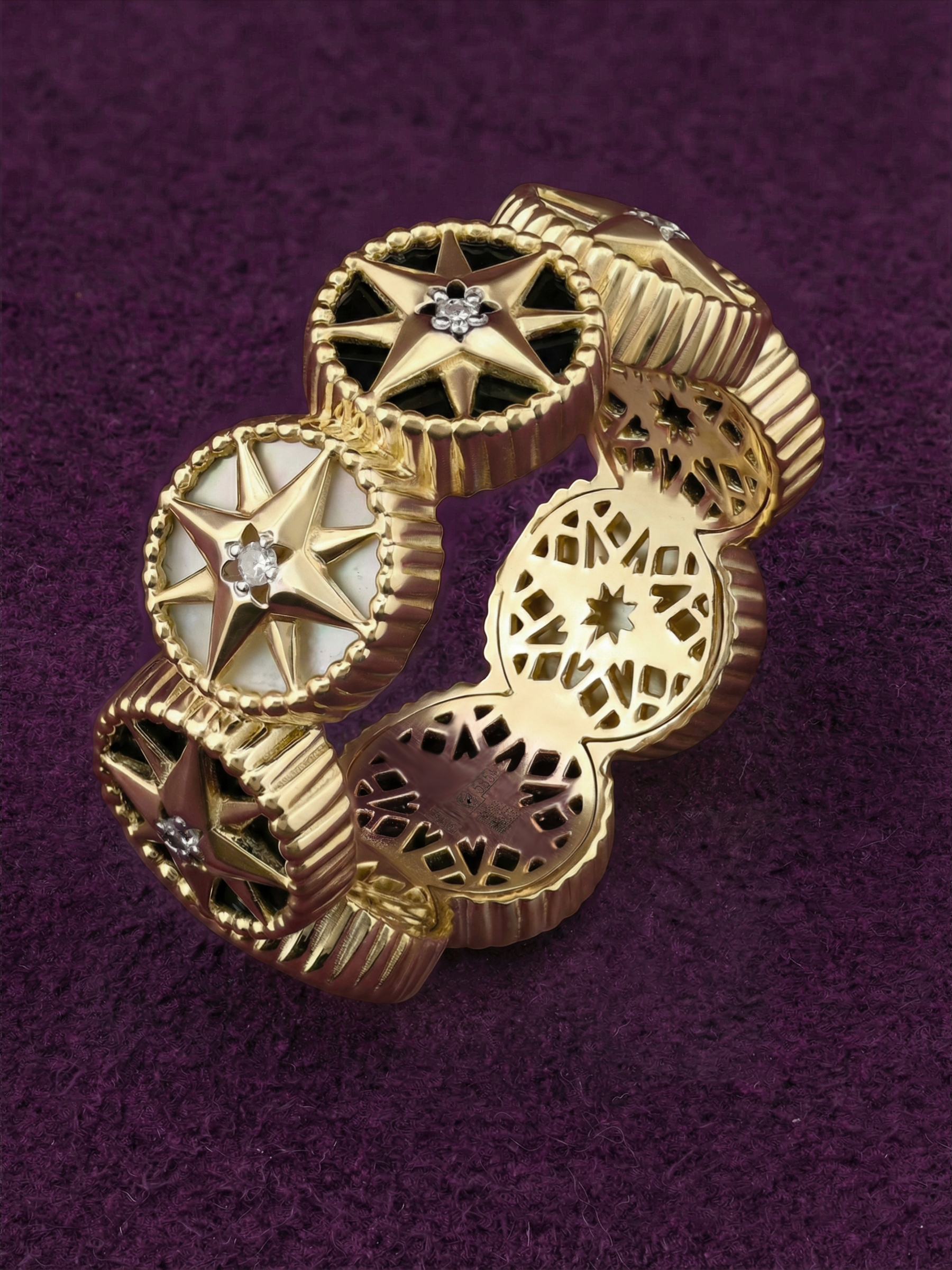 Центральным элементом композиции стали вставки из оникса черного цвета и нежного перламутра, которые контрастируют друг с другом и создают завораживающую игру света. Каждая деталь подчеркнута 12 бриллиантами круглой огранки, сияющими в самом центре звездных мотивов. Использование вставок разной фактуры — белого перламутра и глубокого черного оникса — придает кольцу особую выразительность и глубину.