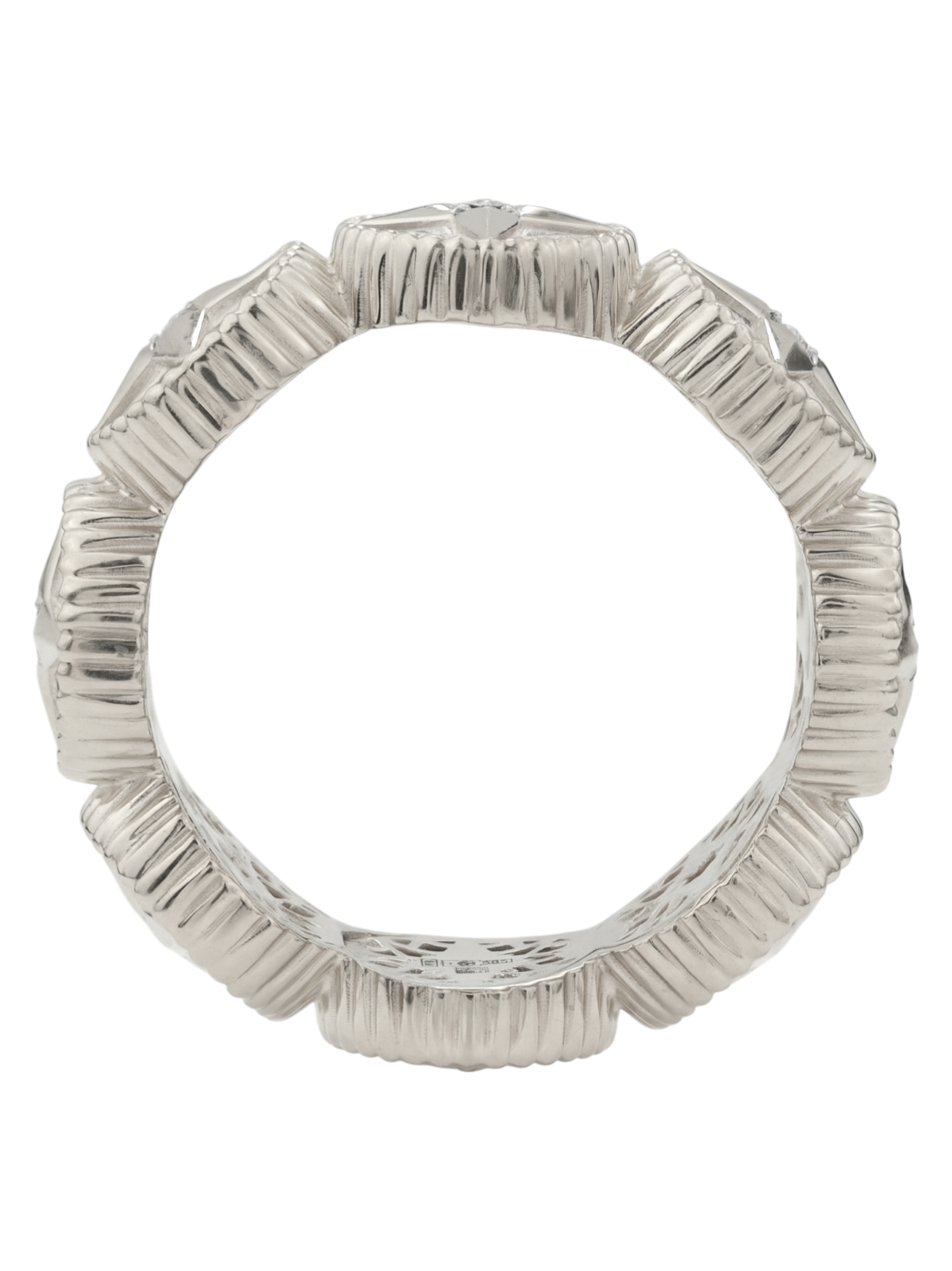 Всего кольцо украшают 12 вставок круглой формы, создающих гармоничный и завершенный вид. Белый цвет металла и контрастная палитра камней позволяют этому украшению выглядеть статусно и современно. Кольцо выполнено в стиле унисекс, поэтому подходит как для женщин, так и для мужчин, которые ценят оригинальные и качественные аксессуары. Данное изделие отлично смотрится как самостоятельный элемент стиля, так и в составе комплектов украшений.