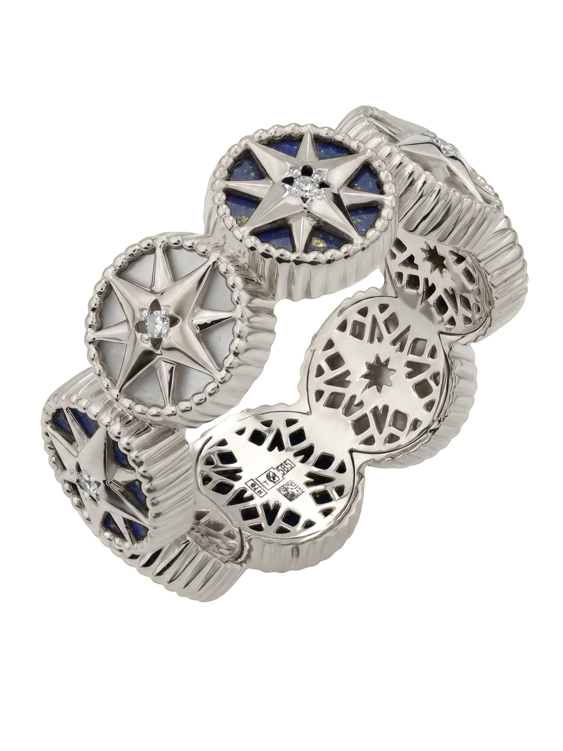 Кольцо из белого золота 585 пробы из коллекции De Luxe — Звёзды — Бриллианты станет безупречным акцентом вашего образа. Дизайн украшения, выполненный в форме звезд, завораживает своей глубиной и продуманными деталями. Мастера ювелирного дела объединили холодный блеск драгоценного металла с роскошным сочетанием вставок: глубоким синим лазуритом и нежным переливчатым перламутром. В центре каждого элемента композиции сверкает бриллиант, придавая изделию особую выразительность.