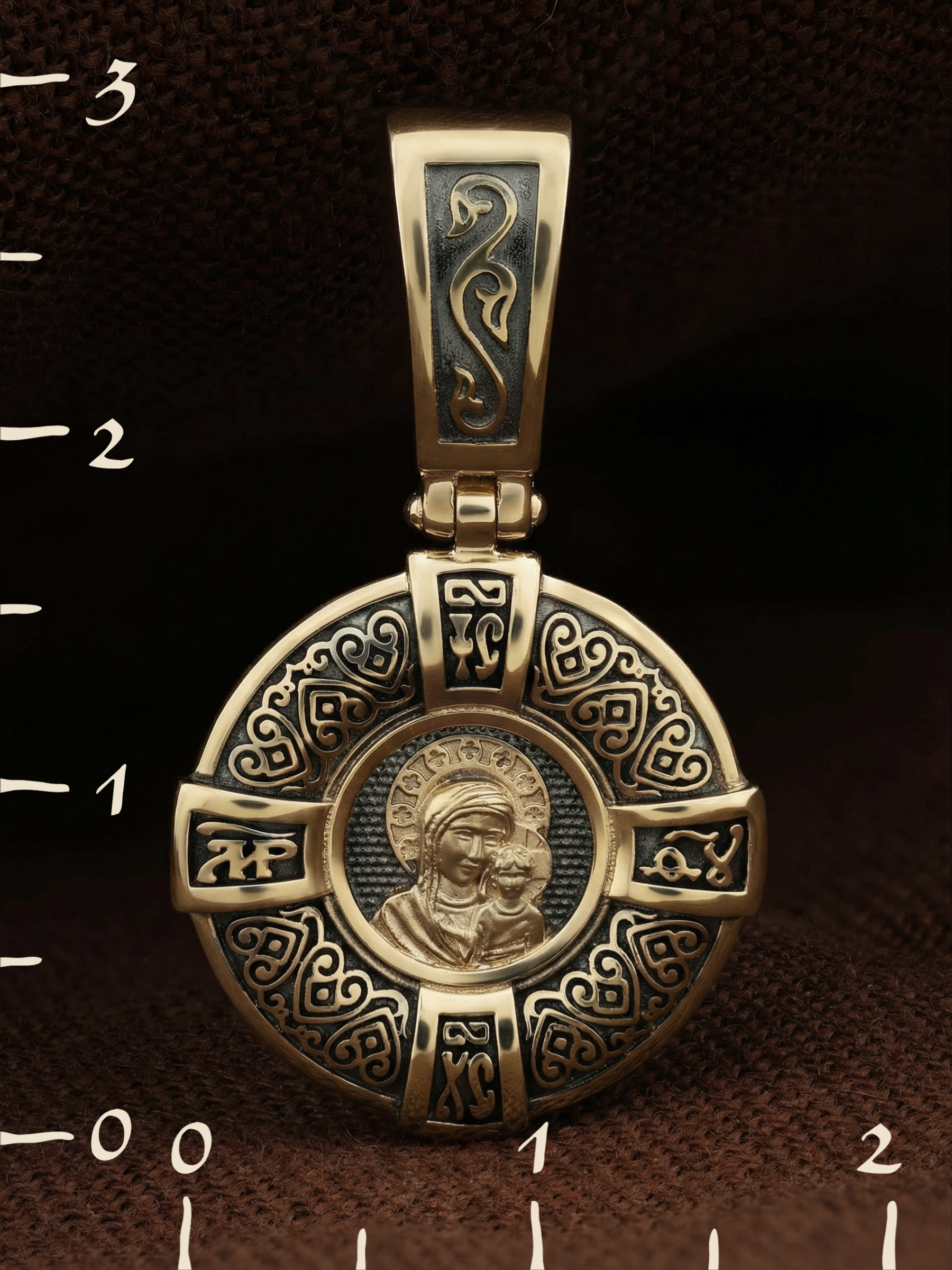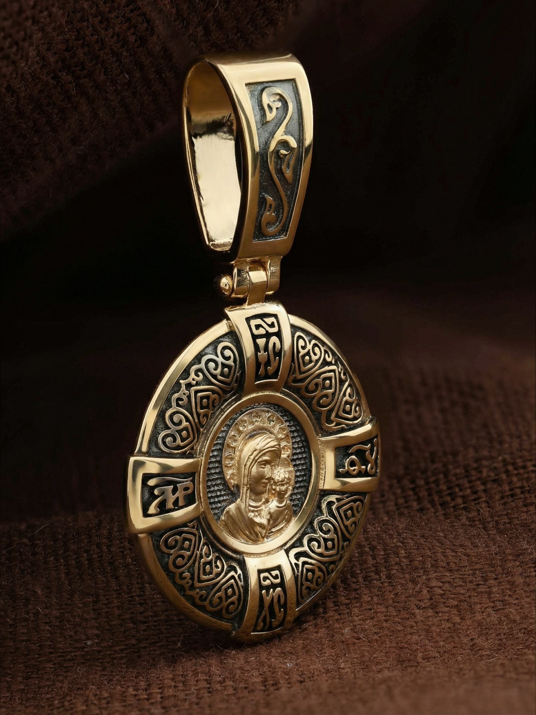 На лицевой части образка изображена Казанская икона Пресвятой Богородицы — одна из самых почитаемых в России чудотворных икон Богородицы. Богословское значение Казанской иконы — указать верующим истинный Путь к спасению, который лежит через Христа. Только Божия Матерь имеет настолько сильное дерзновение к Спасителю, что может ходатайствовать перед Ним за всех верных. Именно этот образ дарится новой повенчанной паре, как хранитель очага и семейная реликвия. Молитва перед Казанской иконой Божьей Матери помогает во всех сложных случаях жизни, в болезнях, во всех печалях, невзгодах, скорбях. Уникальная история появления, чудеса, случившиеся по молитвам православных людей возле образа — все это делает Казанскую Богородицу особенной, среди тысяч других икон.