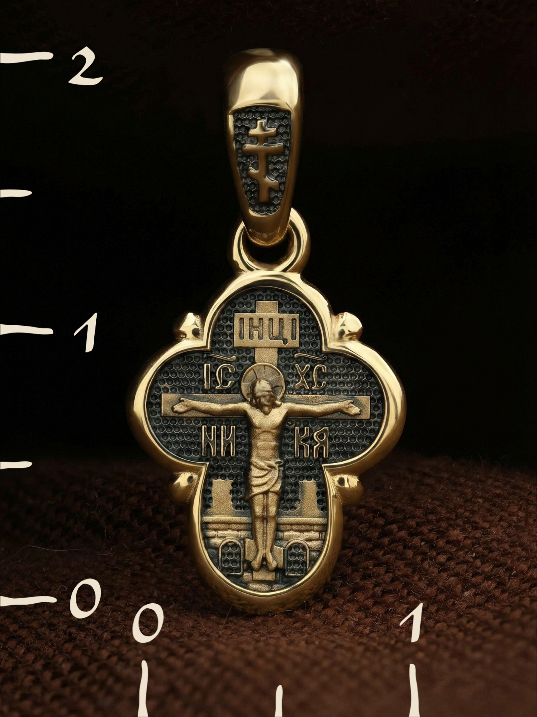 На лицевой стороне креста изображено Распятие Господа и Спасителя нашего Иисуса Христа, отдавшего Себя на смерть, для искупления грехов мира. Крест является символом жертвенной любви Всеблагого Бога к падшим людям, всепобеждающим духовным оружием христиан, основанием и средоточием церковной жизни. Господь сказал: «кто хочет идти за Мною, отвергнись себя, и возьми крест свой, и следуй за Мною». (Мк. 8: 34). На верхней табличке, выше головы Иисуса, расположена надпись, составленная Понтием Пилатом — «IНЦI». Она означает «Иисус Назорей, Царь Иудейский». Надпись «IC» «ХC», означает Иисус Христос, помещается на разных сторонах поперечной перекладины креста. Рядом — слово «НИКА», что означает «победитель». За крестом высится Иерусалимская стена. Над вершиной Распятия, на кулонном кольце, помещен крест.