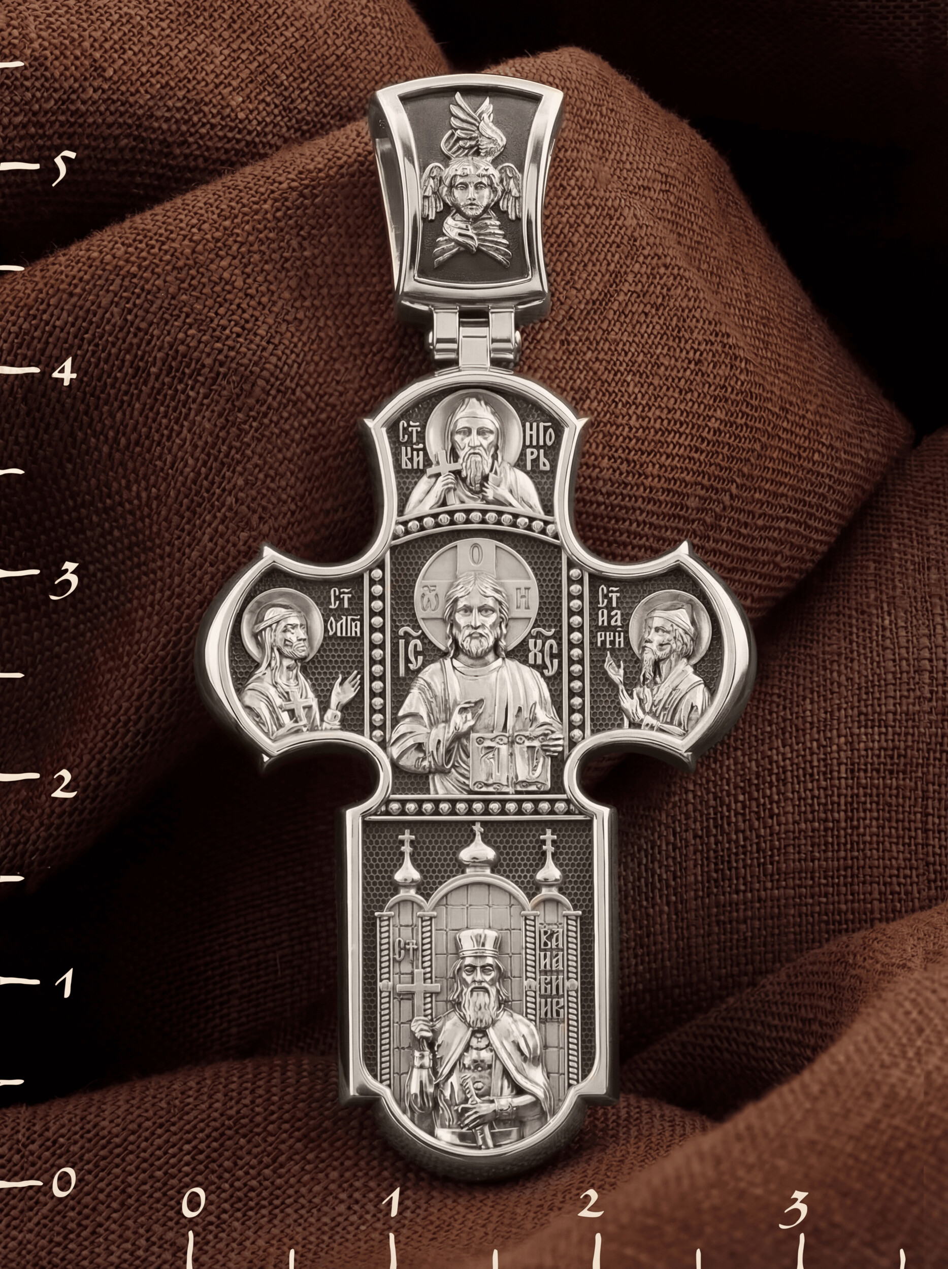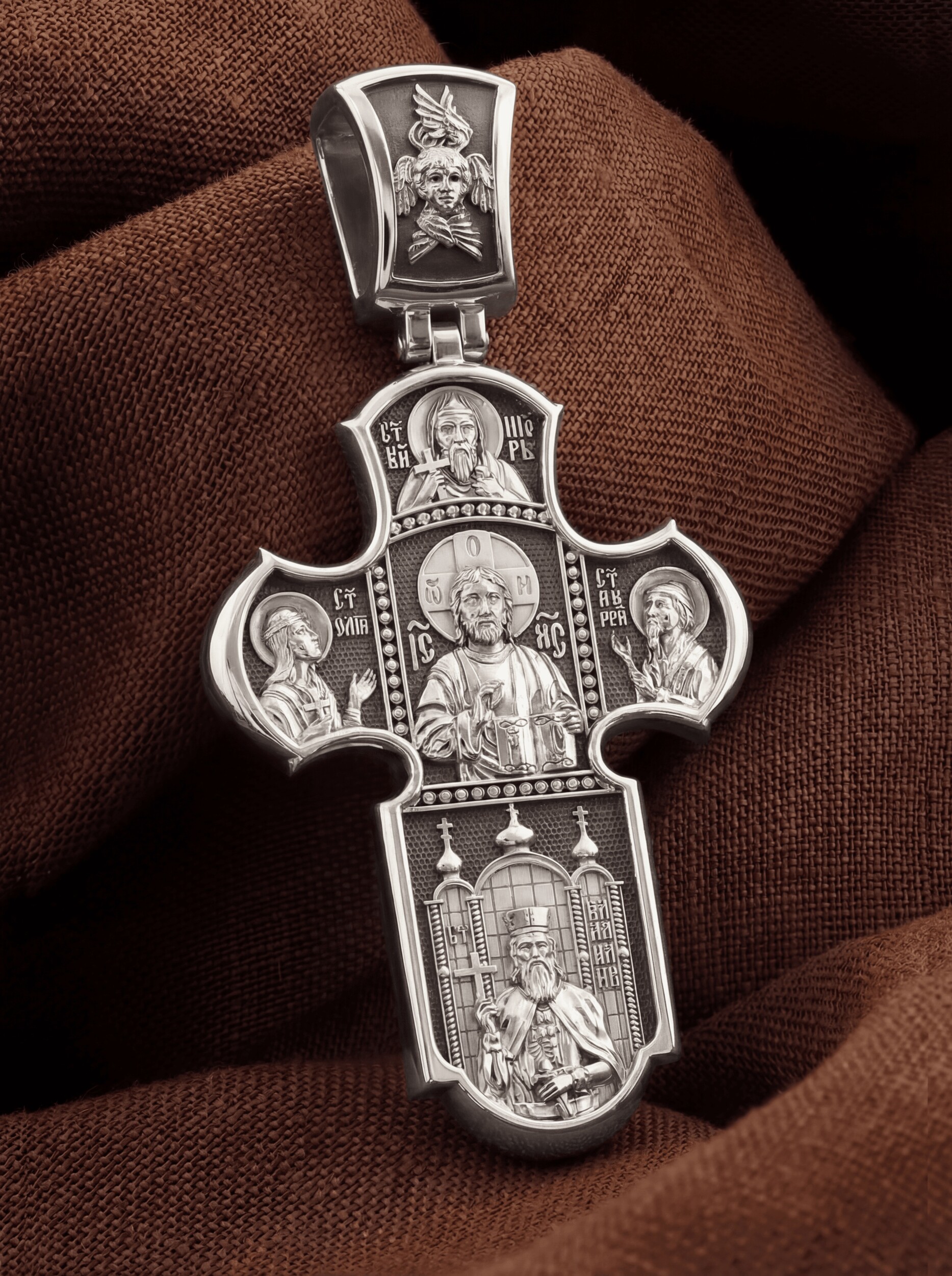 Образ Христа на лицевой стороне символически являет Господа как вершителя судеб человеческих, всесильного и всемогущего Бога. Господь правой рукой благословляет, а в левой держит Книгу Жизни, в которой для каждого человека есть своя страница. Рядом с Христом — Святая равноапостольная великая княгиня Ольга и Святой апостол Андрей Первозванный. Над образом спасителя изображен Святой благоверный князь Игорь. Внизу — Святой равноапостольный великий князь Владимир, креститель Руси.