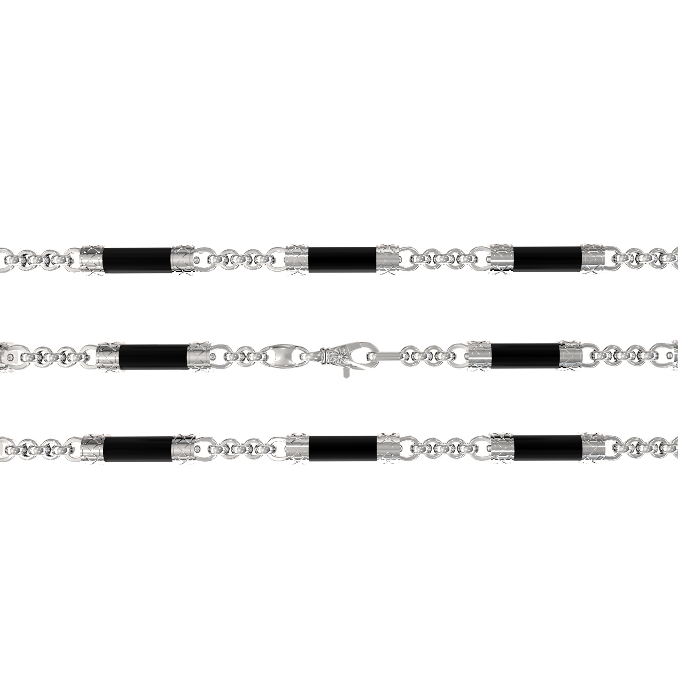 Белое золото с его характерным сиянием идеально гармонирует с черным ониксом, создавая выразительный и мужественный визуальный ряд. Массивное плетение и геометрически выверенные вставки придают изделию солидный и завершенный вид. Такая цепь гармонично смотрится как самостоятельный аксессуар, так и в сочетании с другими элементами мужского ювелирного гардероба, позволяя создавать полноценные комплекты.
