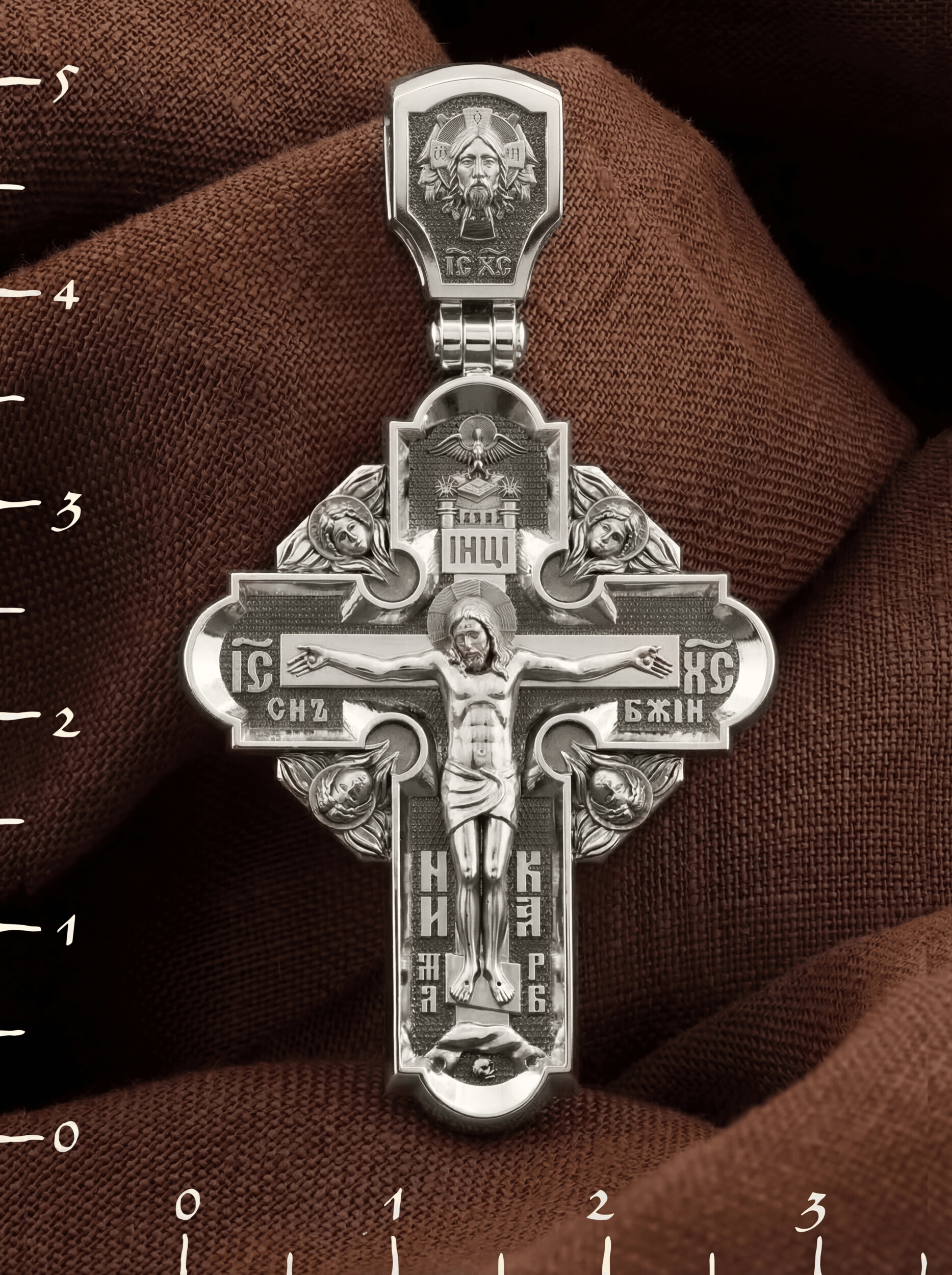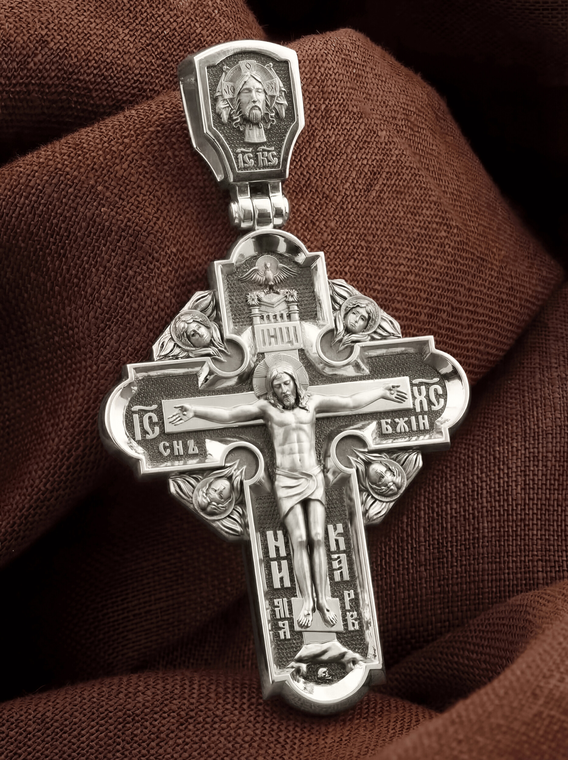На лицевой стороне креста изображено Распятие Господа и Спасителя нашего Иисуса Христа, отдавшего Себя на смерть, чтобы другие могли жить — жить вечной жизнью, жить с Богом. Своею кровью Господь освятил крест и сделал его проводником Своей благодати, источником освящения верующих. На верхней табличке, выше головы Иисуса, расположена надпись, составленная Понтием Пилатом — «ИНЦИ». Она означает «Иисус Назорей, Царь Иудейский». Надпись «IС ХС» означает Иисус Христос помещается на разных сторонах поперечной (большой) перекладины креста. На кулонном кольце помещено изображение Духа Святого в виде голубя, сходящего с Небес
