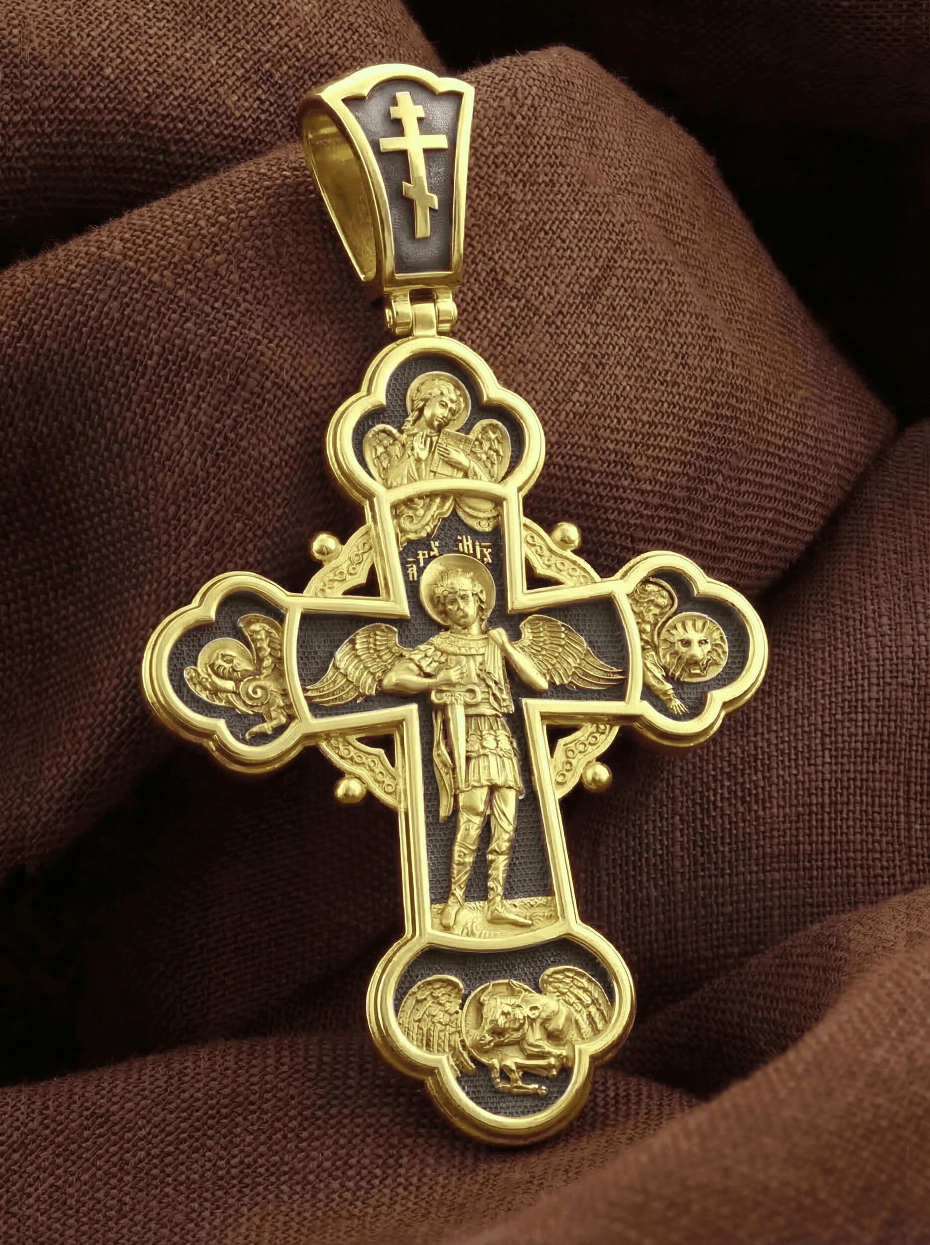 В центре оборота креста изображен Архистратиг Михаил. Могучий Архангел почитается как покровитель воинов и всех верных Богу и ведущих борьбу против сил зла, а также защитник душ умерших, страж райских врат. Над ним благословляющая десница — знак присутствия Бога. Архангел изображен в окружении символов четырех евангелистов: орел (Иоанн), лев (Марк), телец (Лука) и ангел (Матфей).