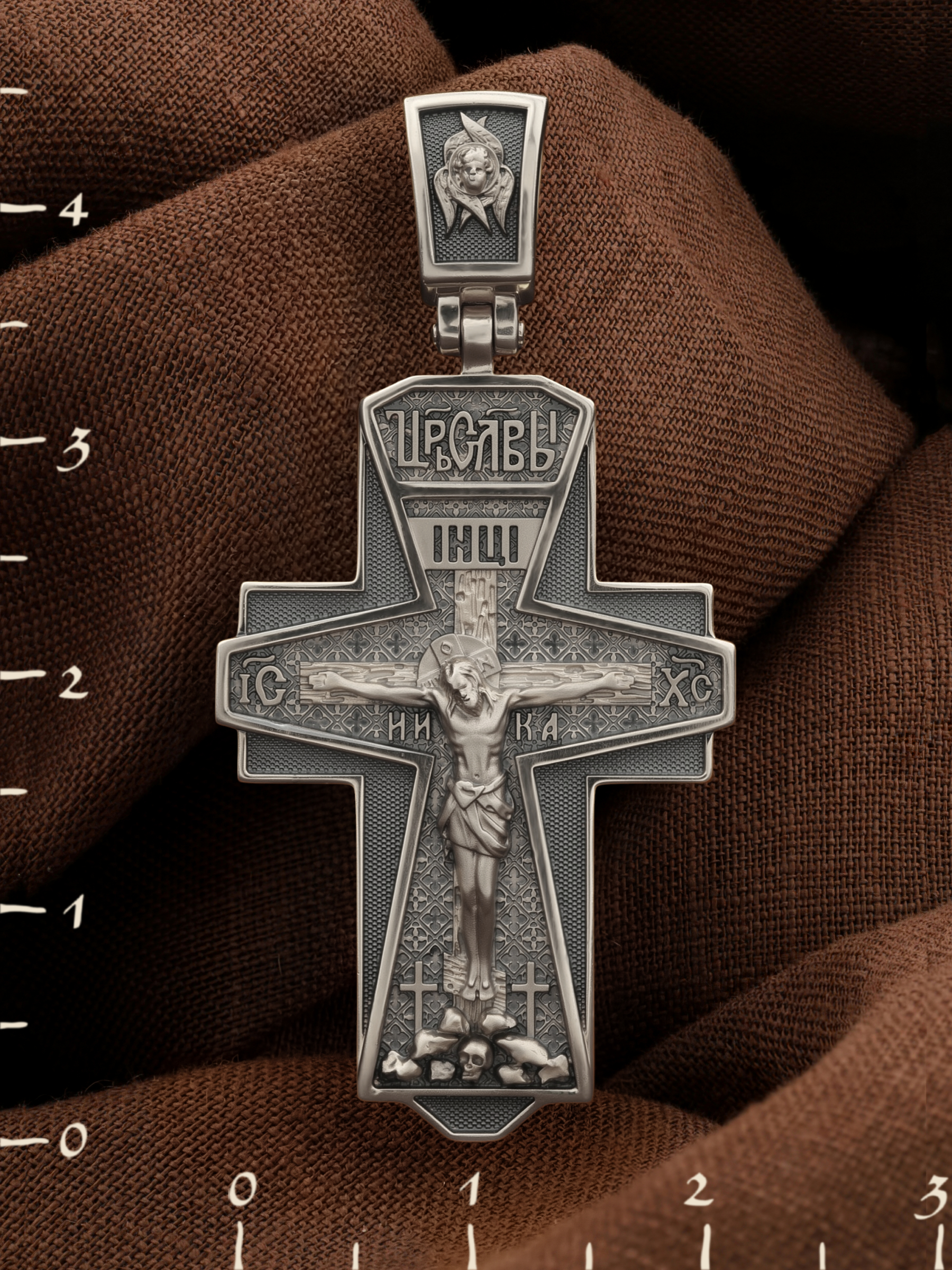 Над титлом видим слова «ЦРЬ СЛВЫ» — Царь Славы. Верхняя перекладина символизирует собой табличку с надписью «IHЦI» — Иисус Назарянин Царь Иудейский. Над перекладиной пишется сокращенно имя Спасителя «IC XC» — Иисус Христос, ниже перекладины добавляется: «НИКА» (греч. — Победитель). Возвышение, на котором стоит Крест, символизирует гору Голгофу, на которой произошло Распятие. У подножия Креста изображают прах Адама, обозначенный черепом.