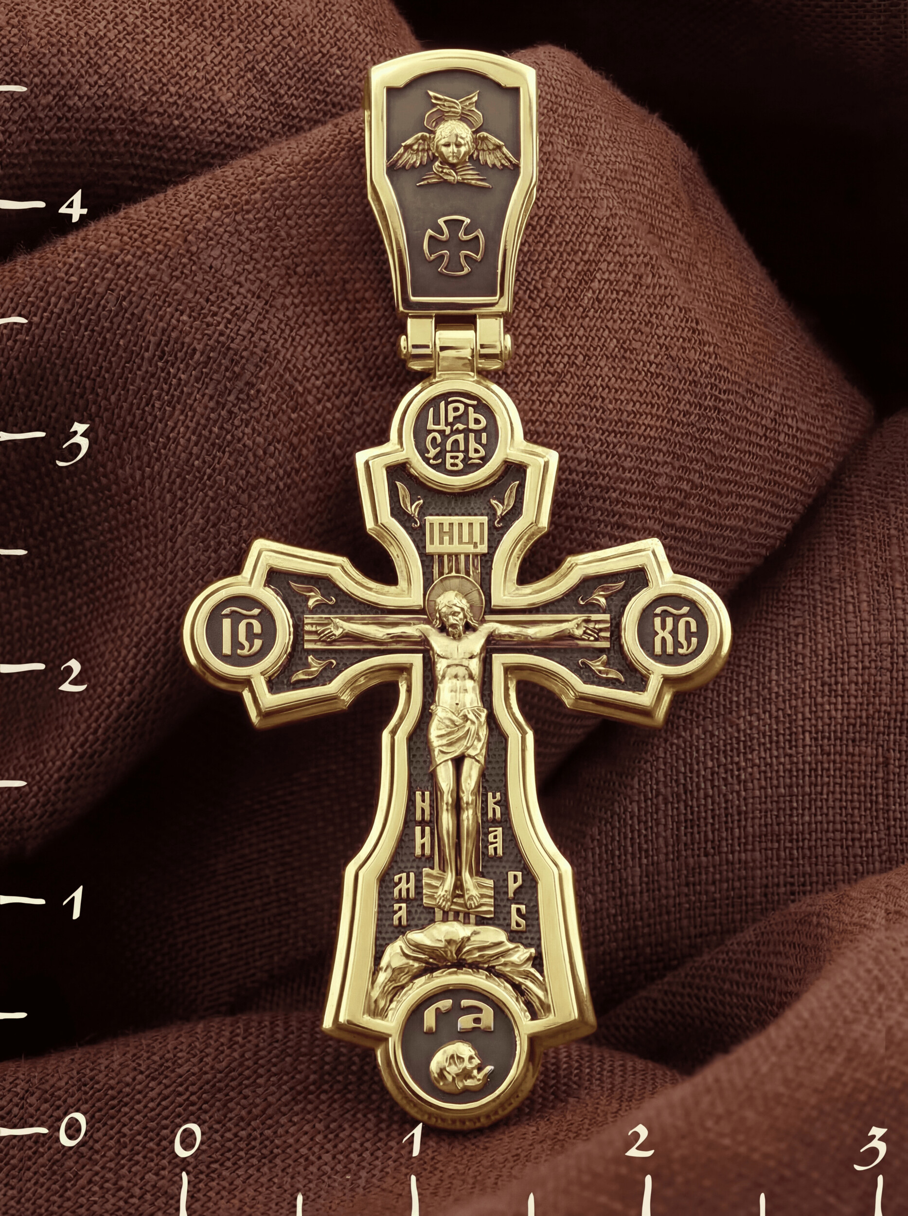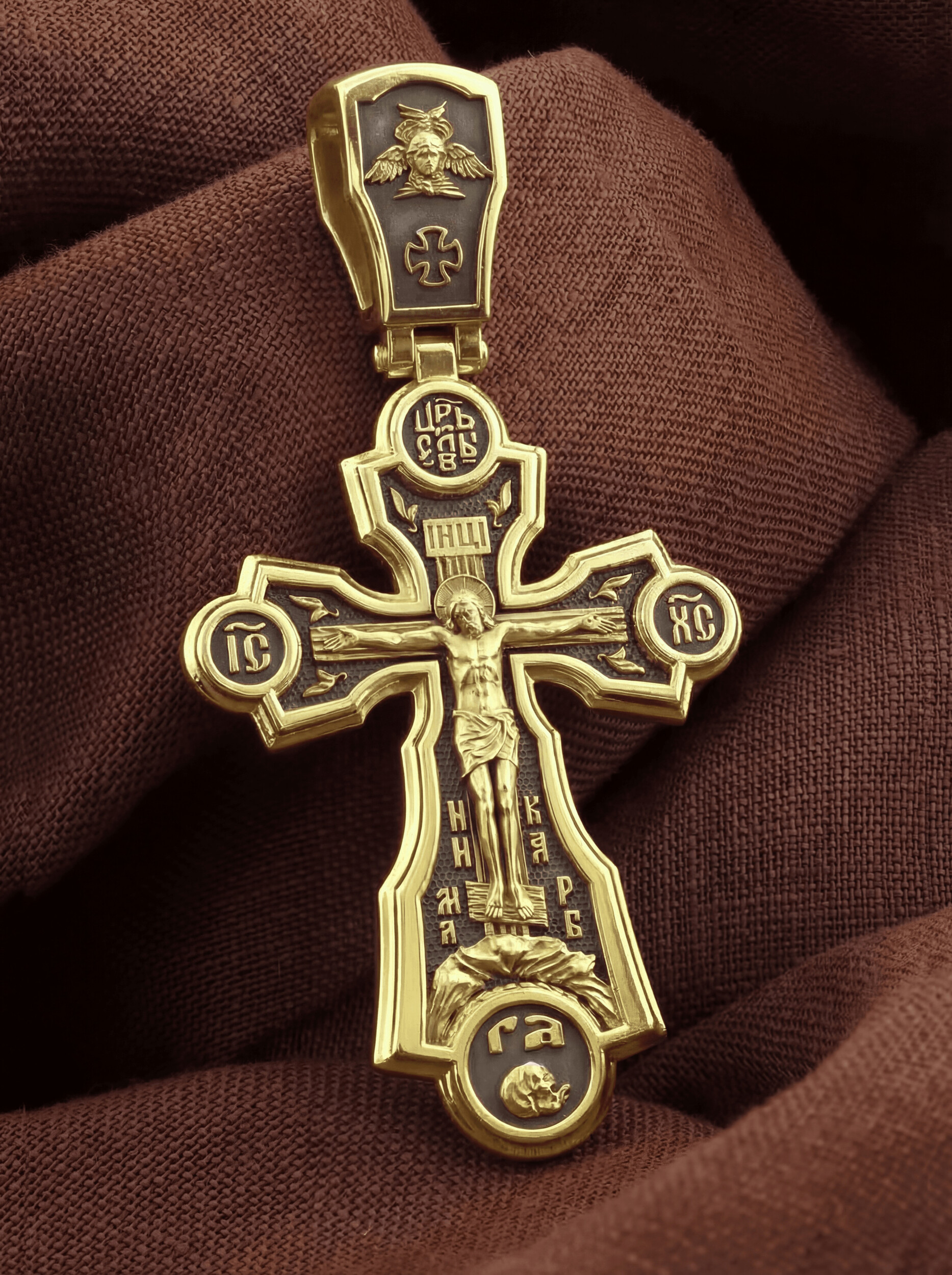 На лицевой стороне креста изображено Распятие Господа нашего Иисуса Христа. В традиции Православия принято изображать Спасителя как Воскресшего Крестоносителя, призывающего в Свои объятия все концы мира. Крест стоит на горе камней, символизирующих Голгофу, в основании которой различается череп. Это голова Адама. Он обозначен буквами «Г» и «А». Над головой Господа на поперечной перекладине аббревиатура «IНЦI», что символизирует табличку, которая была прибита к Кресту, с надписью «Иисус Назорей Царь Иудейский». Этим иудеи хотели посмеяться над Христом, не зная, что распинают истинного Царя всех царей. По бокам поперечной перекладины-титлы святого имени Христа «IC» (Иисус) «ХС» (Христос), и слово «НИКА», что в переводе с греческого означает «победитель». Венчает лицевую сторону креста надпись «ЦС» — «Царь Славы».