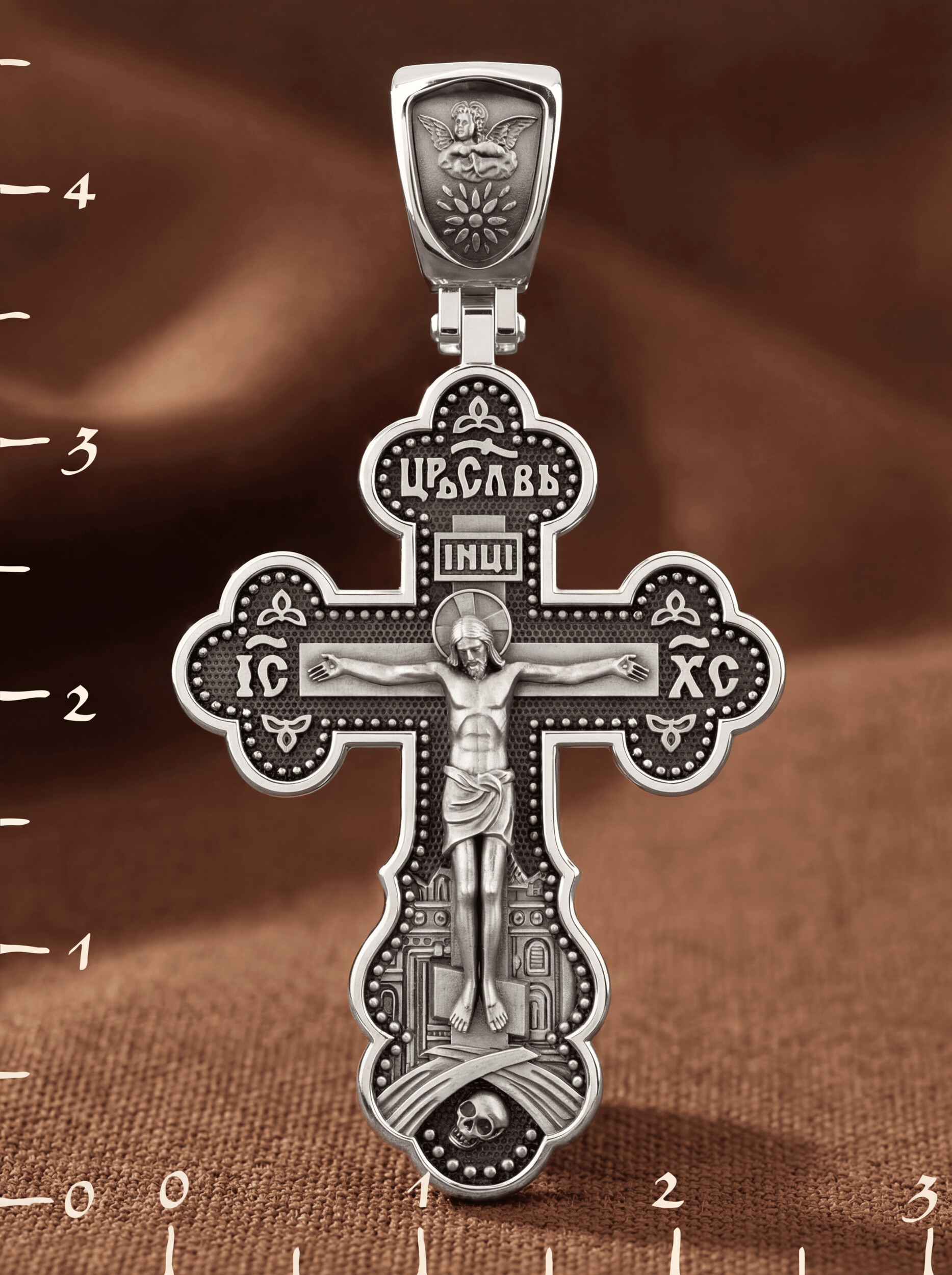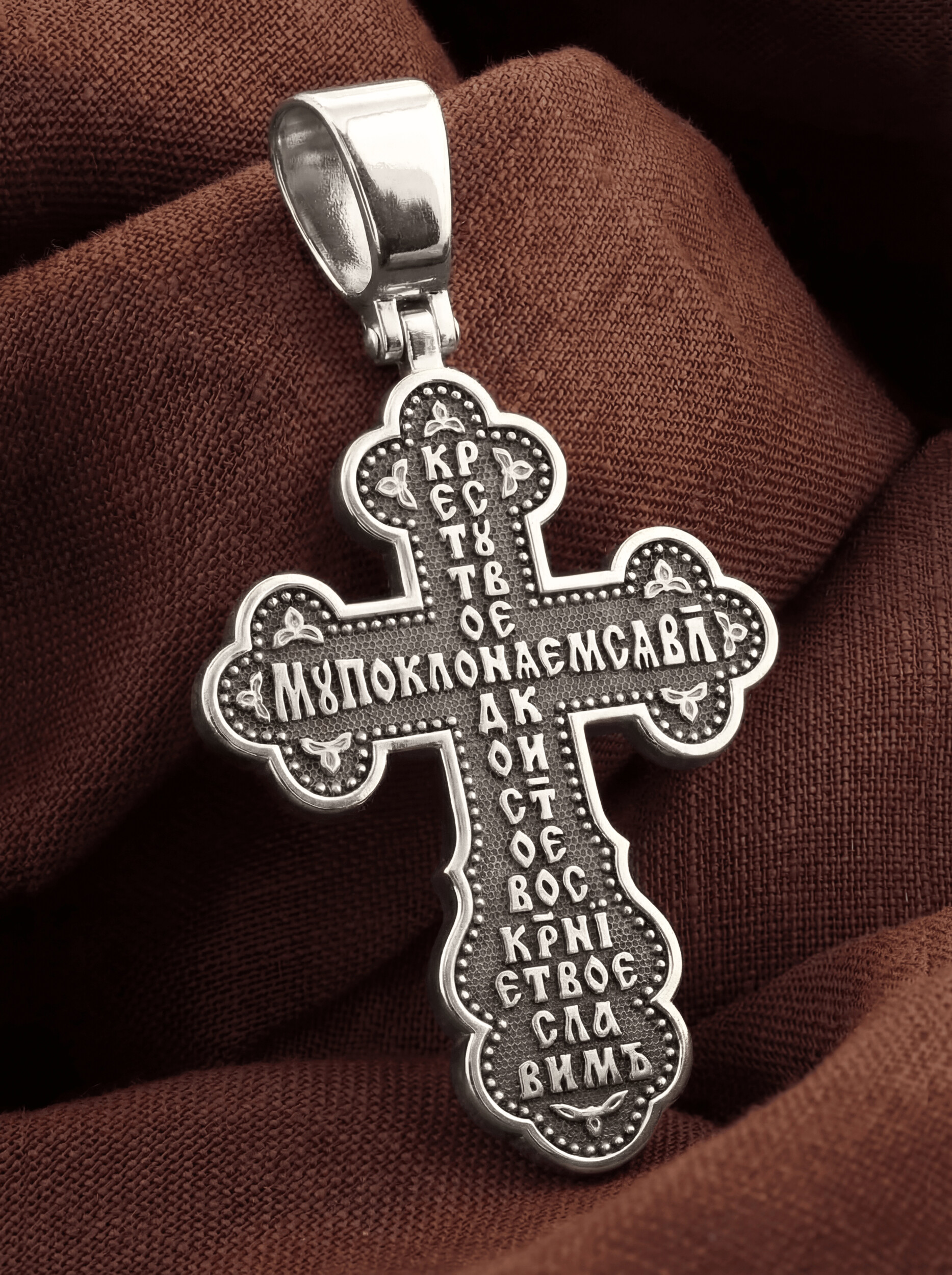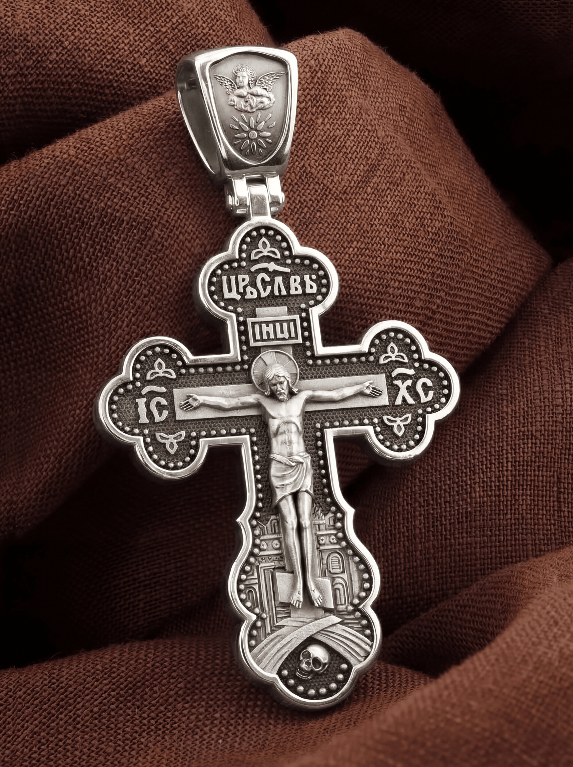 На лицевой стороне креста изображено Распятие, потому что это орудие казни Иисус Христос сделал орудием победы над грехом и смертью. Своими страданиями Он искупил грехи человечества, умерев и сошествовав во ад, победил сатану, освободил души праведников от вечной смерти и открыл им небесные врата рая. Жертва Христа сделала возможным спасение для каждого человека. На православном кресте Христос не умирает, а свободно простирает руки, ладони Иисуса открыты, будто он хочет обнять все человечество, даря им свою любовь и открывая путь к вечной жизни. Над титлом видим слова «ЦРЬ СЛВЫ» — Царь Славы. Верхняя перекладина символизирует собой табличку с надписью «IHЦI» — Иисус Назарянин Царь Иудейский. Возле перекладины пишется сокращенно имя Спасителя «IC XC» — Иисус Христос. Возвышение, на котором стоит Крест, символизирует гору Голгофу, на которой произошло Распятие. У подножия Креста изображают прах Адама, обозначенный черепом.