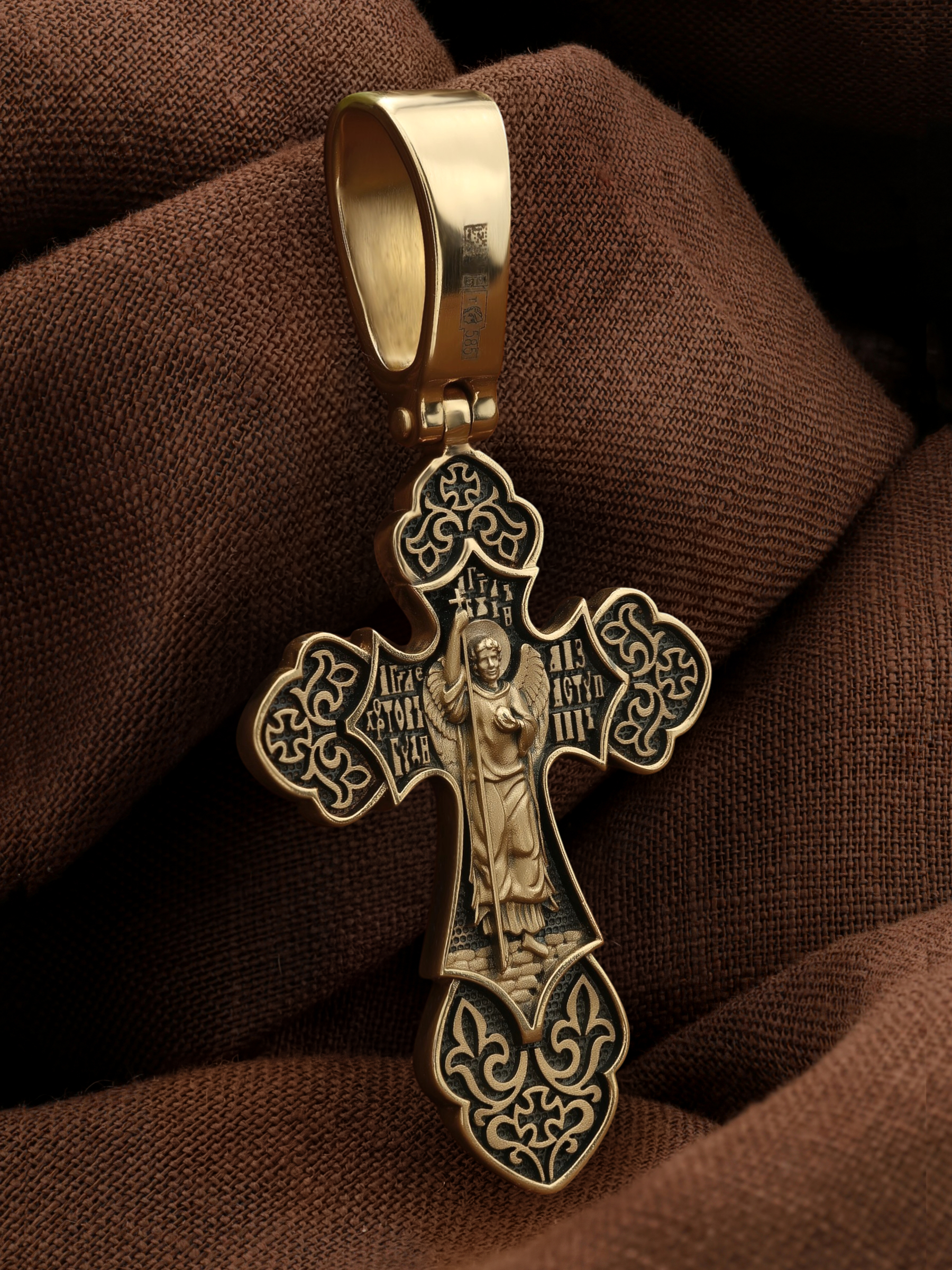 Крест с рельефным изображением Распятия в окружении пышных цветов и ажурного узора, напоминает нам о красоте Райского сада. На лицевой стороне креста изображено Распятие, потому что это орудие казни Иисус Христос сделал орудием победы над грехом и смертью. Своими страданиями Он искупил грехи человечества, умерев и сошествовав во ад, победил сатану, освободил души праведников от вечной смерти и открыл им небесные врата рая. Жертва Христа сделала возможным спасение для каждого человека. На православном кресте Христос не умирает, а свободно простирает руки, ладони Иисуса открыты, будто он хочет обнять все человечество, даря им свою любовь и открывая путь к вечной жизни. Верхняя перекладина символизирует собой табличку с надписью «IHЦI» — Иисус Назарянин Царь Иудейский. Над перекладиной пишется словосочетание «СЫН БОЖИЙ», ниже перекладины добавляется: «НИКА» (греч. — Победитель) и сокращенное имя Спасителя «IC XC» — Иисус Христос. Возвышение, на котором стоит Крест, символизирует гору Голгофу, на которой произошло Распятие. У подножия Креста изображают прах Адама, обозначенный черепом.