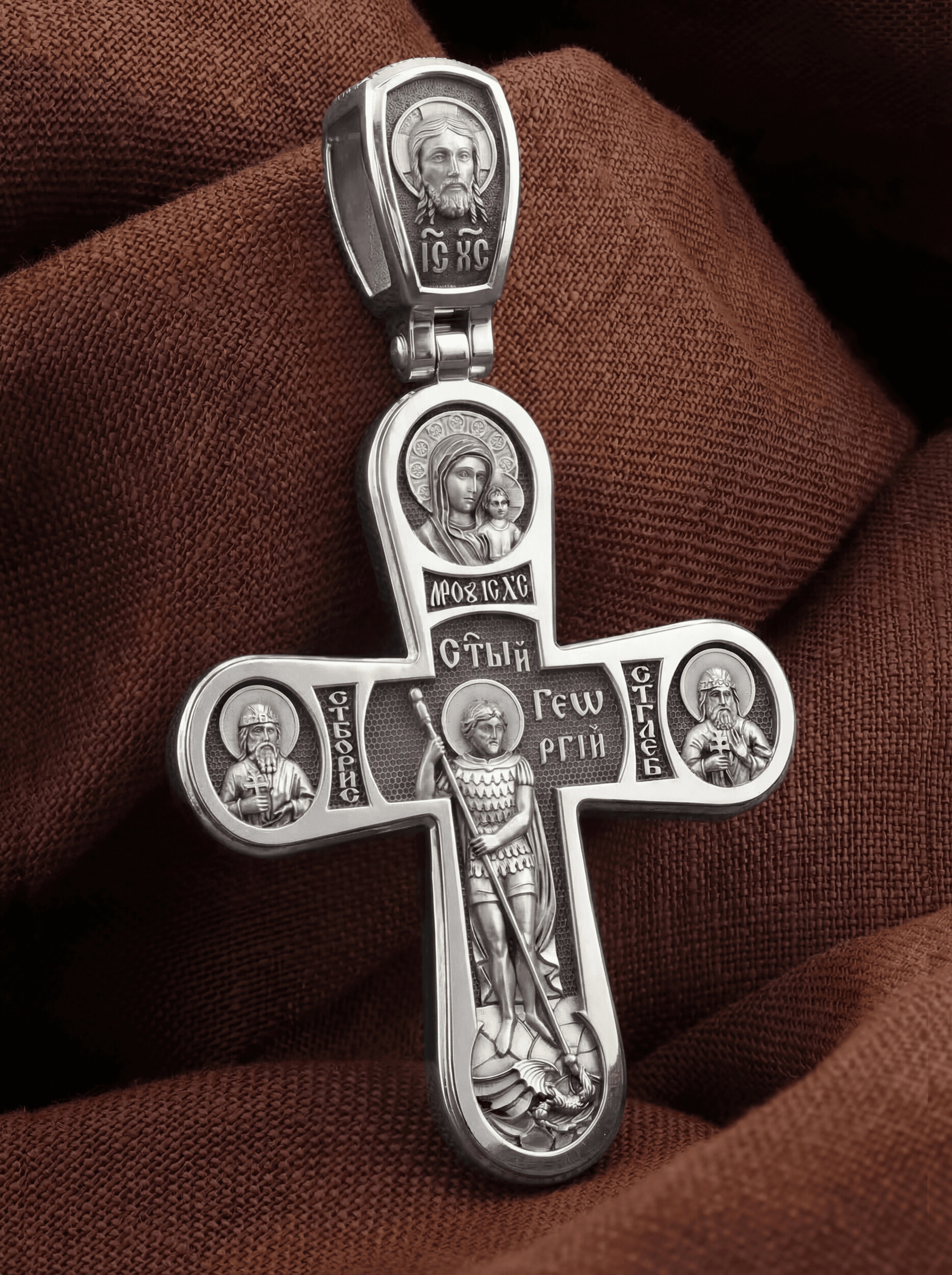 На кулонном кольце помещено изображение Спаса Нерукотворного — образ Спасителя, который Он запечатлел на плате и передал для исцеления больному проказой царю Эдессы. Ему придается победное и защитное значение.