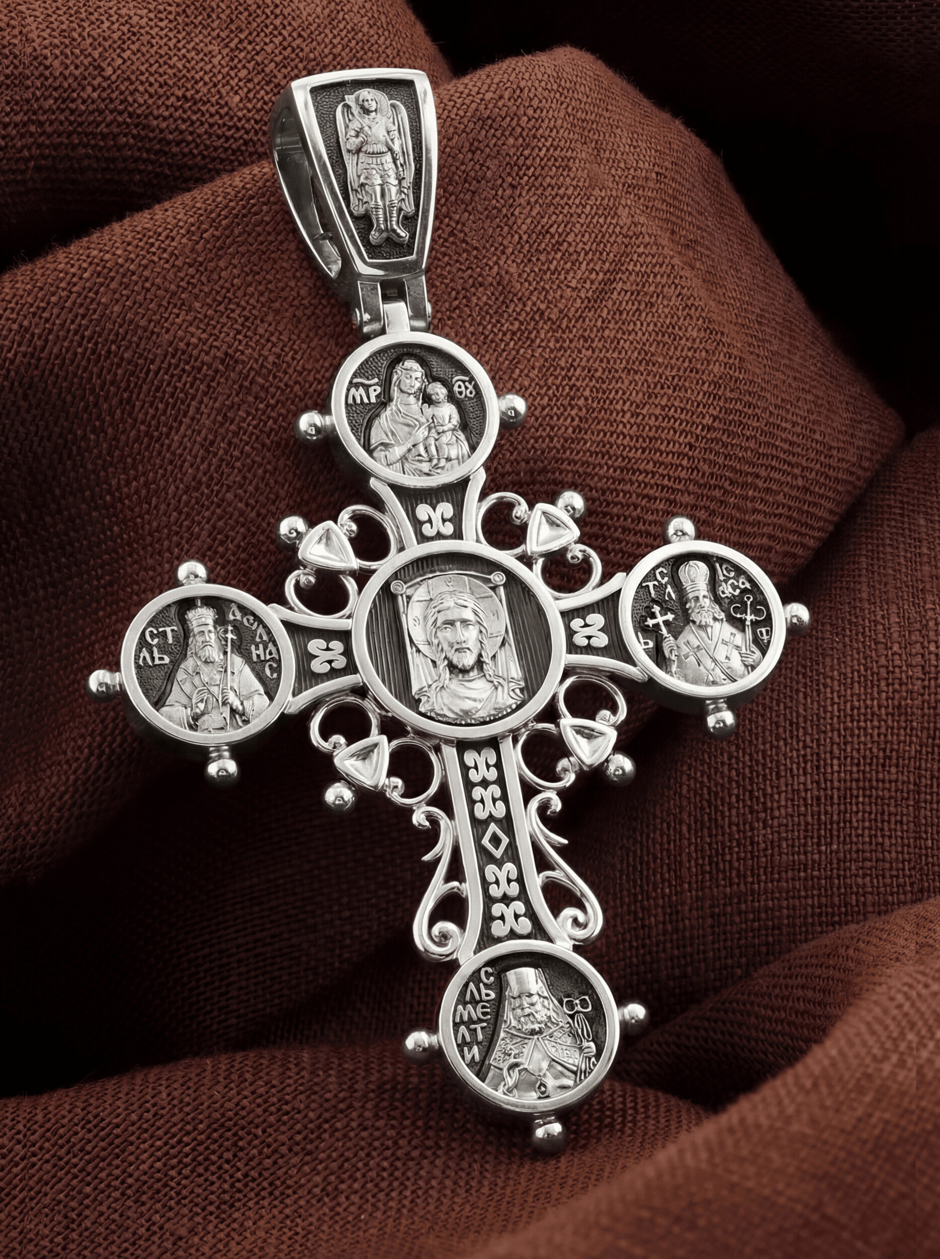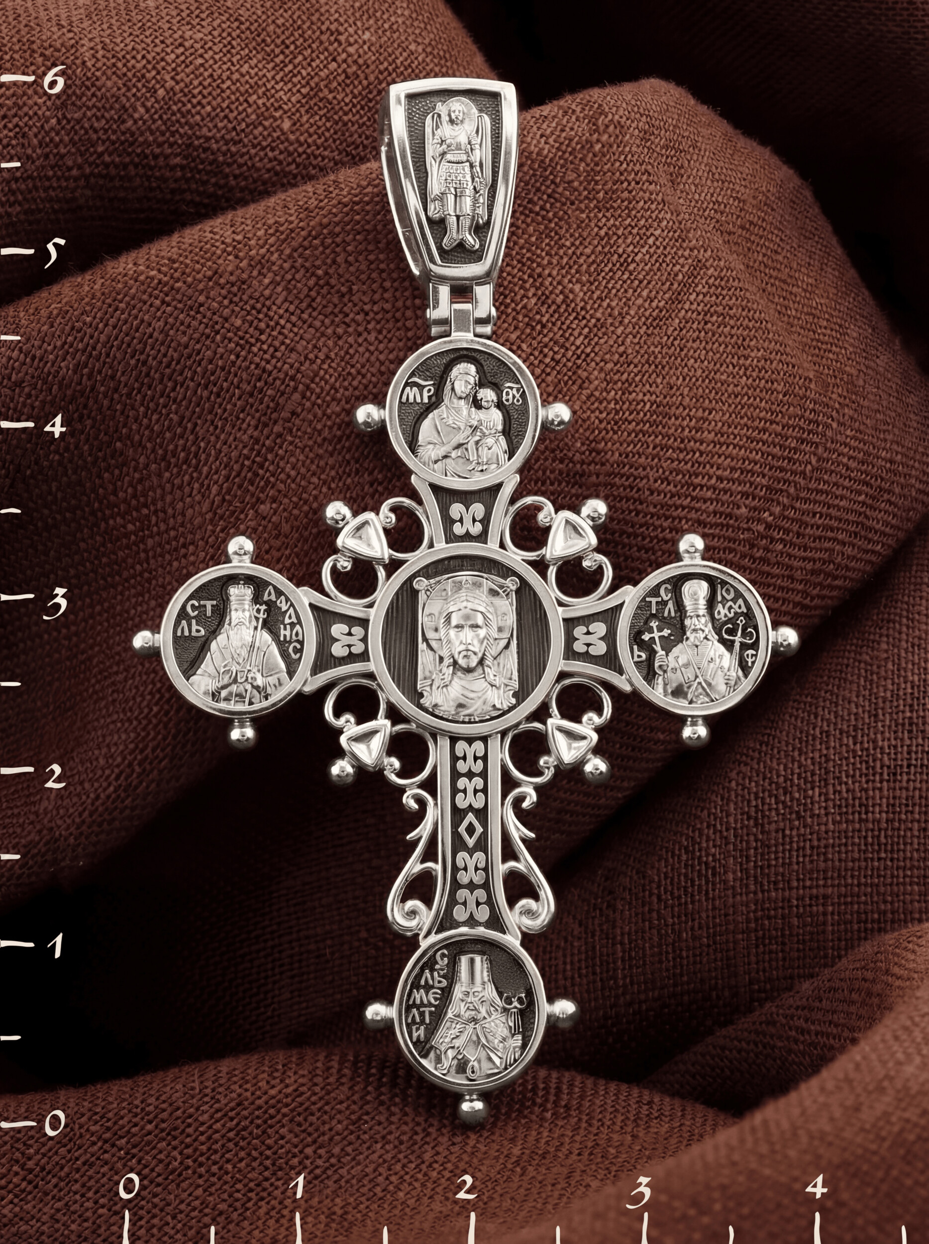 Оборотная сторона креста украшена растительным орнаментом. Помещенный на крест орнамент символизирует жизнедательную силу, животворное тепло креста. В растительный узор, на горизонтальной перекладине, вписано молитвенное славословие: «Спаси и сохрани». Эта надпись означает непрерывную молитву, совершаемую носителем данного креста.