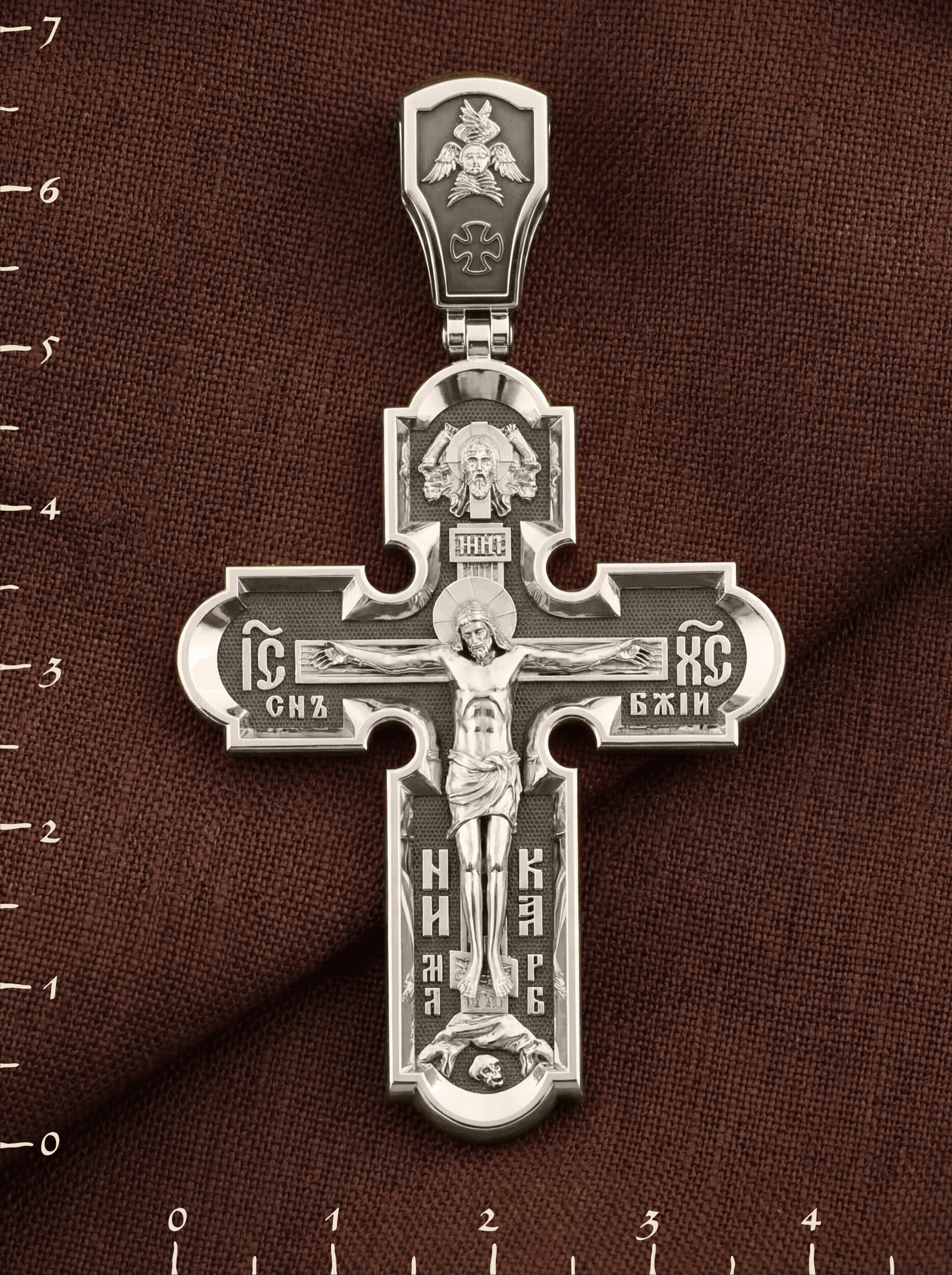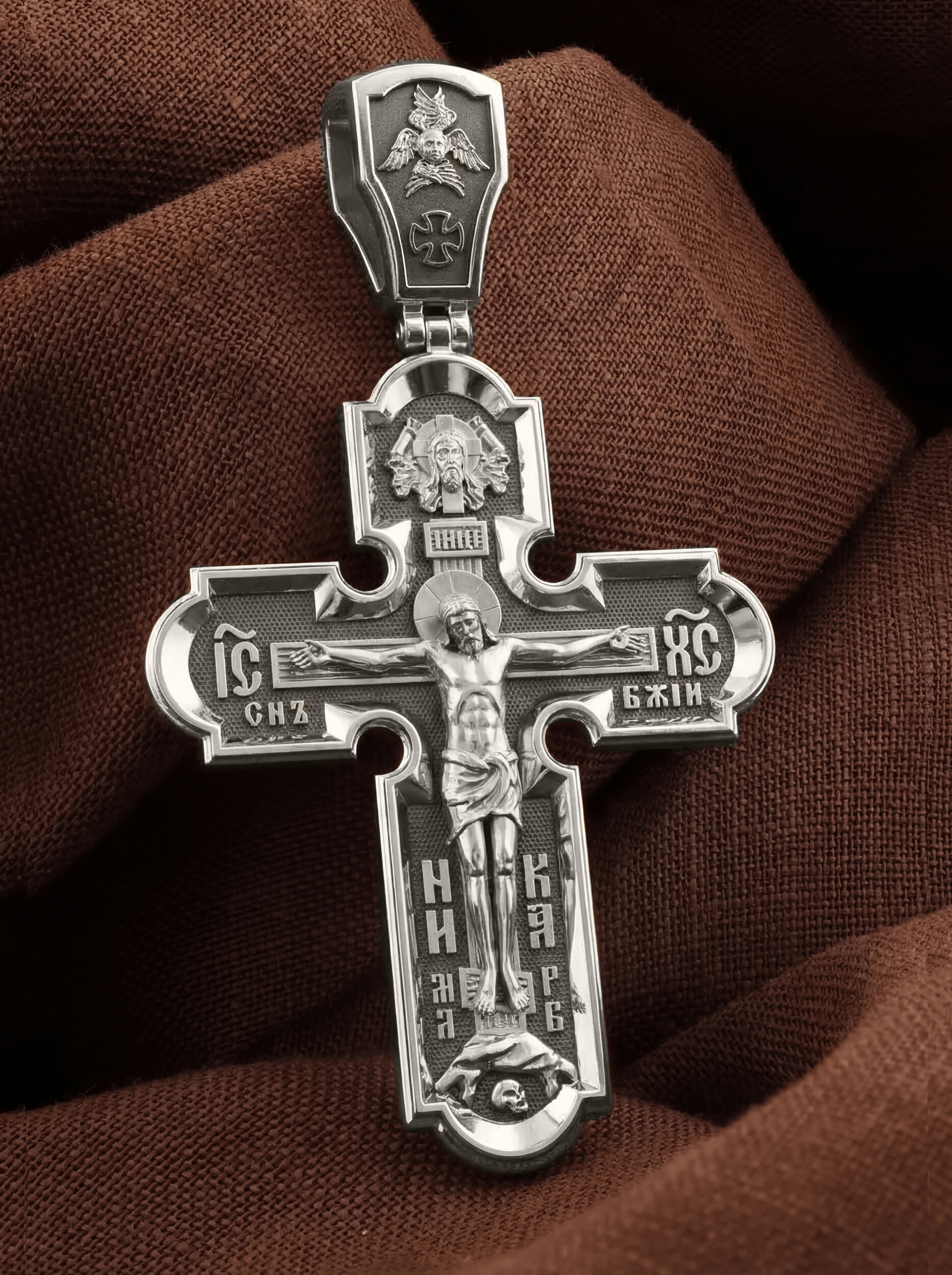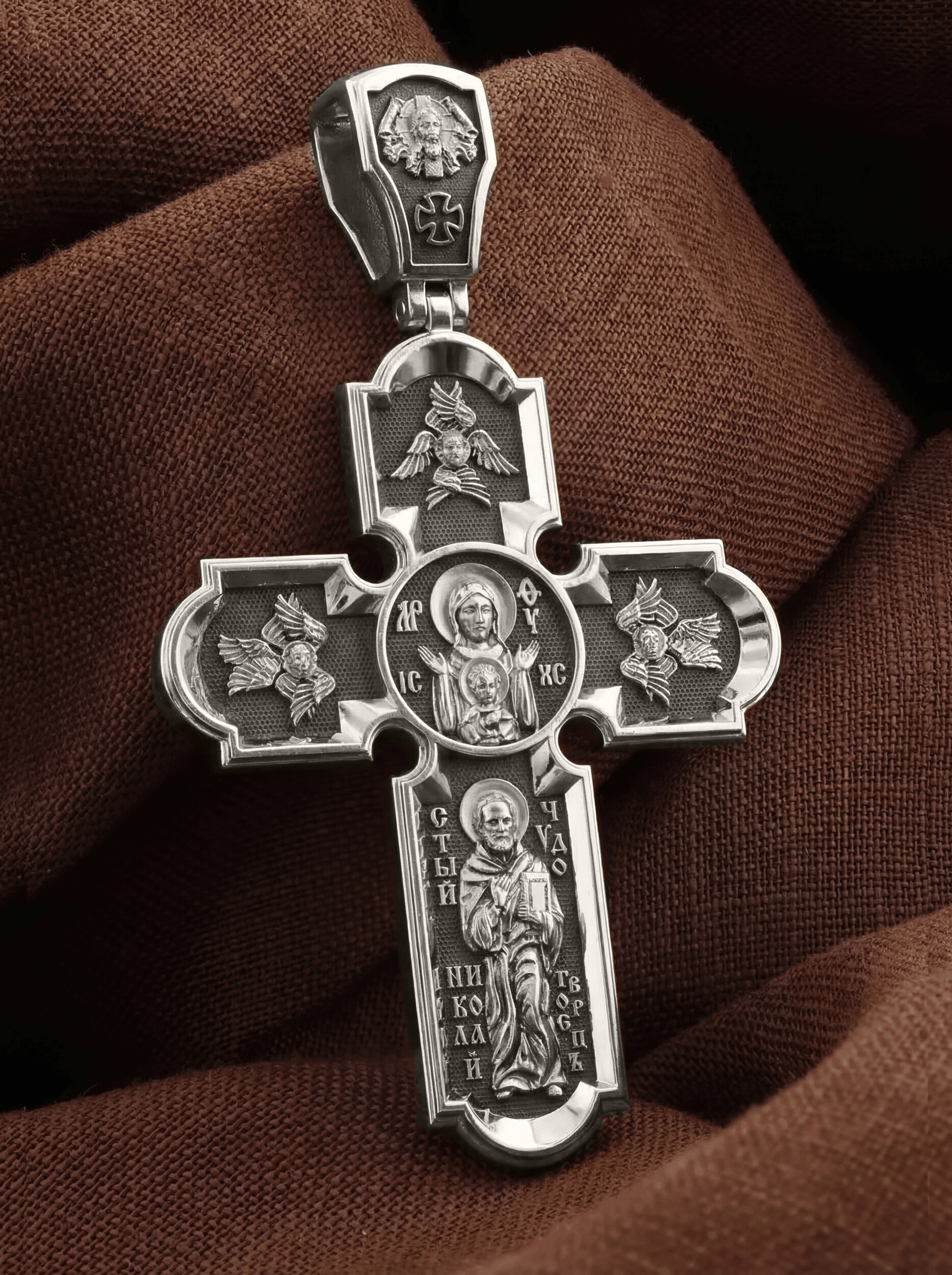 На лицевой стороне нательного креста по традиции изображено Распятие Господа нашего Иисуса Христа. Крест Господень стоит на небольшом каменистом возвышении, символизирующем гору Голгофу, которая обозначена буквами МЛРБ (Место Лобное Рай Бысть). Над головой Господа на поперечной перекладине написано «ИНЦИ», что символизирует табличку, которая была прибита к Кресту, с надписью «Иисус Назорей Царь Иудейский». Этим иудеи хотели посмеяться над Христом, не зная, что распинают истинного Царя всех царей. По сторонам основной перекладины расположены позолоченные рельефные инициалы Христа «ИС ХС». Под перекладиной, по сторонам древа, находится надпись «СЫН БОЖИЙ», а в основании креста — надпись «НИКА» (Победитель).
