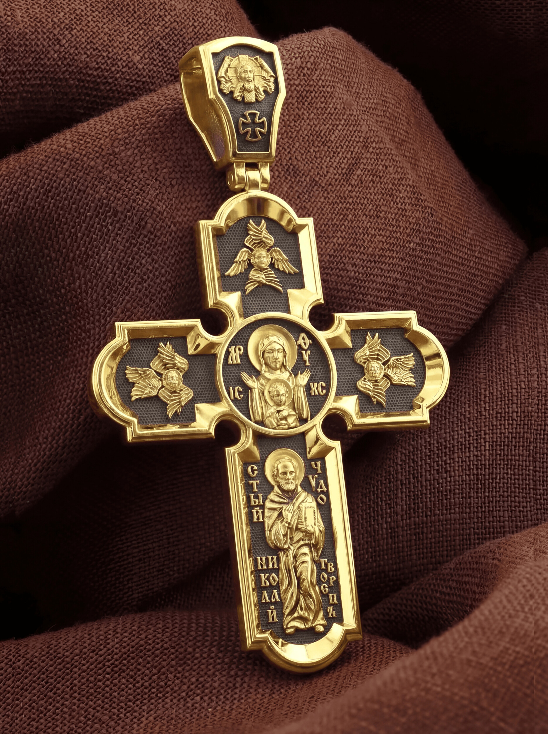 У основания креста в полный рост изображен самый любимый святой Православной Церкви — Николай Чудотворец. Святой почитается как целитель болезней, покровитель путешествующих, особенно по морю, помощник в торговле, учебе, а также в поисках достойного супруга.