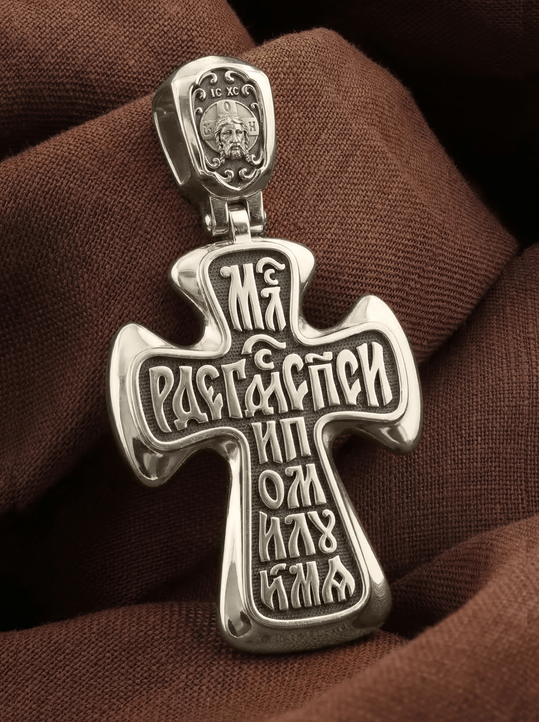 На лицевой стороне креста изображено Распятие Иисуса Христа. Господь представлен свободно покоящимся на кресте с простертыми руками и как бы обнимающим всю Вселенную. Он — Спаситель, искупивший грехи мира, «поправший смертию смерть» и призывающий к Себе «все концы земли». Поэтому рядом с Его образом помещены слова — «НИКА» и «Царь Славы». Эти слова характеризуют Господа как Великого Архиерея, победителя смерти. Также Распятие сопровождается надписями, олицетворяющими Христа. Это святое имя Христа «IC» (Иисус) «ХС» (Христос), и словосочетание «СЫН БОЖИЙ».