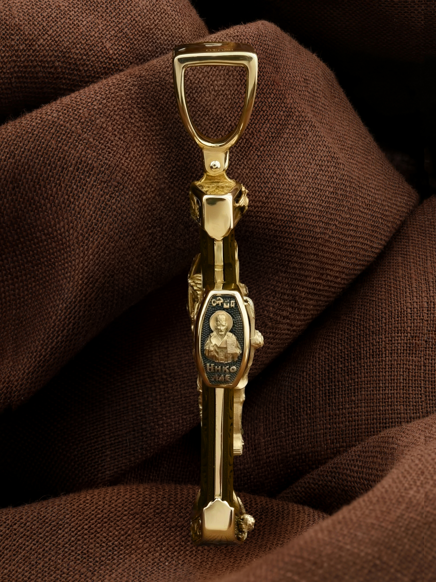 На торце изделия с левой стороны помещена икона Святого Николая Чудотворца — самый почитаемый в Православной Церкви, которого еще называют Николай Угодник за то, что он угодил своей жизнью Богу. Николай Чудотворец, помощник в делах, покровитель учащихся, утешитель обиженных и нуждающихся, целитель самых страшных и тяжелых недугов, предстатель и молитвенник за людей перед Богом. Также Святитель Николай Чудотворец известен своими молитвами за путешественников, когда непрестанный ветер и бушующие волны утихают и корабль заходит в спокойную гавань. На торце изделия с правой стороны — икона Святого Иоанна Крестителя. Святой Иоанн был последним пророком Израиля. Он призывал к покаянию, предвозвещая приближение Царствия Небесного (Мф. 3, 2), и удостоился стать Крестителем Христа. Иисус Христос говорит о нем: «Сей есть о котором написано: «Вот, Я посылаю Ангела Моего пред лицем Твоим, который приготовит путь Твой пред Тобою» (Лк. 7, 27). И еще: «Из рожденных женами нет ни одного пророка больше Иоанна Крестителя» (Лк. 7, 28).