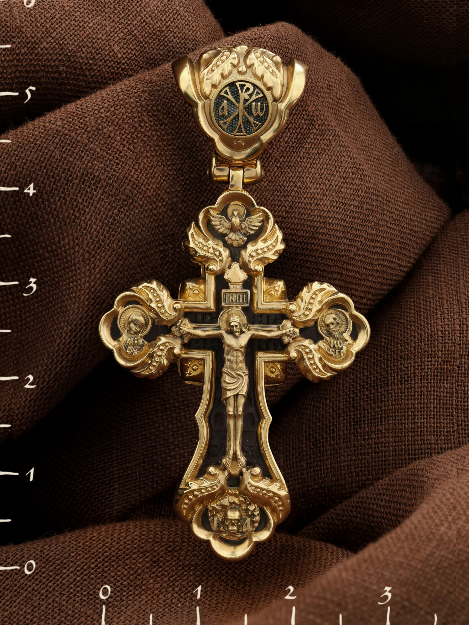На лицевой стороне креста изображено Распятие Господа и Спасителя нашего Иисуса Христа. Крест- символ спасения и искупления рода человеческого, знамение победы над смертью и адом. Иисус Христос, как искупительная жертва освобождения человечества от власти греха, умер крестной смертью и в третий день воскрес. На верхней табличке, выше головы Иисуса, расположена надпись, составленная Понтием Пилатом — «ИНЦИ». Она означает «Иисус Назорей, Царь Иудейский». Над перекладиной написано сокращенно имя Спасителя «IC» «XC» — Иисус Христос. Ниже перекладины написано слово «НИКА» (греч. — Победитель). Крест стоит на горе камней, символизирующих Голгофу. В ее основании различается череп и надписи «Г.А.» — это голова Адама. Слева от Распятия помещен лик Пречистой Богородицы, скорой помощницы и заступницы рода Христианского. Слева изображен апостол и евангелист Иоанн Богослов, один из ближайших учеников Иисуса Христа. Над Распятием — изображение Духа Святого в виде голубя, сходящего с Небес. На кулонном кольце помещен крест.