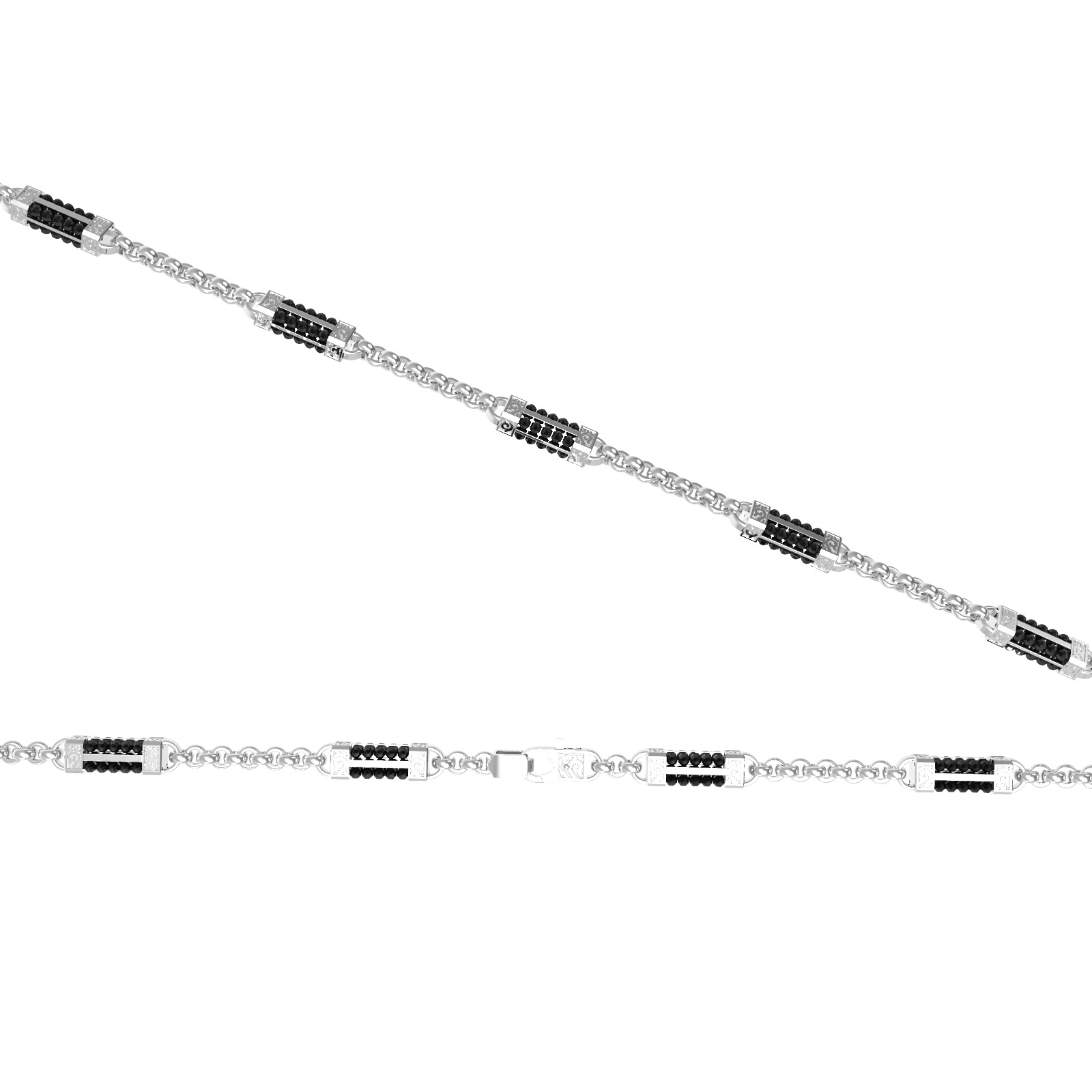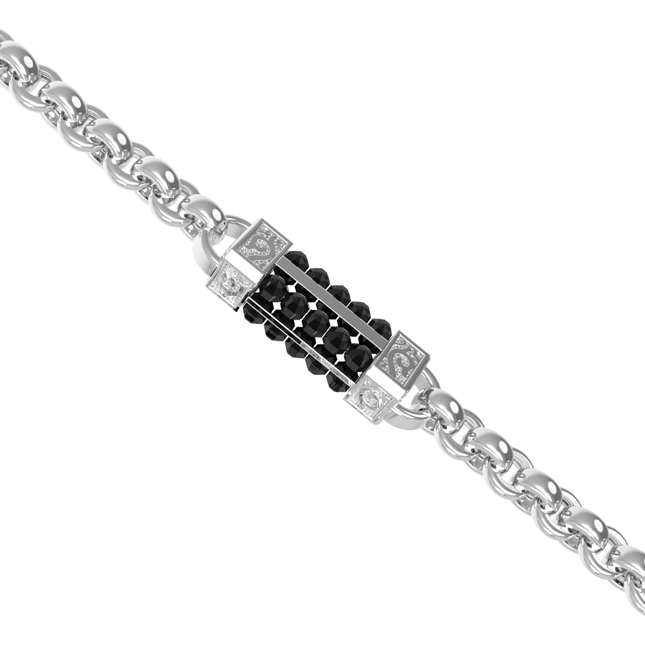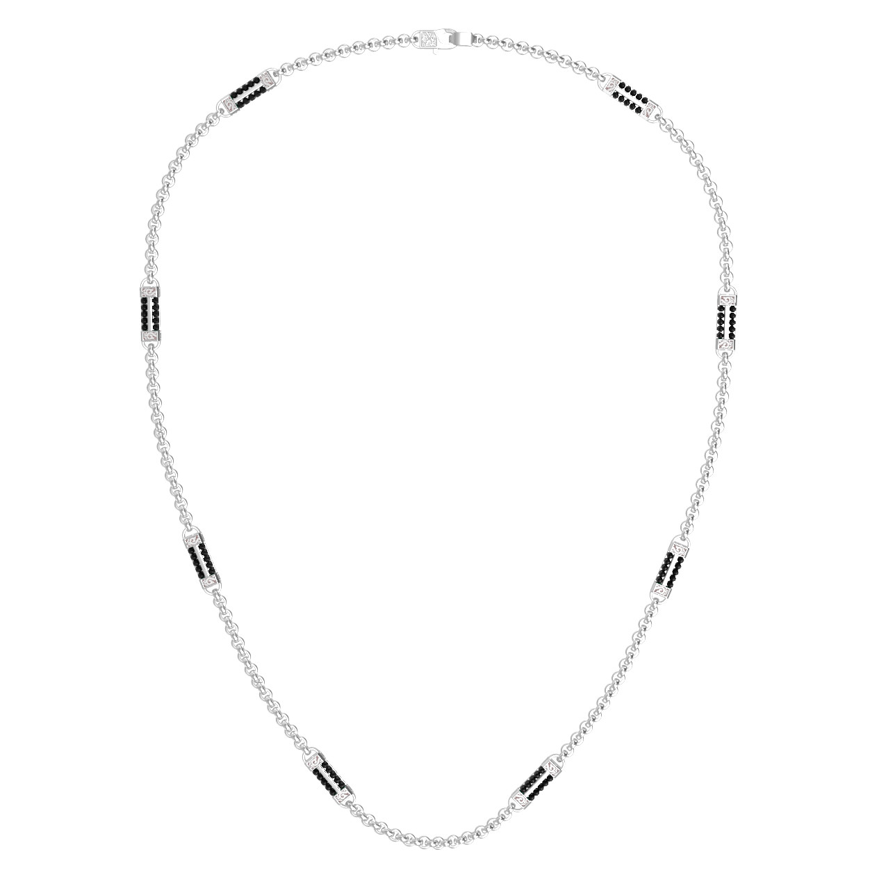 Основным элементом декора выступают вставки из черного оникса, выполненные в форме изящных бусин. Внушительное количество вставок — 720 штук — создает завораживающий визуальный эффект, превращая обычную цепь в настоящий шедевр ювелирного искусства. Контраст черного цвета вставок и светлого оттенка материала делает украшение универсальным дополнением как к строгому деловому костюму, так и к повседневному образу в стиле casual.
