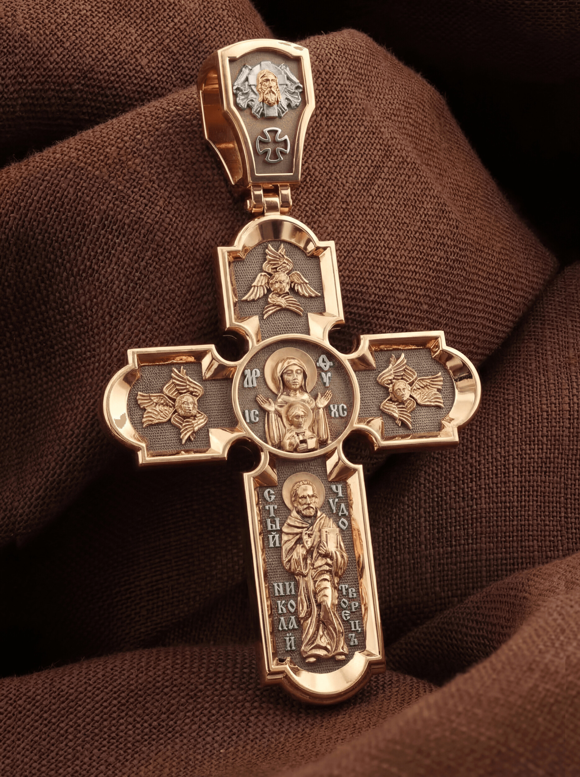 У основания креста в полный рост изображен самый любимый святой Православной Церкви — Николай Чудотворец. Святой почитается как целитель болезней, покровитель путешествующих, особенно по морю, помощник в торговле, учебе, а также в поисках достойного супруга.