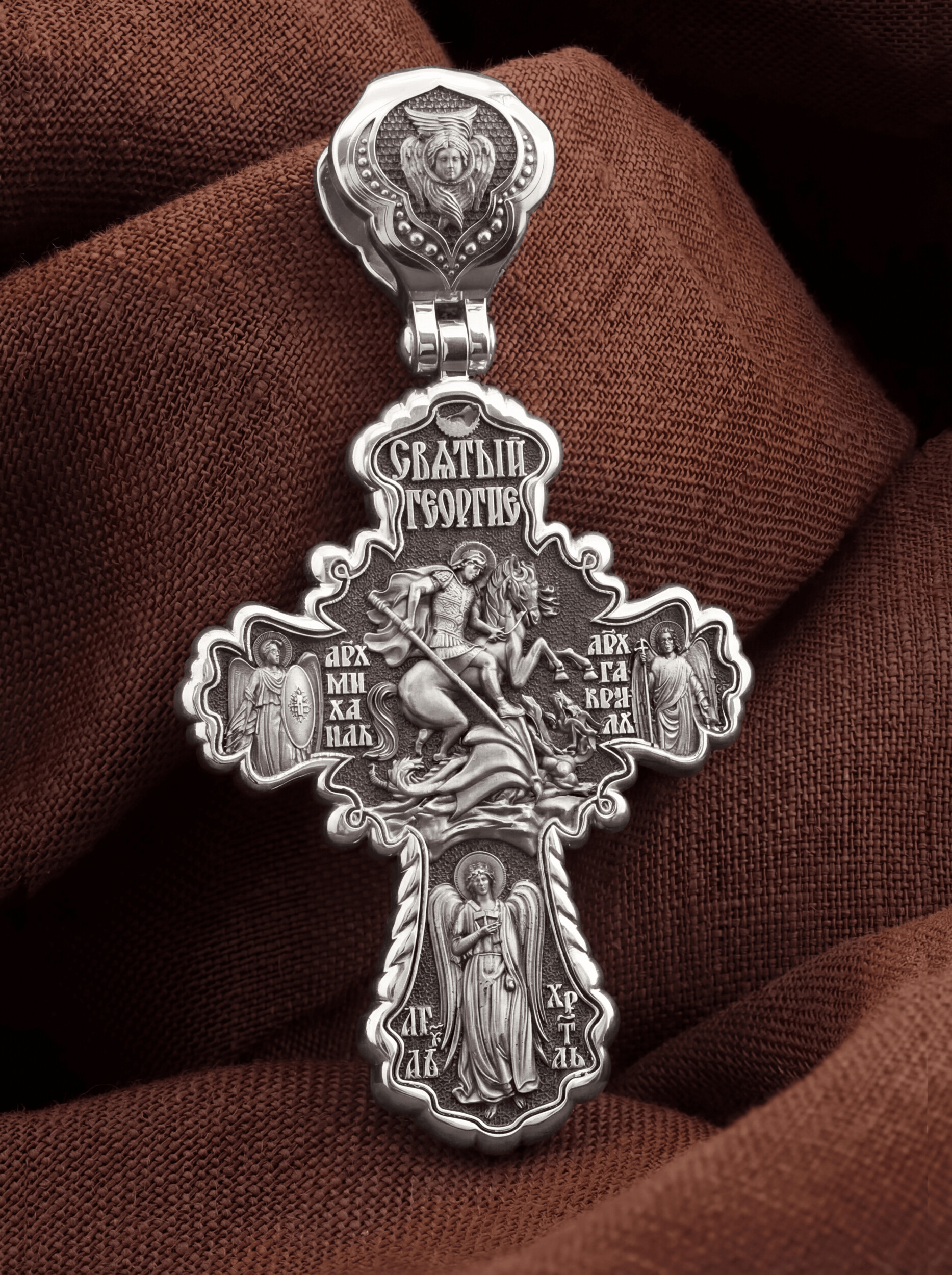 В центре оборотной стороны креста помещено изображение Святого Великомученика Георгия Победоносца. Он изображен как воитель, сидящий на вздыбленном коне и поражающий копьем огнедышащего змея. Змей символизирует собою сатанинские силы. Молитвами вознесенными к Всевышнему и своей непреклонной верой он смог одолеть чудовище. Святой убил змея, спас царскую дочь, принесенную в жертву, и жителей города, их души от влияния дьявола, породив в них надежду и веру в Господа, призывая людей принять христианскую веру. Слева от Святого Георгия изображен Архистратиг Михаил, справа — Архангел Гавриил. Ниже помещен образ Ангела Хранителя. На кулонном кольце изображен шестикрылый Ангел — Серафим.