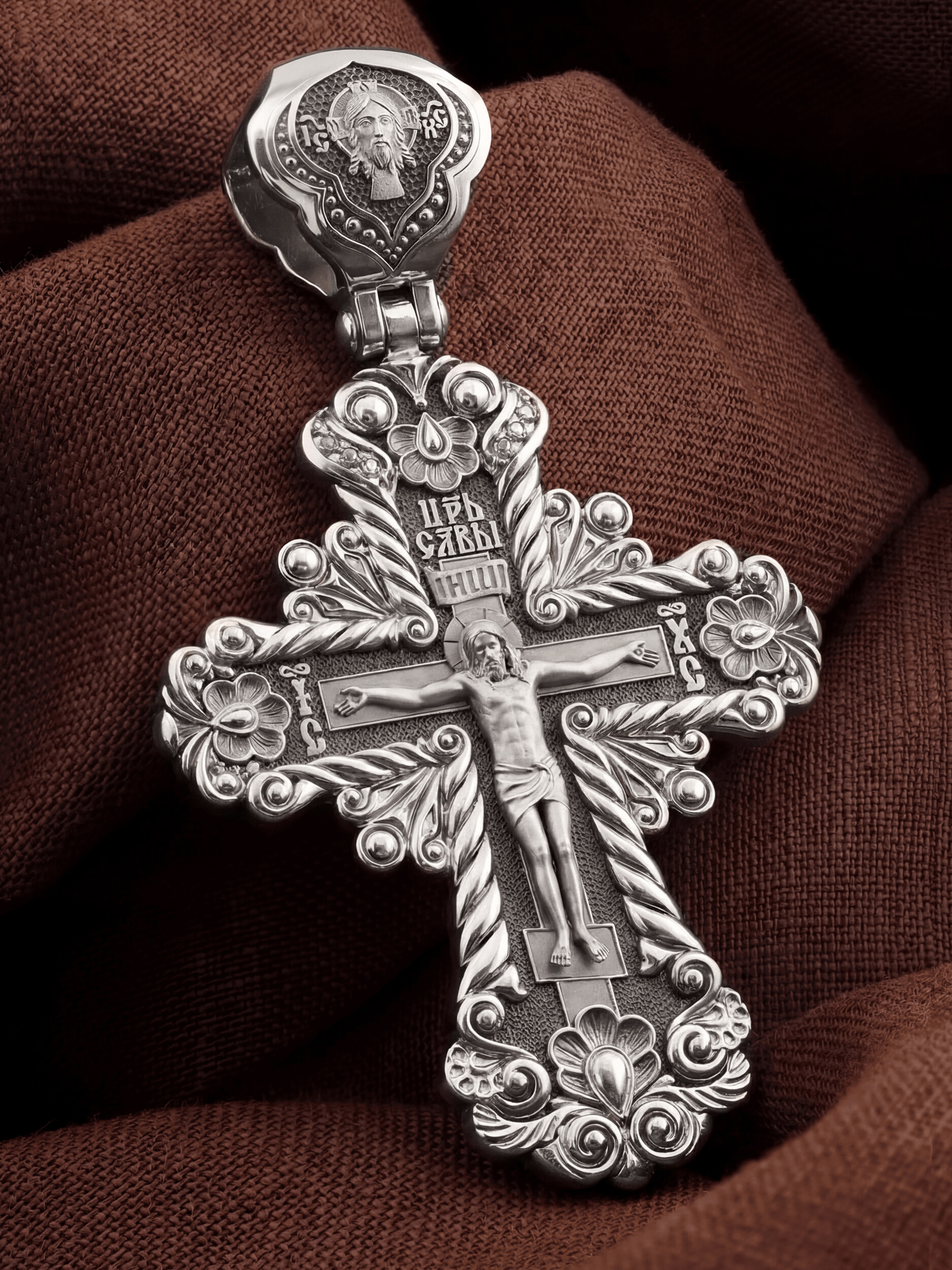 На лицевой стороне креста изображено Распятие Господа и Спасителя нашего Иисуса Христа, отдавшего Себя на смерть, для искупления грехов мира. Крест является символом жертвенной любви Всеблагого Бога к падшим людям, всепобеждающим духовным оружием христиан, основанием и средоточием церковной жизни. Господь сказал: кто хочет идти за Мною, отвергнись себя, и возьми крест свой, и следуй за Мною. (Мк. 8: 34). Над Распятием помещена надпись «Царь Славы». На верхней табличке, выше головы Иисуса, расположена надпись, составленная Понтием Пилатом — «IНЦI». Она означает «Иисус Назорей, Царь Иудейский». Надпись «IC» «ХC», означает Иисус Христос, помещается на разных сторонах поперечной перекладины креста. На кулонном кольце изображен Нерукотворный образ Господа и Спасителя нашего Иисуса Христа, чудесно отпечатавшийся на плате, которым Христос вытер свой лик.