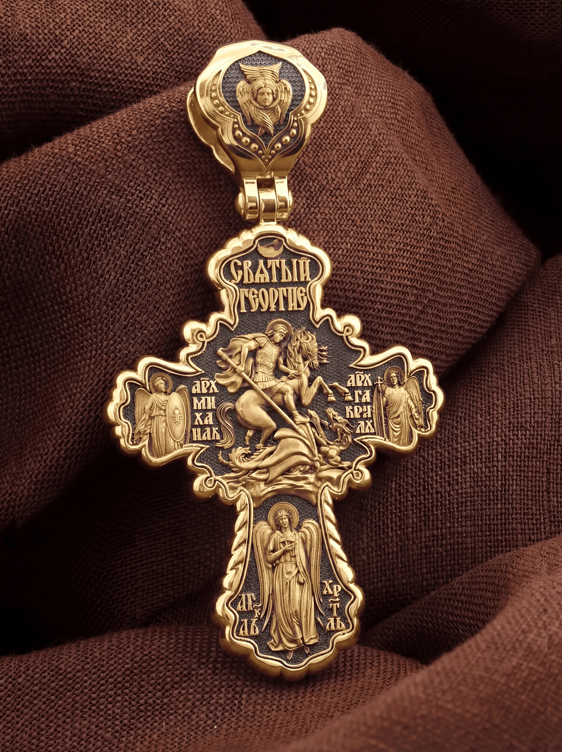 В центре оборотной стороны креста помещено изображение Святого Великомученика Георгия Победоносца. Он изображен как воитель, сидящий на вздыбленном коне и поражающий копьем огнедышащего змея. Змей символизирует собою сатанинские силы. Молитвами вознесенными к Всевышнему и своей непреклонной верой он смог одолеть чудовище. Святой убил змея, спас царскую дочь, принесенную в жертву, и жителей города, их души от влияния дьявола, породив в них надежду и веру в Господа, призывая людей принять христианскую веру. Слева от Святого Георгия изображен Архистратиг Михаил, справа — Архангел Гавриил. Ниже помещен образ Ангела Хранителя. На кулонном кольце изображен шестикрылый Ангел — Серафим.