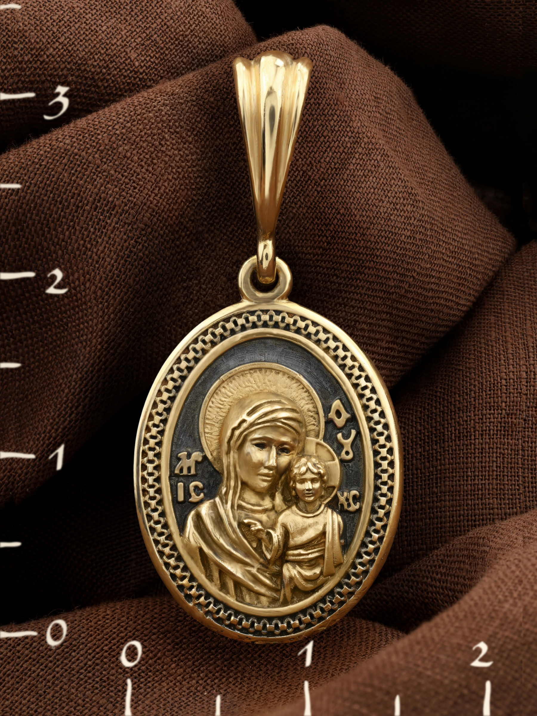 На лицевой части образка изображена Казанская икона Пресвятой Богородицы — одна из самых почитаемых в России. Икона была явлена на пожарище в Казани в 1579 году. В 1904 году святыня была похищена и уничтожена, но чудотворную силу иконы Богородица явила во многих ее списках. Молитва перед Казанской иконой Божьей Матери помогает во всех сложных случаях жизни, во всех печалях, невзгодах, скорбях.