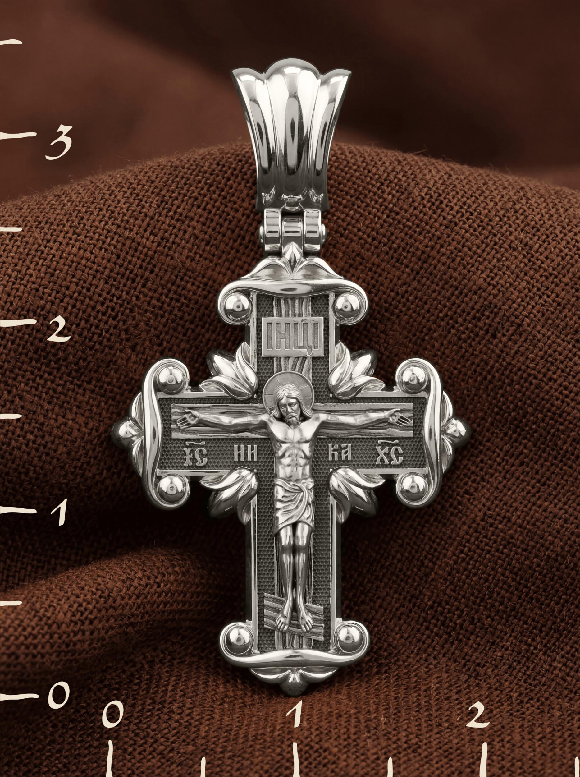 На лицевой стороне креста изображено Распятие Господа и Спасителя нашего Иисуса Христа, отдавшего Себя на смерть, для искупления грехов мира. Крест является символом жертвенной любви Всеблагого Бога к падшим людям, всепобеждающим духовным оружием христиан, основанием и средоточием церковной жизни. Господь сказал: кто хочет идти за Мною, отвергнись себя, и возьми крест свой, и следуй за Мною. (Мк. 8: 34). На верхней табличке, выше головы Иисуса, расположена надпись, составленная Понтием Пилатом — «IНЦI». Она означает «Иисус Назорей, Царь Иудейский». Надпись «IC» «ХC», означает Иисус Христос, помещается на разных сторонах поперечной перекладины креста. Рядом — слово «НИКА», что означает «победитель». На православном кресте Христос не умирает, а свободно простирает руки, ладони Иисуса открыты, будто он хочет обнять все человечество, даря им свою любовь и открывая путь к вечной жизни.