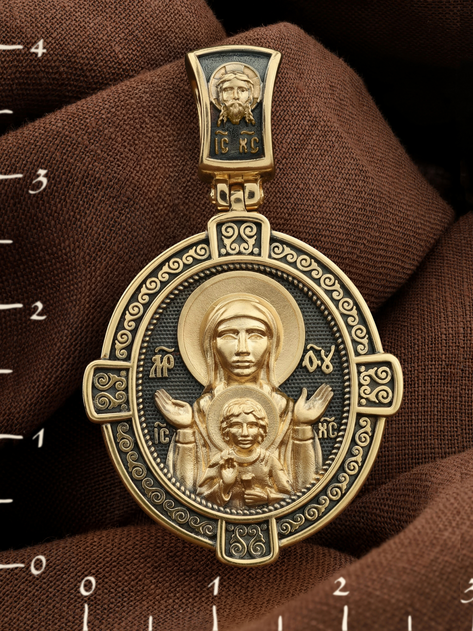 В центр образка помещен образ Божией Матери «Знамение», прославившийся многими чудесами в Новгороде в XII веке. Икона эта чтится как одна из самых великих святынь Русской земли. Молитвенно воздетые руки Богородицы означают заступничество за людей пред Богом. Рядом с Ней — благословляющий Божественный Младенец — Спас-Эммануил.