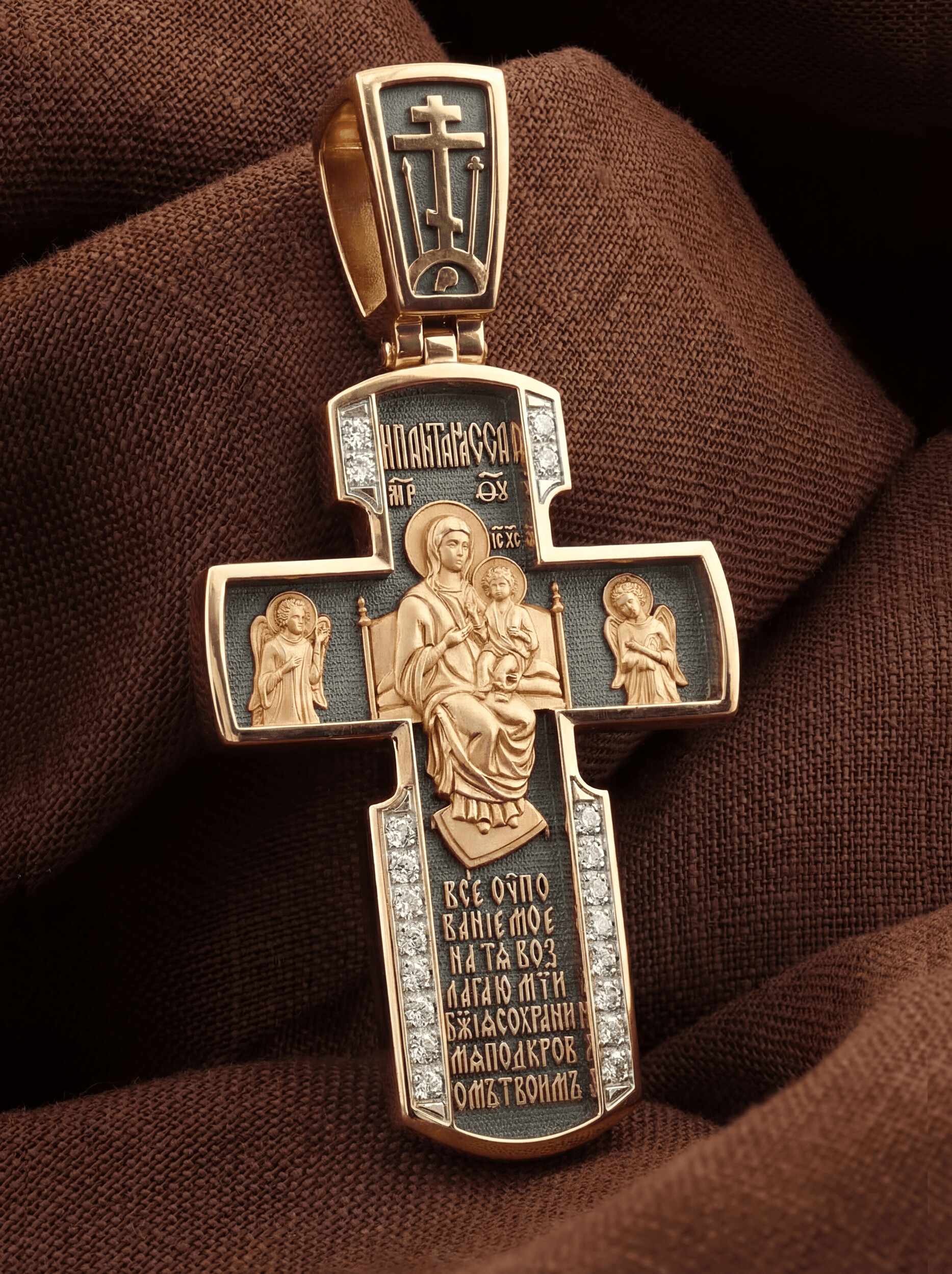 Внизу креста написана молитва обращенная к Божией Матери «Все упование мое на Тя возлагаю, Мати Божия, сохрани мя под кровом Твоим».