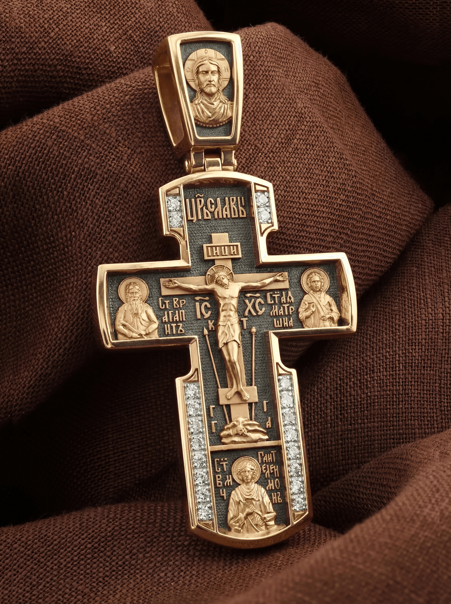 На лицевой стороне креста изображено Распятие Иисуса Христа на Голгофском Кресте, над вершиной которого помещена надпись «Царь Славы». Справа от Распятия помещен образ прославленной святой блаженной Матроны. «Матронушка», — ласково называют эту святую православные за удивительную любовь и помощь, которую она подает всем нуждающимся в ее поддержке. Слева — икона прп. Агапита. Этот святой жил в пещерах Киево-Печерского монастыря в XI веке и бескорыстно врачевал мирян и монахов.