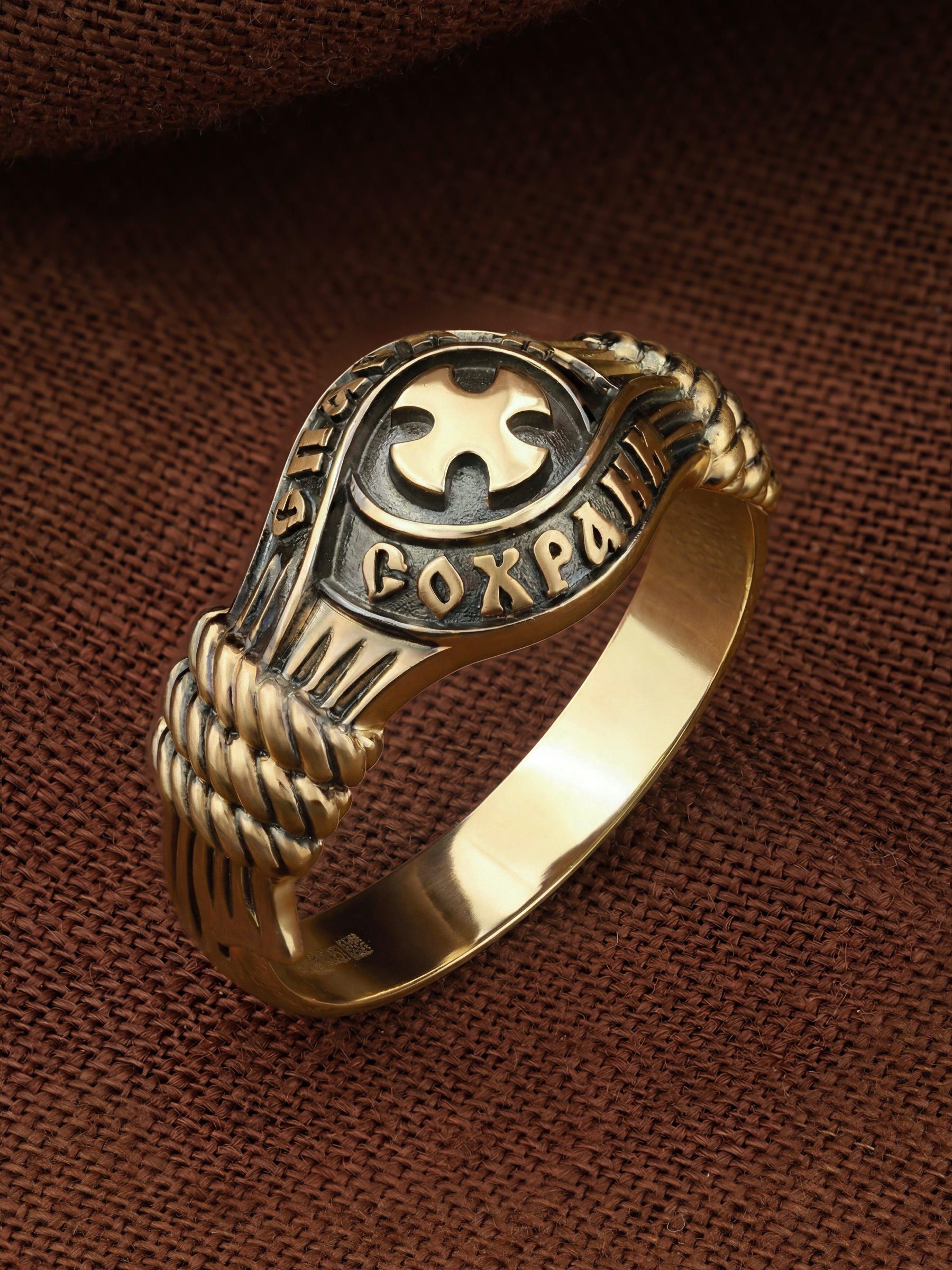В центральной части лицевой стороны кольца изображен Крест. Господь сказал: кто хочет идти за Мною, отвергнись себя, и возьми крест свой, и следуй за Мною. Крест является символом жертвенной любви Всеблагого Бога к падшим людям, всепобеждающим духовным оружием христиан, основанием и средоточием церковной жизни. Иисус Христос, как искупительная жертва освобождения человечества от власти греха, умер крестной смертью и в третий день воскрес. Крест имеет четырехконечную форму с равными балками. Такого типа кресты существовали во многих дохристианских культурах и были в первую очередь использованы Церковью для выражения идеи христианского преобразования мира. Вокруг креста помещена молитва: «Спаси и Сохрани».