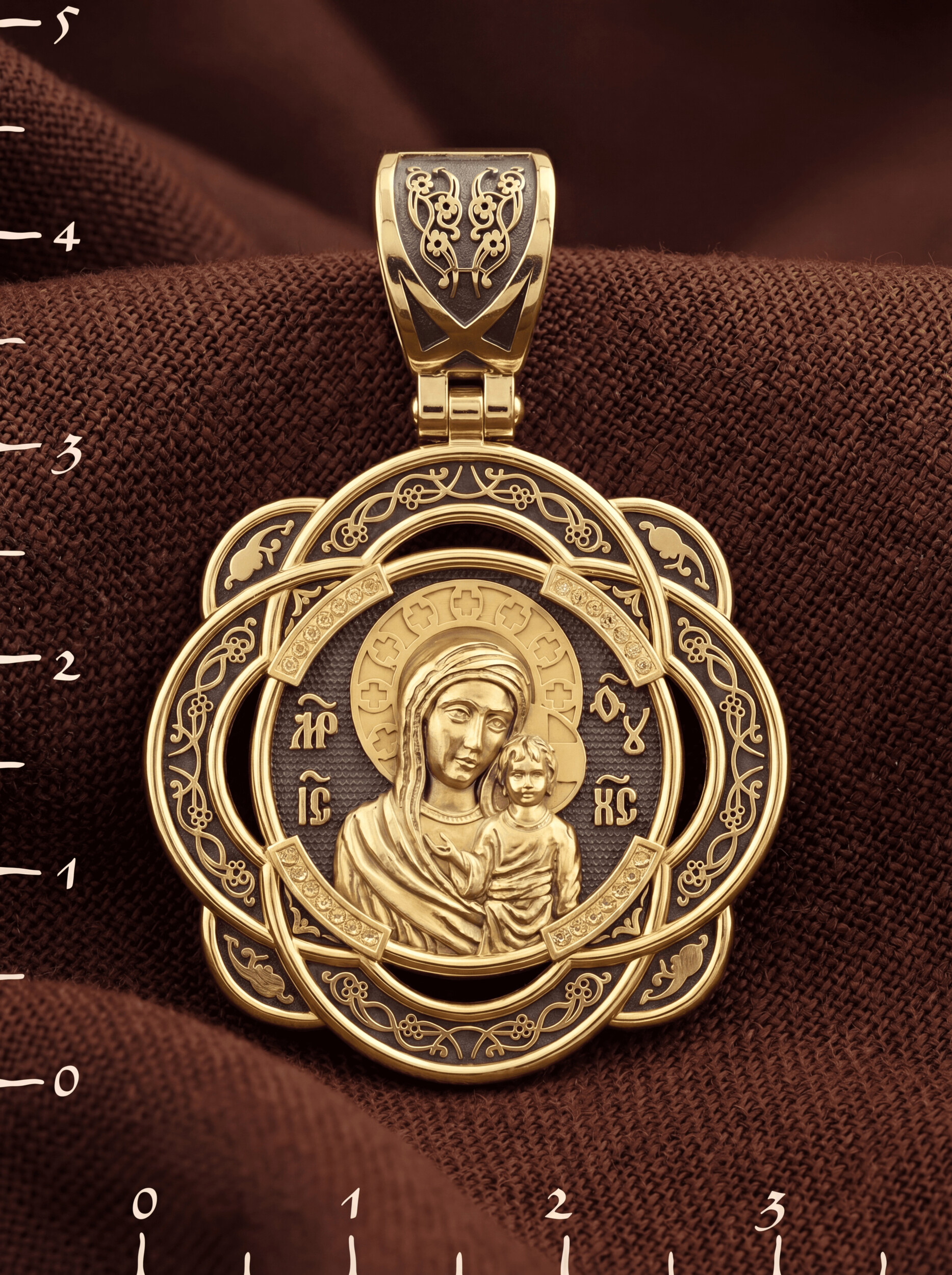 На лицевой части образка изображена Казанская икона Пресвятой Богородицы — одна из самых почитаемых в России. Икона была явлена на пожарище в Казани в 1579 году. В 1904 году святыня была похищена и уничтожена, но чудотворную силу иконы Богородица явила во многих ее списках. Молитва перед Казанской иконой Божьей Матери помогает во всех сложных случаях жизни, во всех печалях, невзгодах, скорбях.