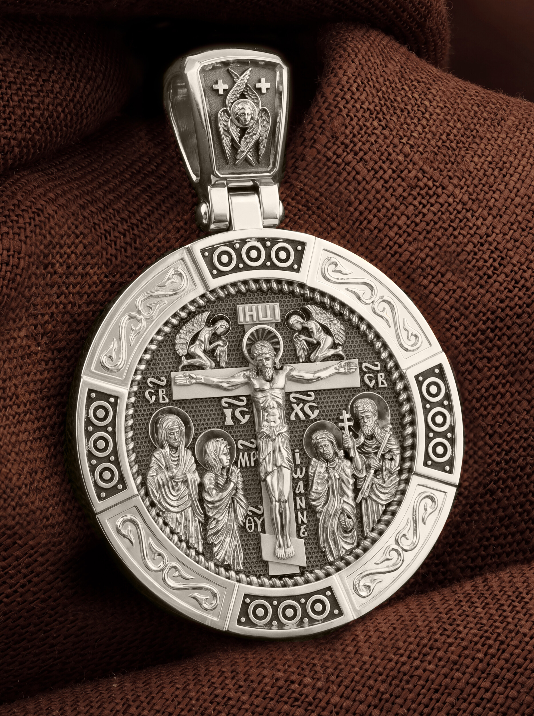 На лицевой стороне образка изображено Распятие Господа Иисуса Христа с предстоящими Ему святыми, которые, по преданию, находились у Креста Господа во время Его казни. Слева — Пресвятая Богородица и св. Мария Клеопова, справа — апостол Иоанн Богослов и мч. Лонгин Сотник.