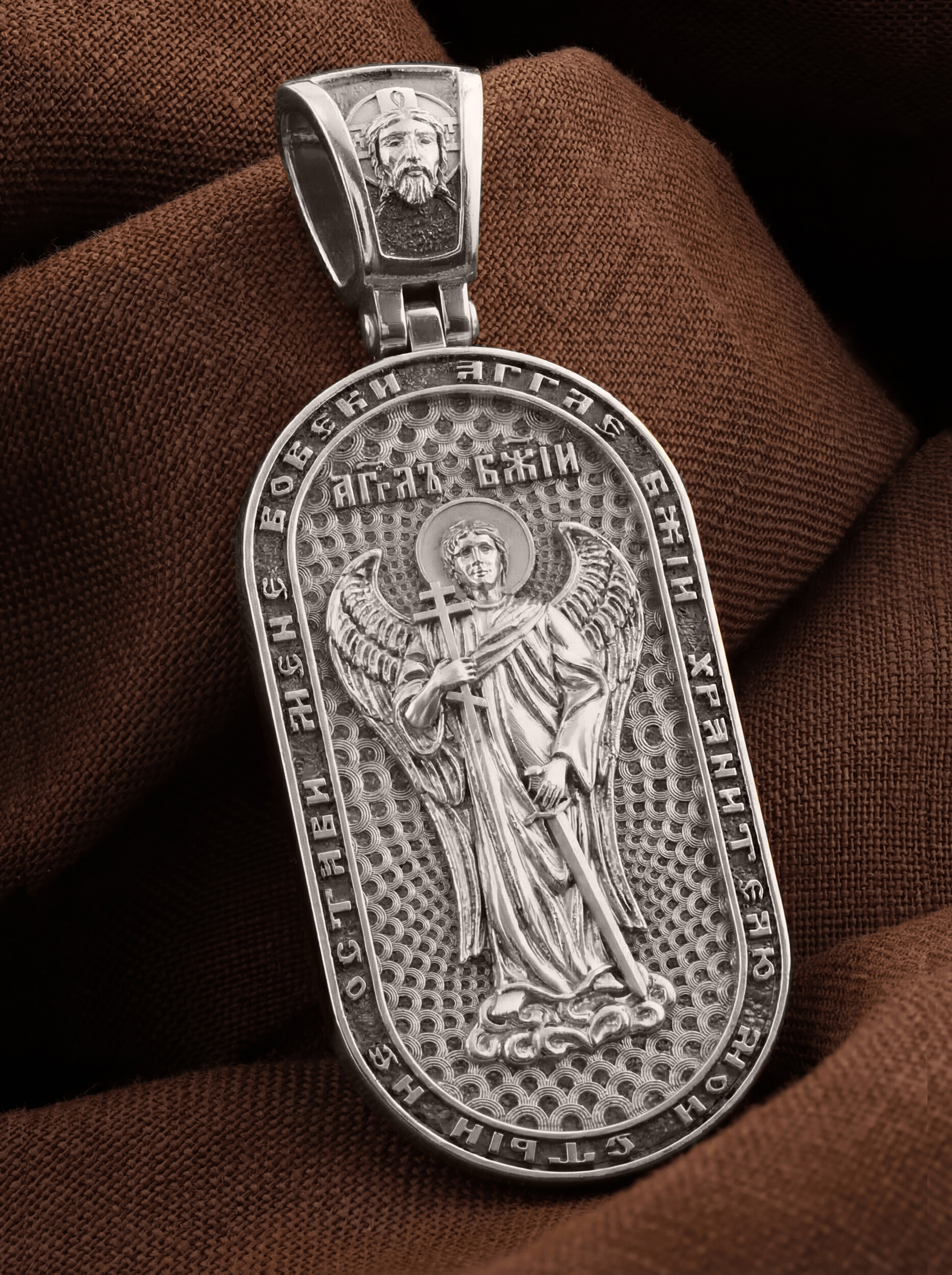 Основой композиции оборотной стороны является изображение Ангела Хранителя, который неотступно находится рядом с человеком, помогая, оберегая и наставляя его, а после смерти сопровождает его душу через мытарства. По контуру написана молитва: «Ангел Божий, хранителю мой святый, не остави мене вовеки». На кулонном кольце изображен Спас Нерукотворный — Символ вочеловечившегося Божества.
