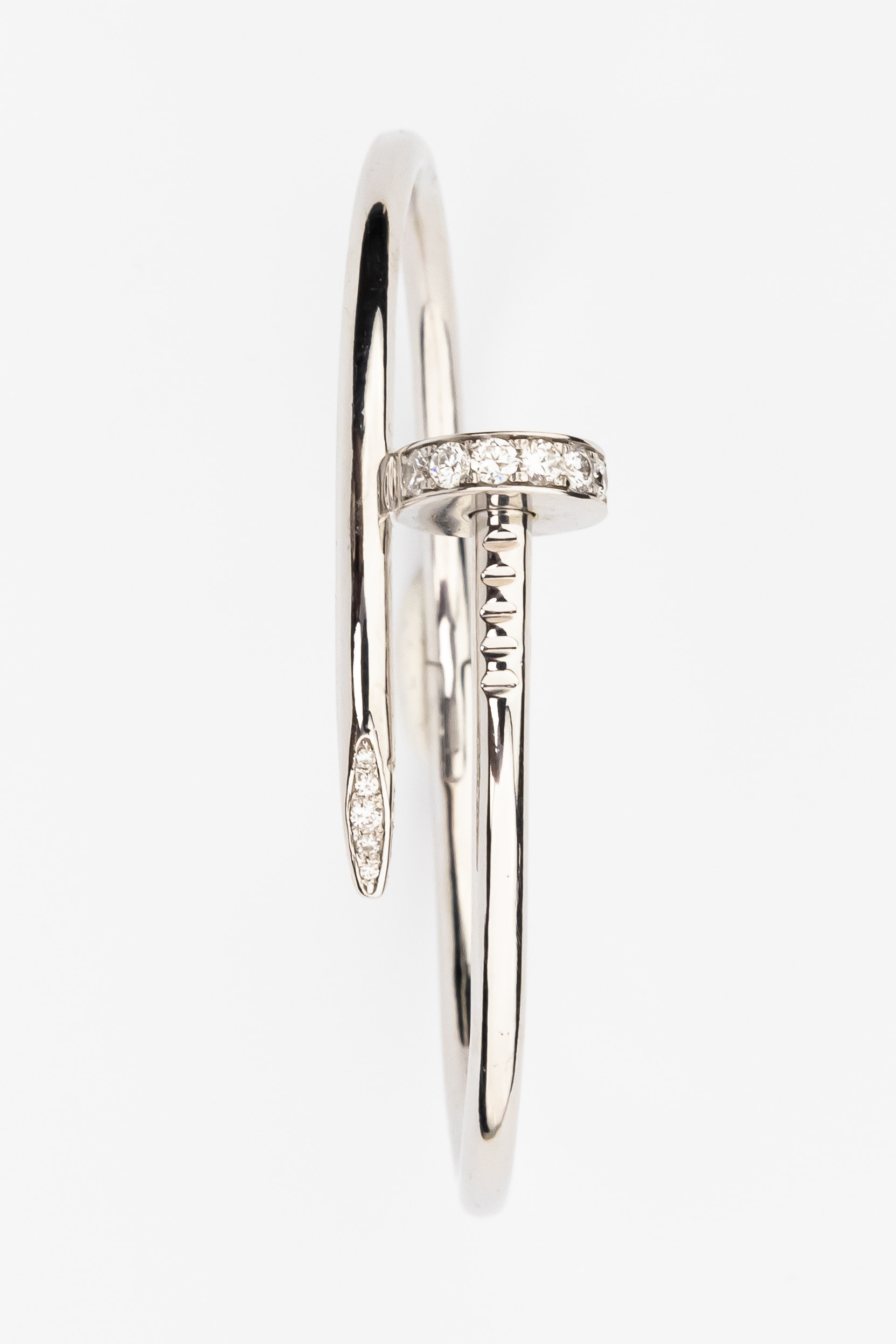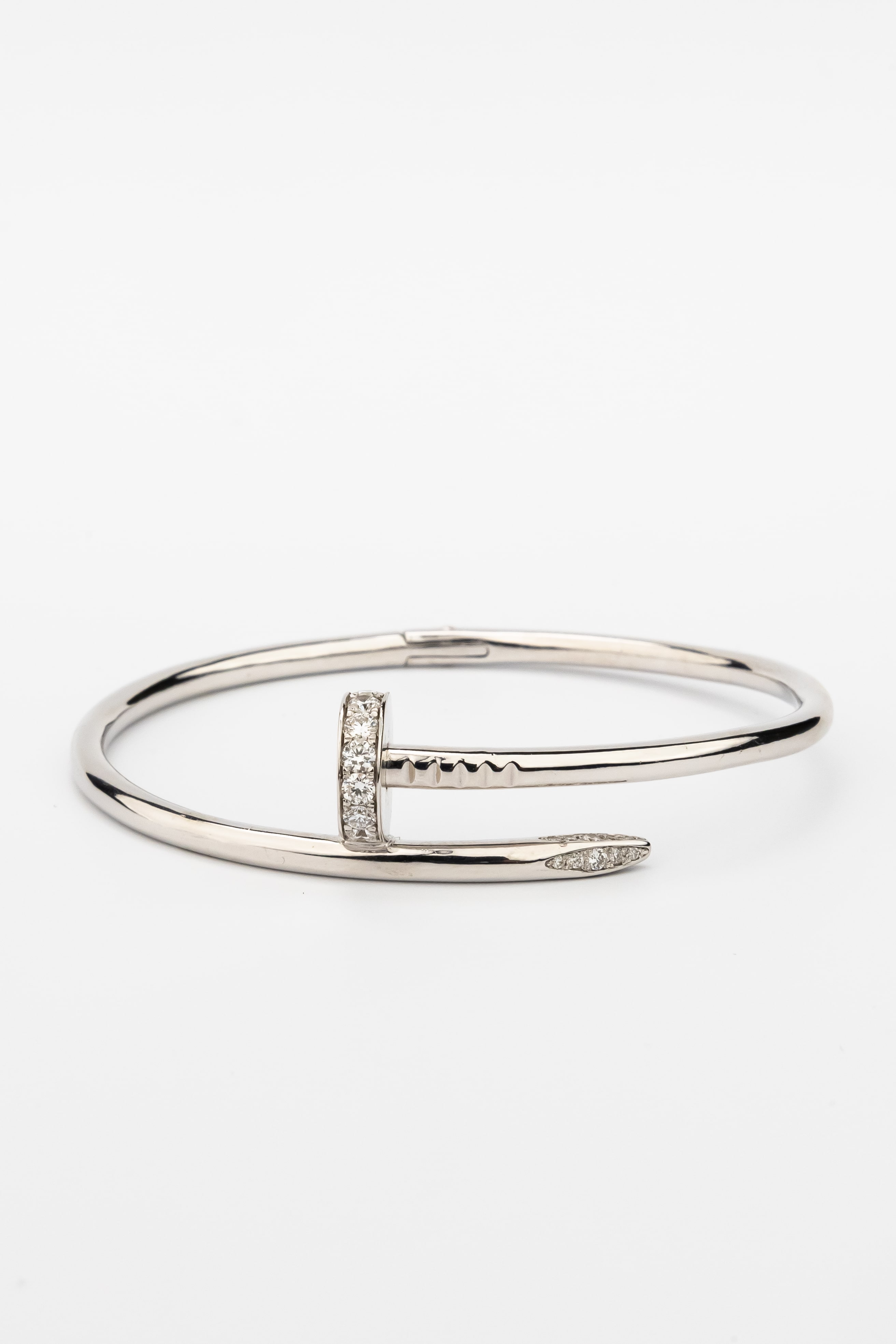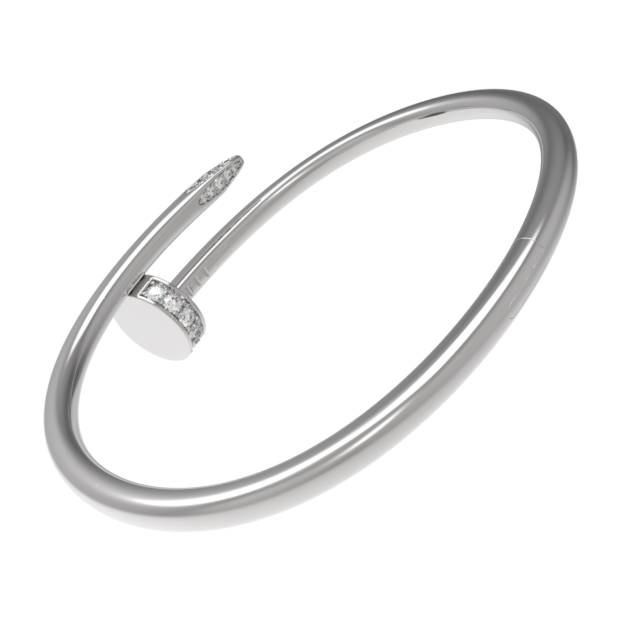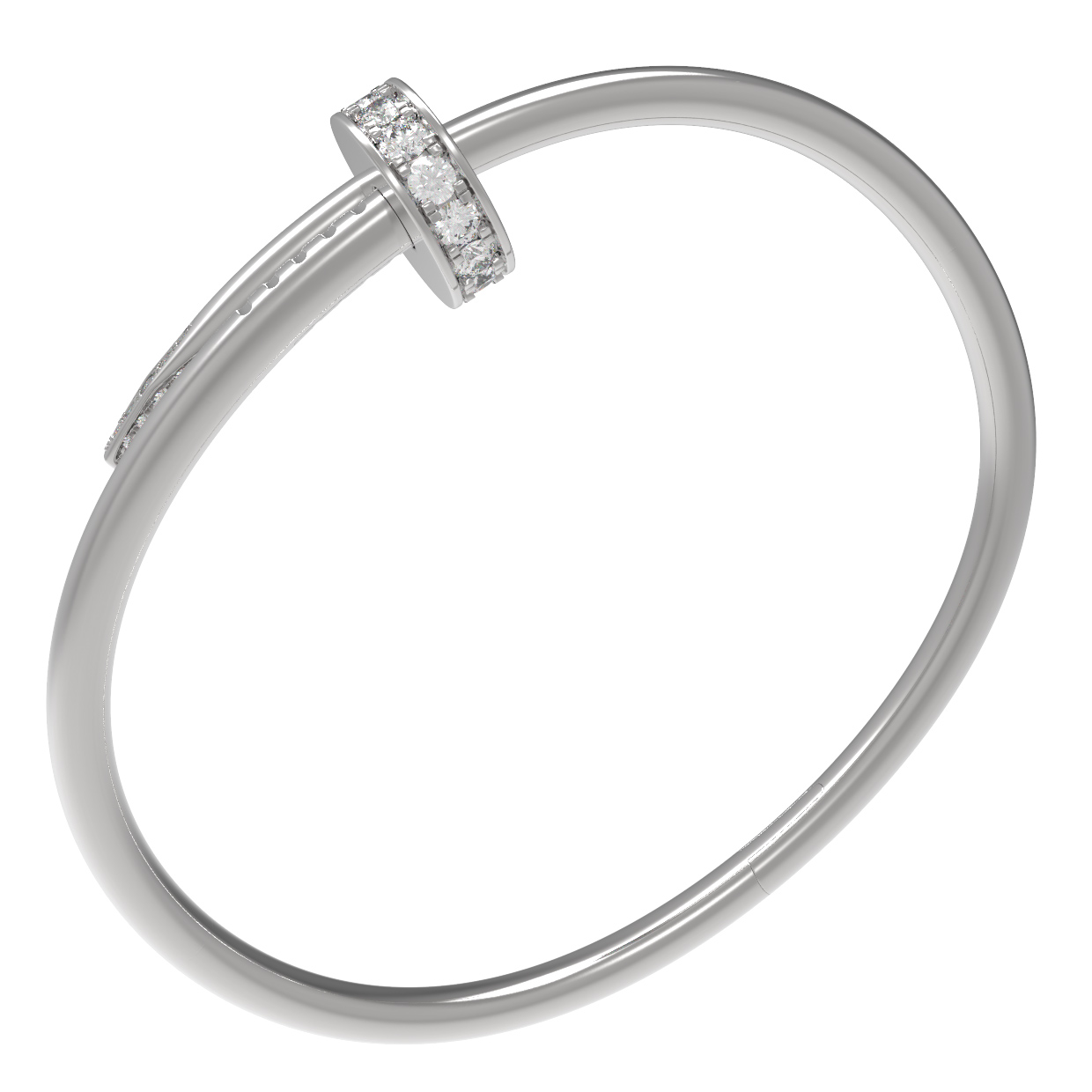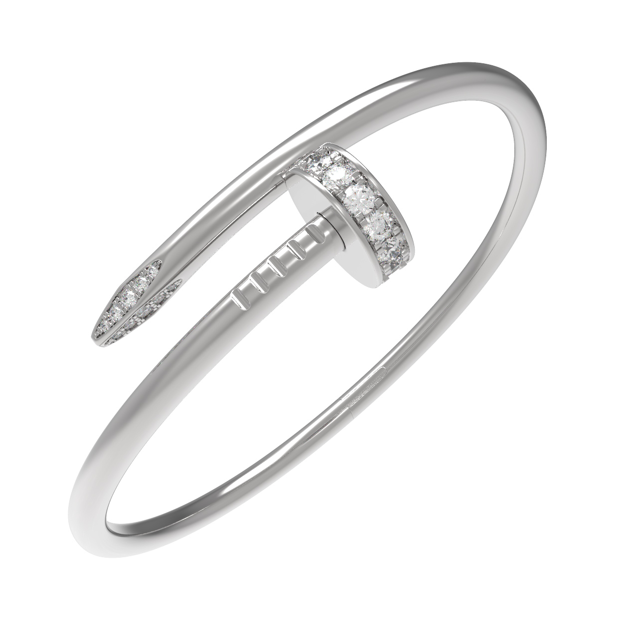 Декор модели дополняют 64 бриллианта круглой огранки с чистым белым цветом, которые эффектно расположены на шляпке и кончике изделия, притягивая взгляды к каждому движению вашей руки. Лаконичная, но выразительная форма браслета делает его универсальным аксессуаром, который гармонично дополнит как повседневный образ, так и вечерний наряд.
