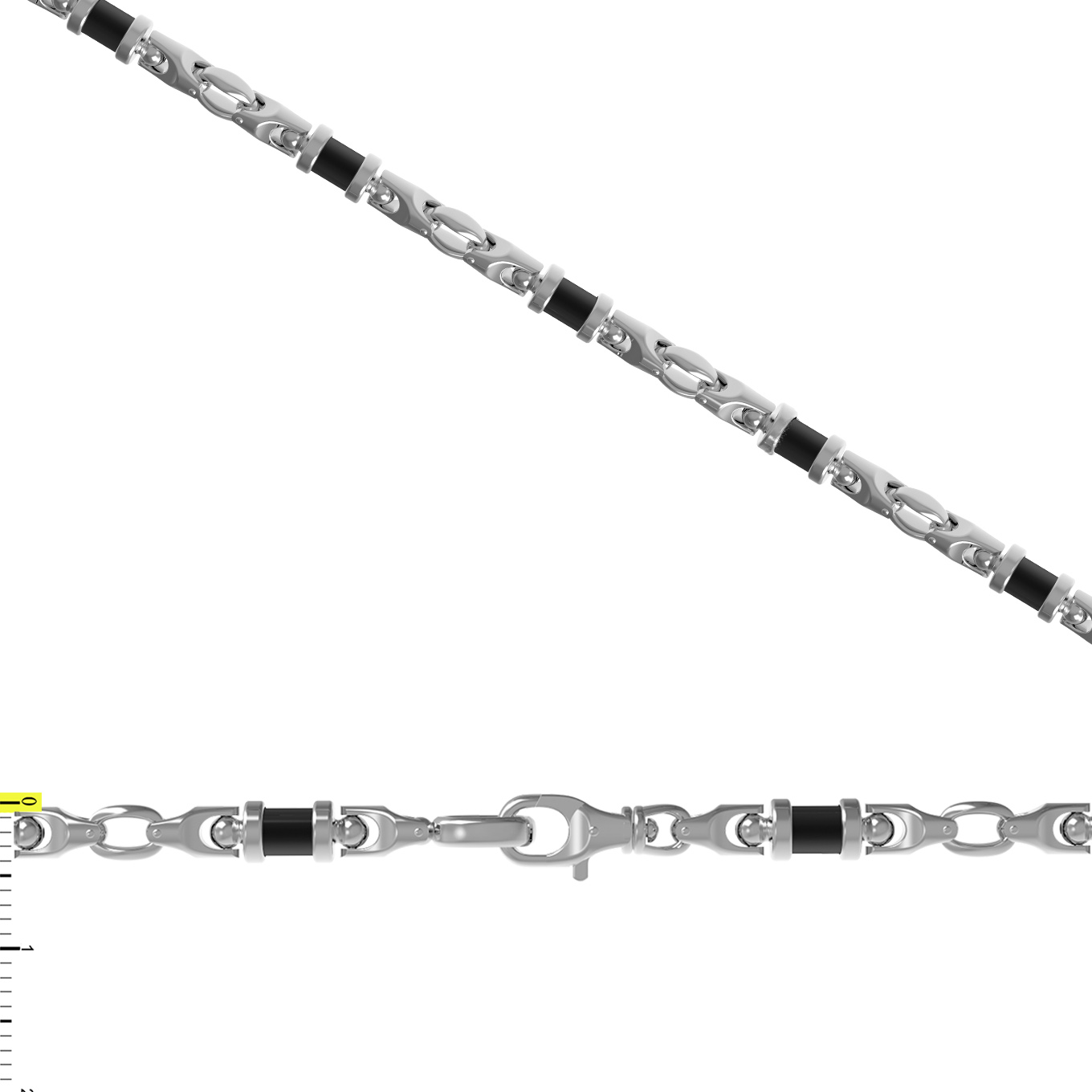 Главная особенность дизайна заключается в гармоничном сочетании золотых звеньев со вставками из черного оникса. 130 вставок, выполненных в форме цилиндра, равномерно распределены по всей длине цепи, создавая ритмичный и строгий рисунок. Глубокий черный цвет оникса эффектно контрастирует с сиянием белого золота, добавляя аксессуару глубины и выразительности.