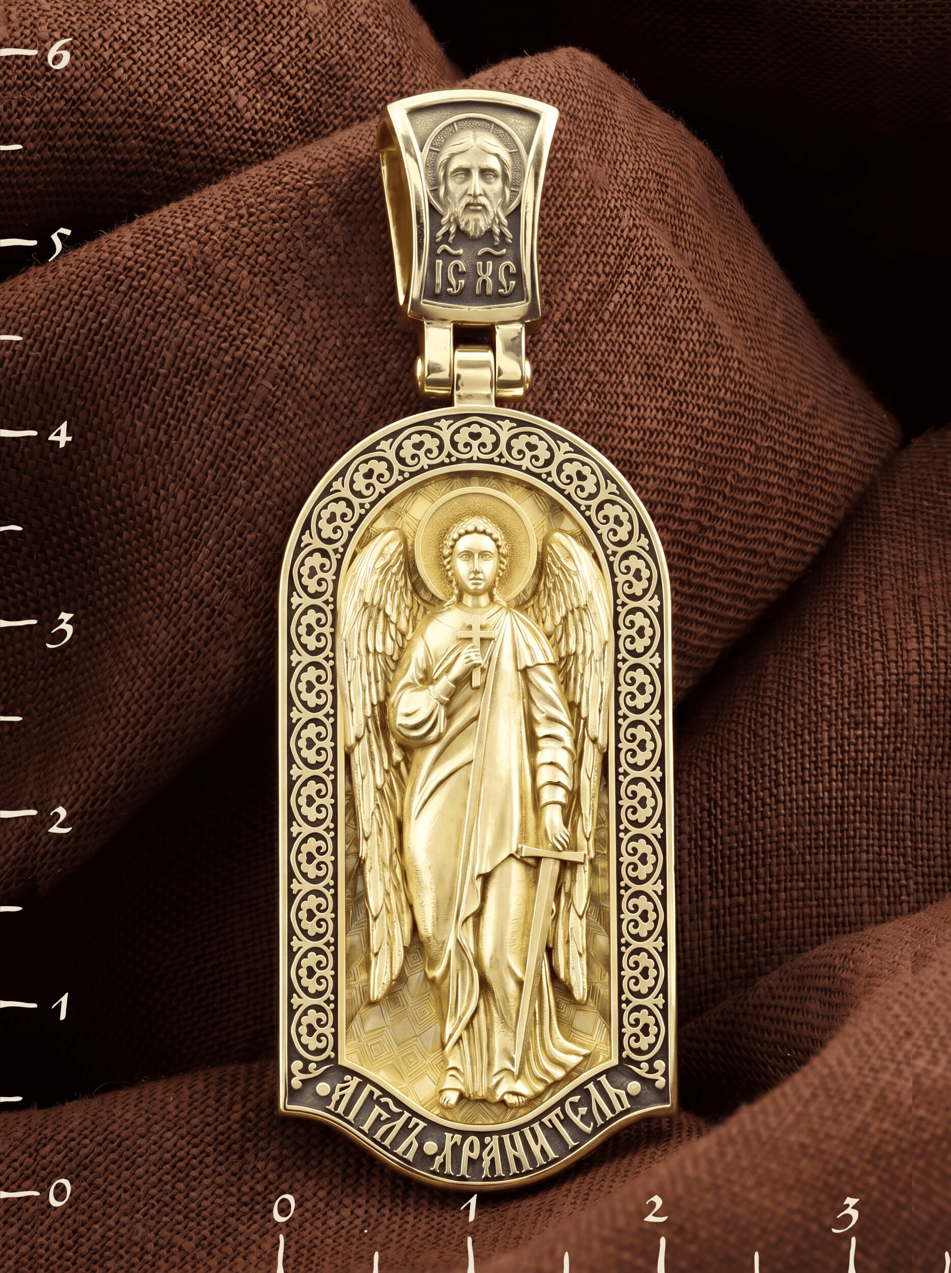 Основой композиции лицевой стороны является Ангела Хранителя. Образок Ангел Хранитель — это не просто украшение, а настоящая миниатюрная икона. В руках Ангел держит традиционные символические атрибуты Ангелов Хранителей: крест — знак послушания Христу и следования Его заповедям, меч — символ непримиримой борьбы, которую он ведет с бесами, отражая их нападения на людей. Слово «ангел» означает «вестник». Ангелы — верные служители Божьи, которых Господь посылает возвещать Свои повеления. Ангелы тварны, как и люди, но имеют другую природу. На иконах они изображаются в человеческом обличье с большими крыльями. Могучие крылья ангелов символизируют быстроту, с которой они исполняют повеления Бога, а небольшие ленточки у ушей –тороки, или слухи — показывают, что они всегда слышат Его голос.