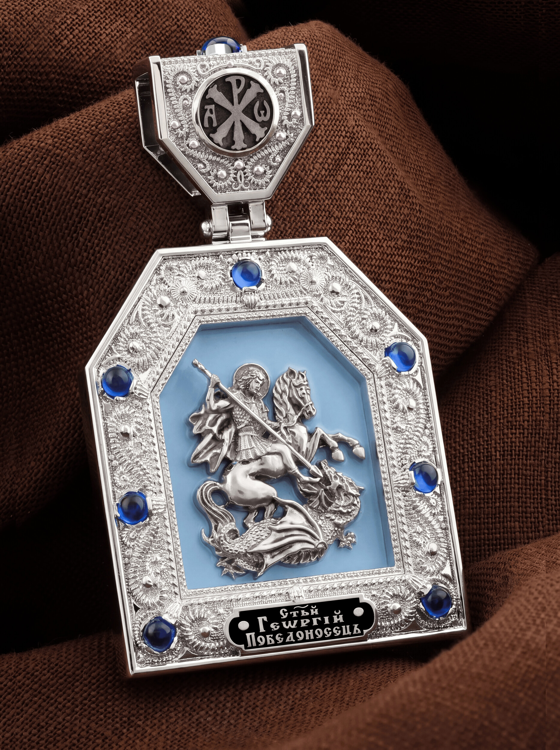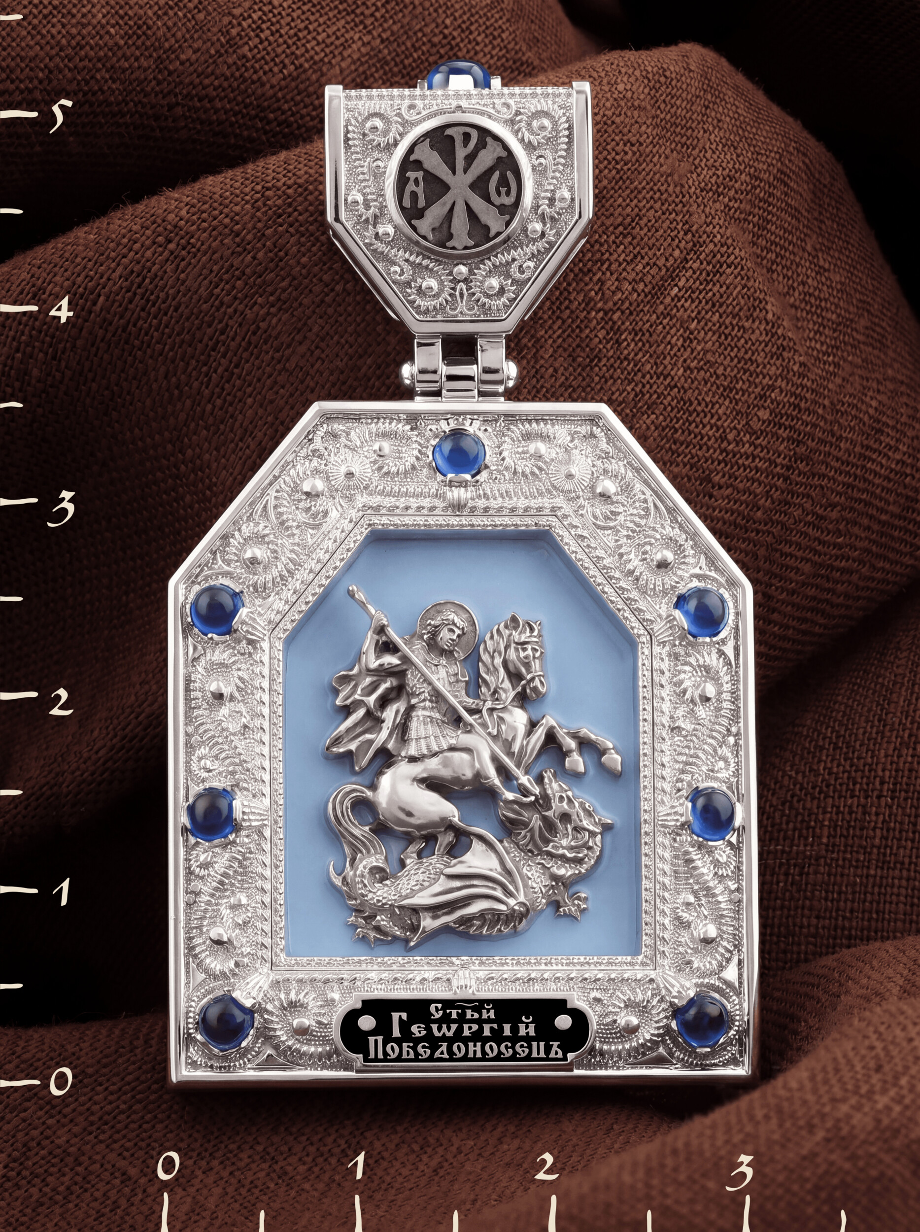 Основой композиции лицевой стороны образка является изображение Святого Великомученика Георгия Победоносца — одного из самых почитаемых и удивительных святых. На Руси он известен как Юрий или Егорий, покровитель воинов, помощник в крестьянском труде. На образке он изображен как воитель, сидящий на вздыбленном коне и поражающий копьем огнедышащего змея. Змей символизирует собою сатанинские силы. Молитвами вознесенными к Всевышнему и своей непреклонной верой он смог одолеть чудовище. Святой убил змея, спас царскую дочь, принесенную в жертву, и жителей города, их души от влияния дьявола, породив в них надежду и веру в Господа, призывая людей принять христианскую веру.