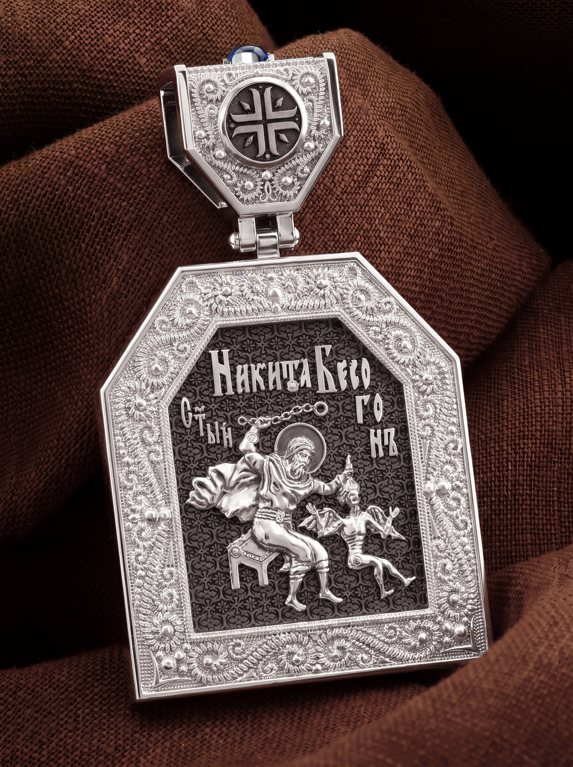 В центре оборотной стороны полноростовое изображение святого мученика Никиты, изгоняющего беса. Левой рукой святой держит беса за волосы (уши), а правая в замахе с палицей для удара. Бес находится в положении полусидя, на колене. За плечами мученика виден широкий плащ. Вокруг композицию украшает арка с точечным узором, заключённая в прямоугольную рамку. Бортик содержит украшения в виде широких витиеватых линий, расположенных слева, справа и вверху. Так же присутствует надпись: “ СВЯТОЙ НИКИТА БЕСОГОН.».