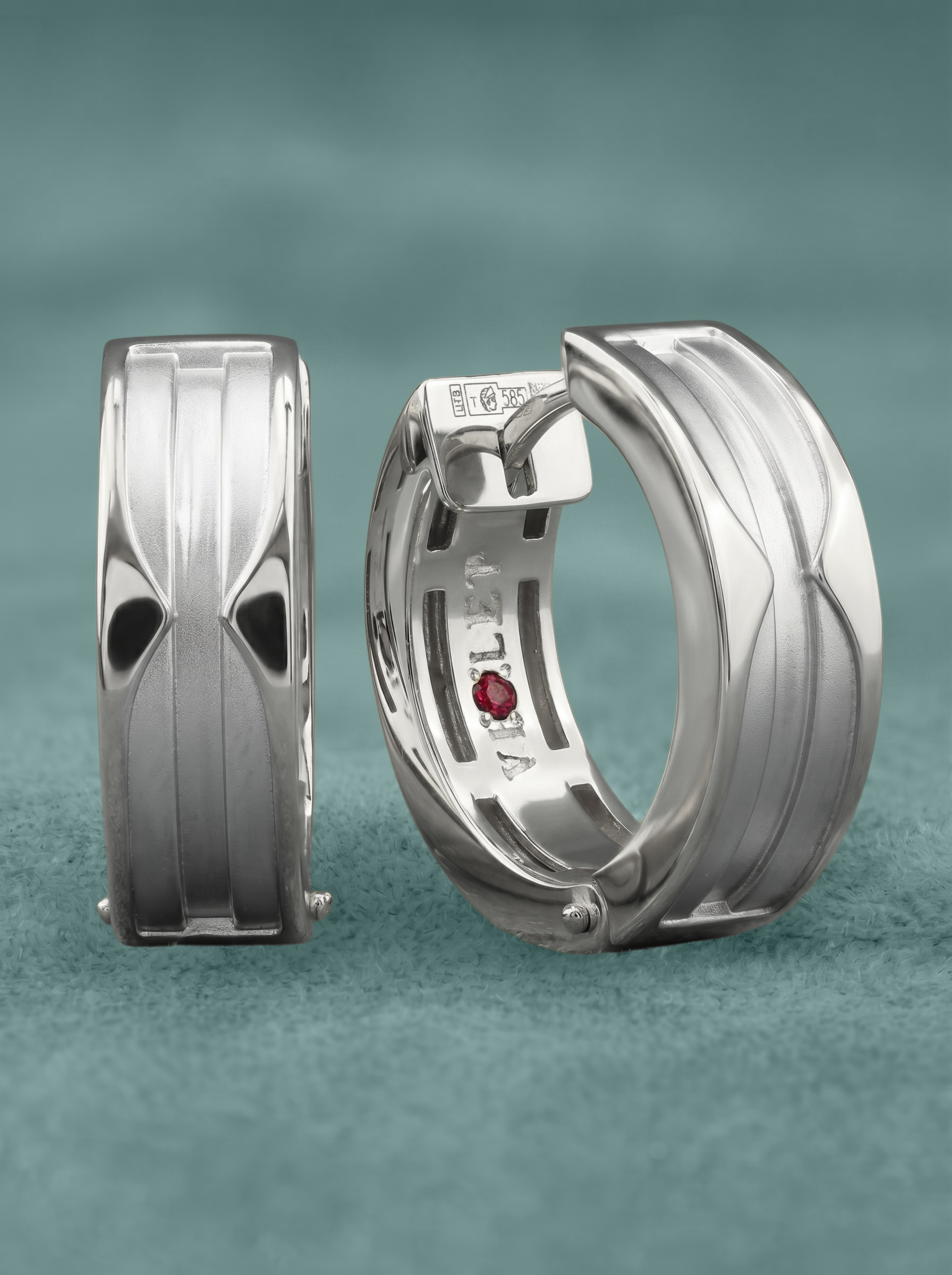 Особую выразительность модели придает вставка: два рубина круглой формы насыщенного красного цвета. Эти драгоценные камни, скрытые внутри конструкции, добавляют украшению глубины и загадочности, создавая эффектный контраст с холодным сиянием белого золота. Тщательно проработанная фактура поверхности подчеркивает статус изделия и его высокое качество исполнения.