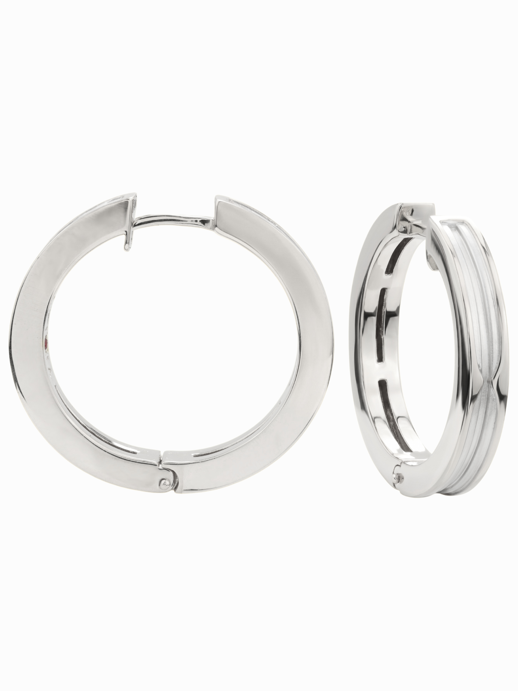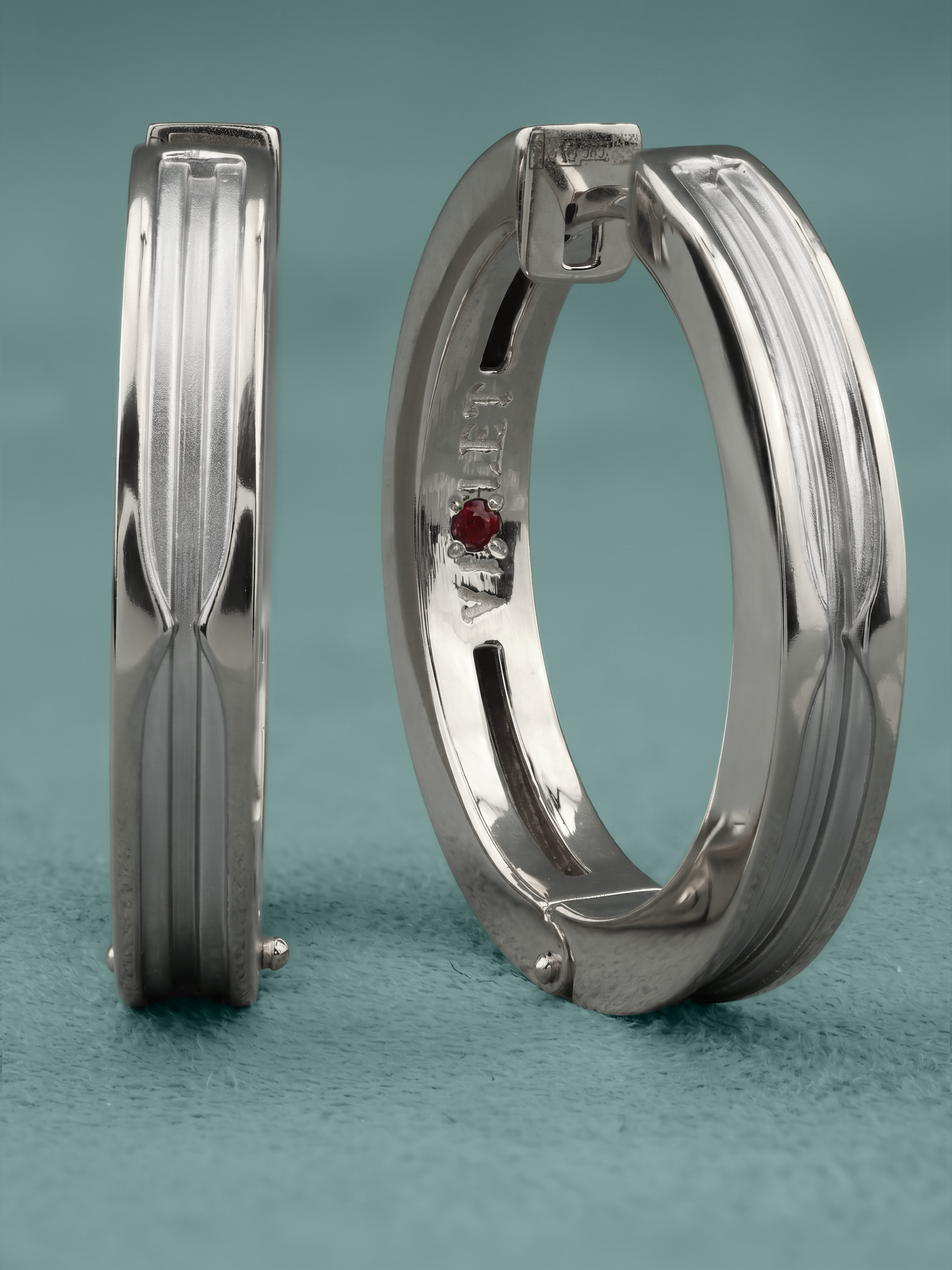 Особую выразительность дизайну придает скрытая деталь: внутри каждого изделия расположена вставка из драгоценного рубина. Камень круглой формы обладает насыщенным красным цветом, создавая изысканный контраст со строгим белым золотом. Использование двух рубинов в комплекте добавляет изделию таинственности и делает его отличным выбором для тех, кто ценит эстетику минимализма с акцентом на детали.