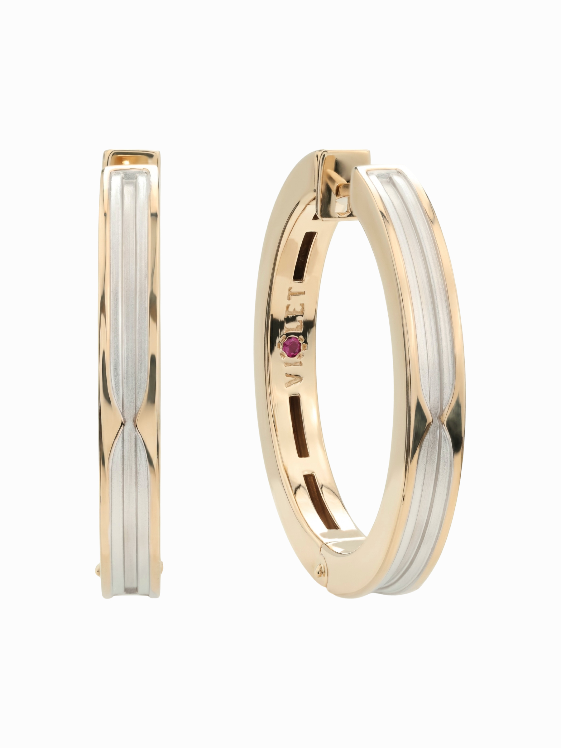 Особую выразительность украшению придает вставка: каждый аксессуар дополнен рубином насыщенного красного цвета. Форма вставок — круг, что идеально гармонирует с мягкими линиями самих серег. Всего в изделии использовано 2 вставки, которые деликатно вписаны в конструкцию, создавая акцент, заметный лишь при близком рассмотрении. Это делает украшение не только статусным, но и интригующим.