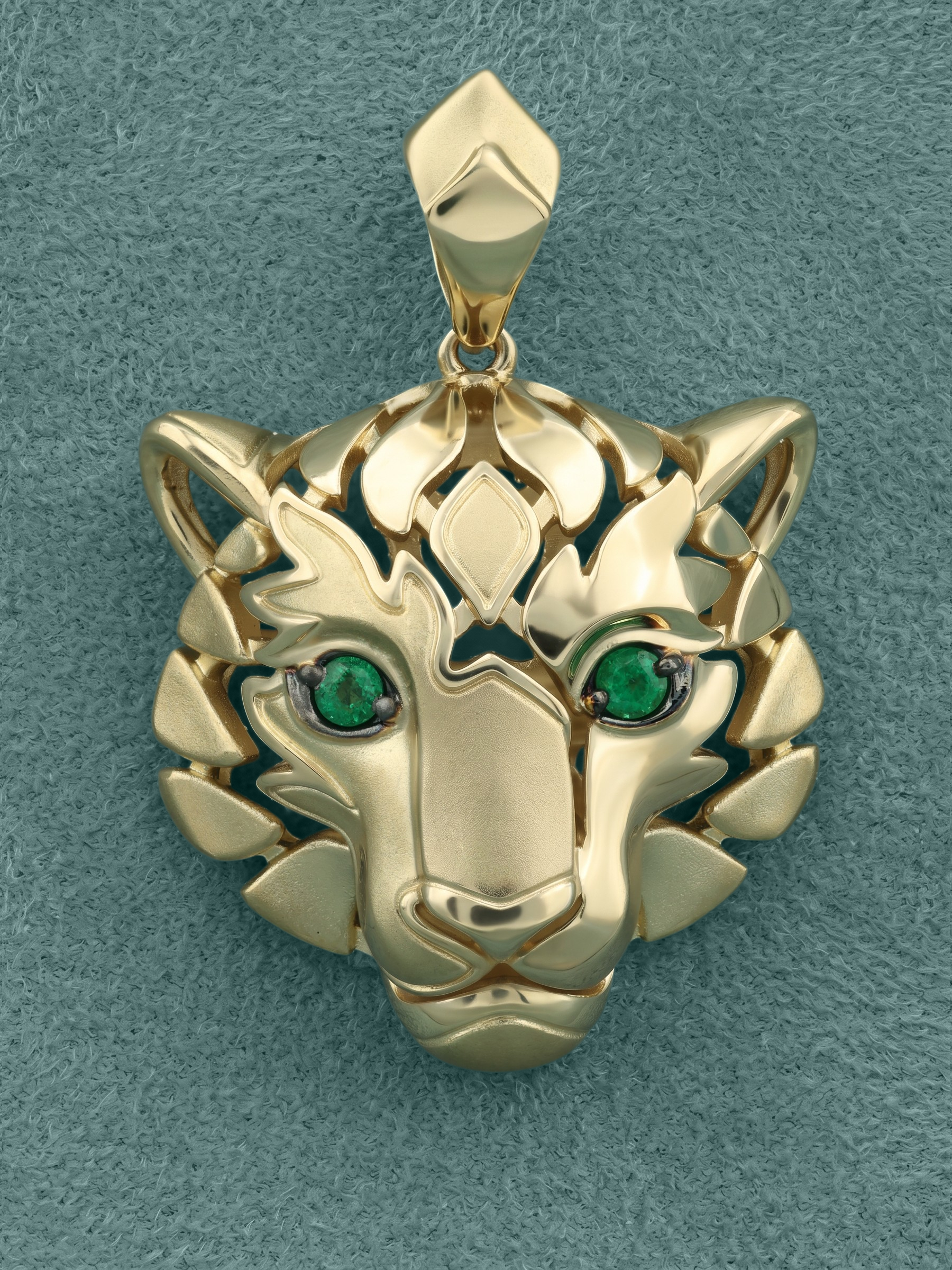 Центральным элементом композиции стали глаза хищника, инкрустированные двумя изумрудами круглой формы. Насыщенный зелёный цвет вставок в сочетании с теплым оттенком драгоценного металла придает изделию особое очарование и глубину. Гармоничные линии и проработанные детали позволяют подвеске выглядеть объемно и эффектно на любом типе цепи.