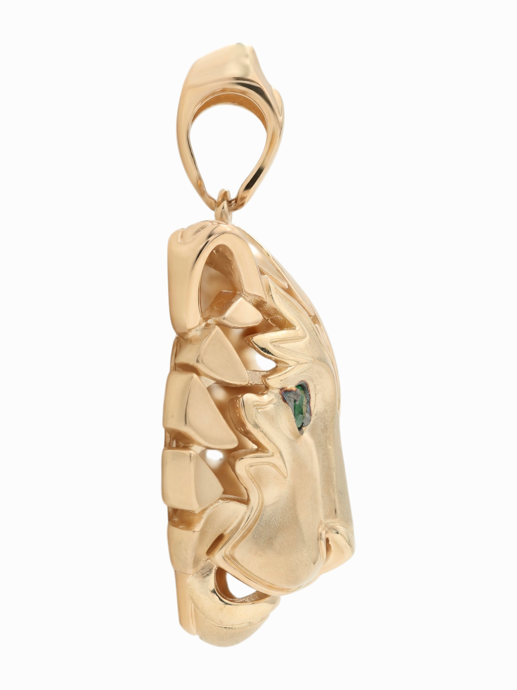 Взгляд хищника притягивает внимание благодаря двум глубоким изумрудам зеленого цвета круглой формы. Контраст между насыщенным цветом камней и сиянием красного металла делает этот аксессуар по-настоящему притягательным. Эта подвеска гармонично дополнит как повседневный, так и вечерний стиль, подчеркивая индивидуальность владельца.