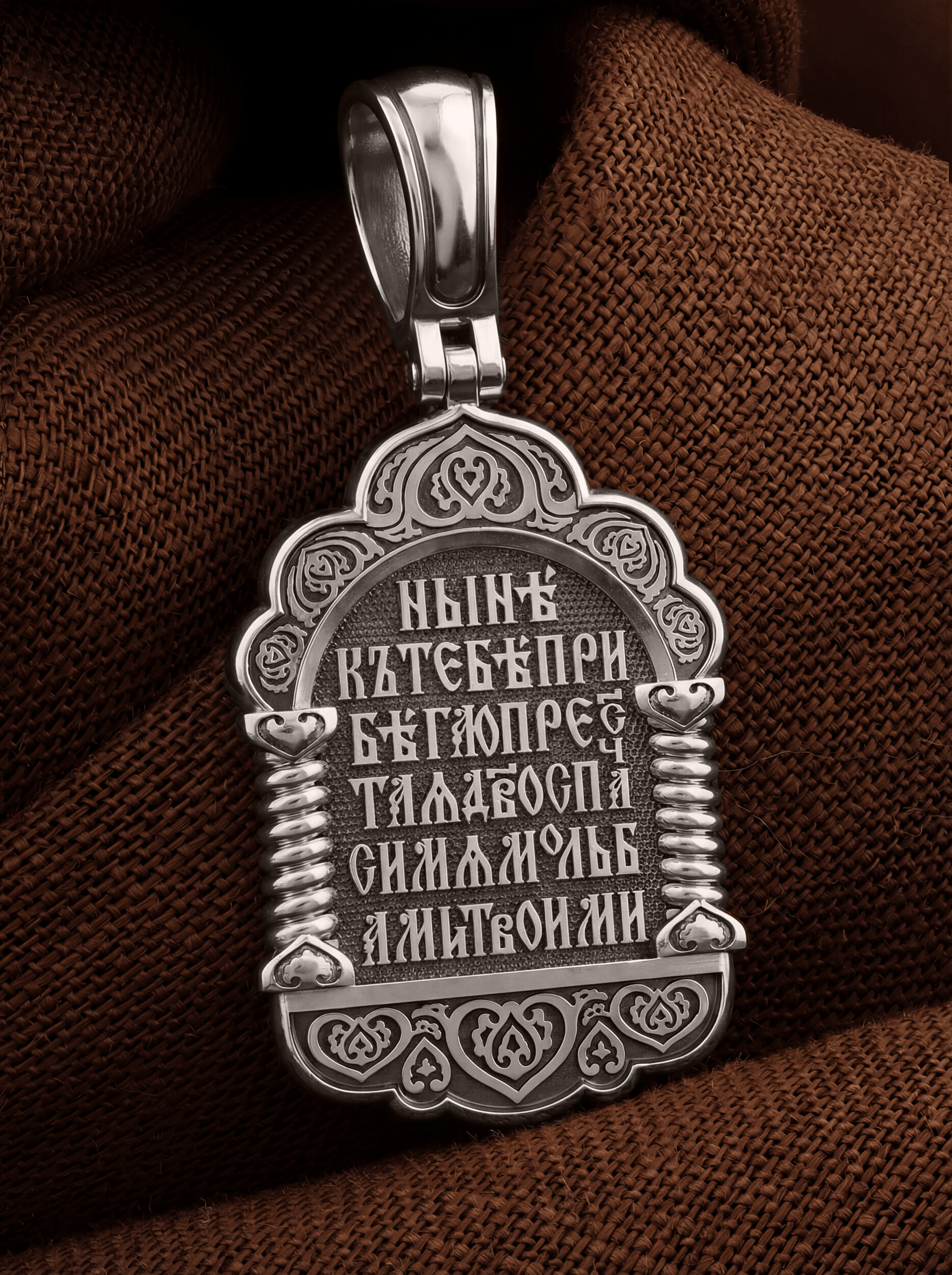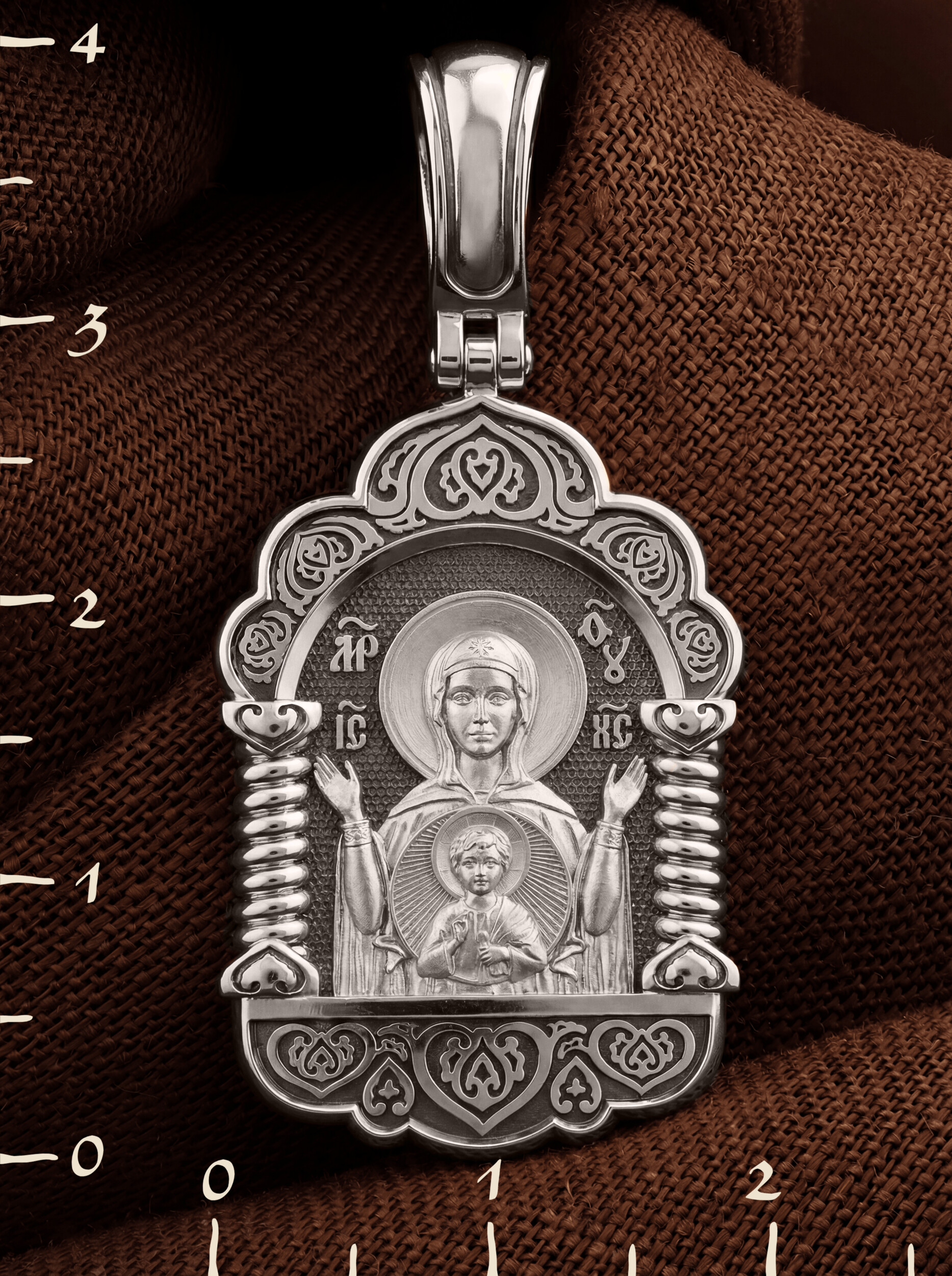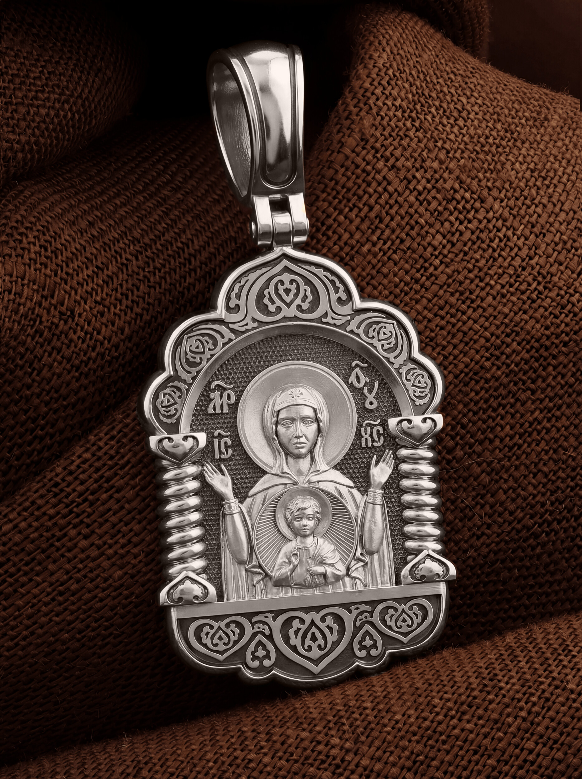 В центр образка помещен образ Божией Матери «Знамение», прославившийся многими чудесами в Новгороде в XII веке. Икона эта чтится как одна из самых великих святынь Русской земли. Молитвенно воздетые руки Богородицы означают заступничество за людей пред Богом. Рядом с Ней, на фоне круглого щита, — благословляющий Божественный Младенец — Спас-Эммануил.